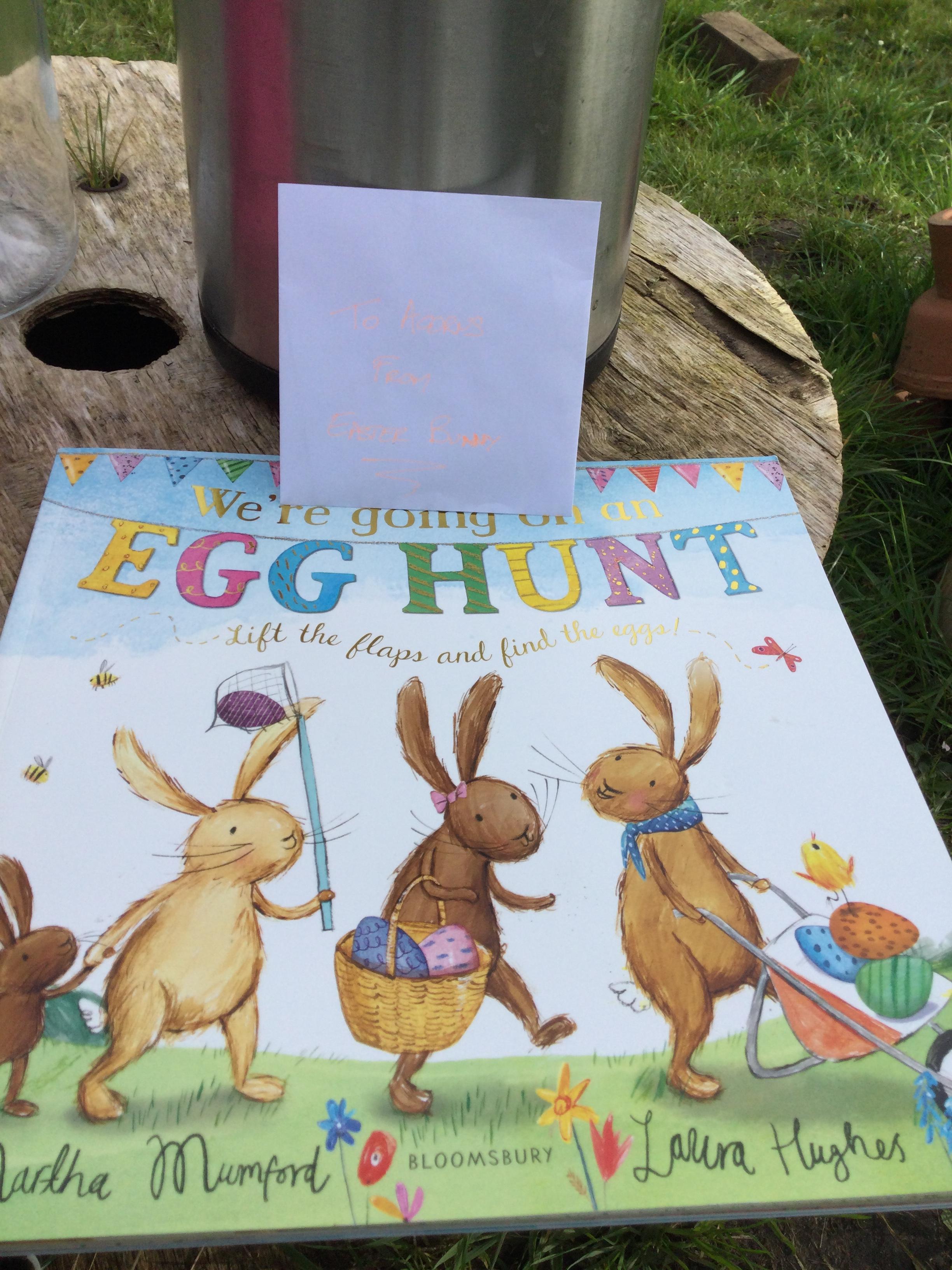 For our final session before Easter, we were fortunate! The Easter Bunny, aware of our fantastic Forest School sessions, left gifts and a message for us. He gifted us the story "We're Going on an Egg Hunt" and some chocolate eggs scattered around our Forest School site. After reading together, we embarked on an Easter egg hunt in the allotment. Each child enjoyed one chocolate egg alongside their healthy snack, and took another one home.