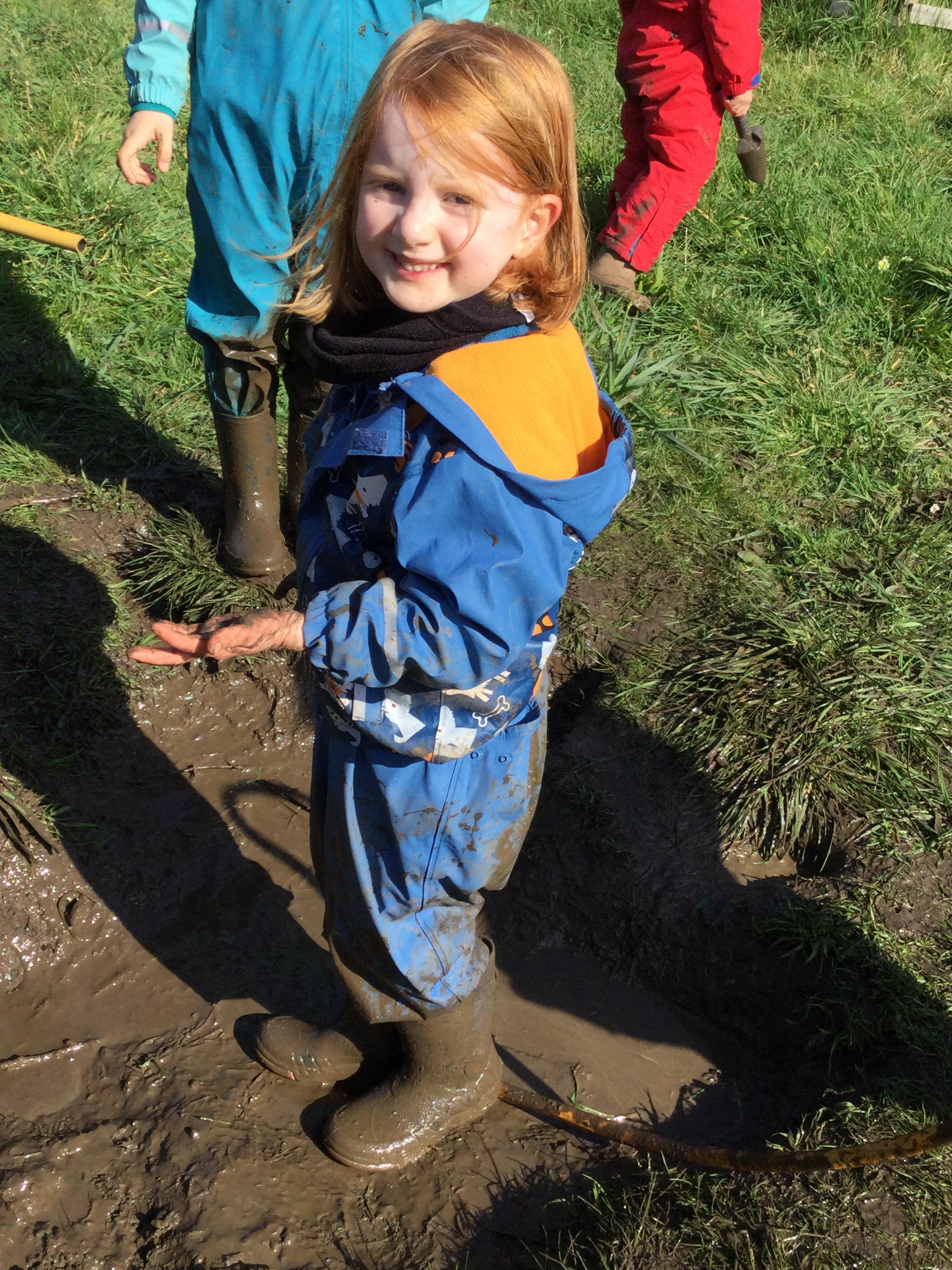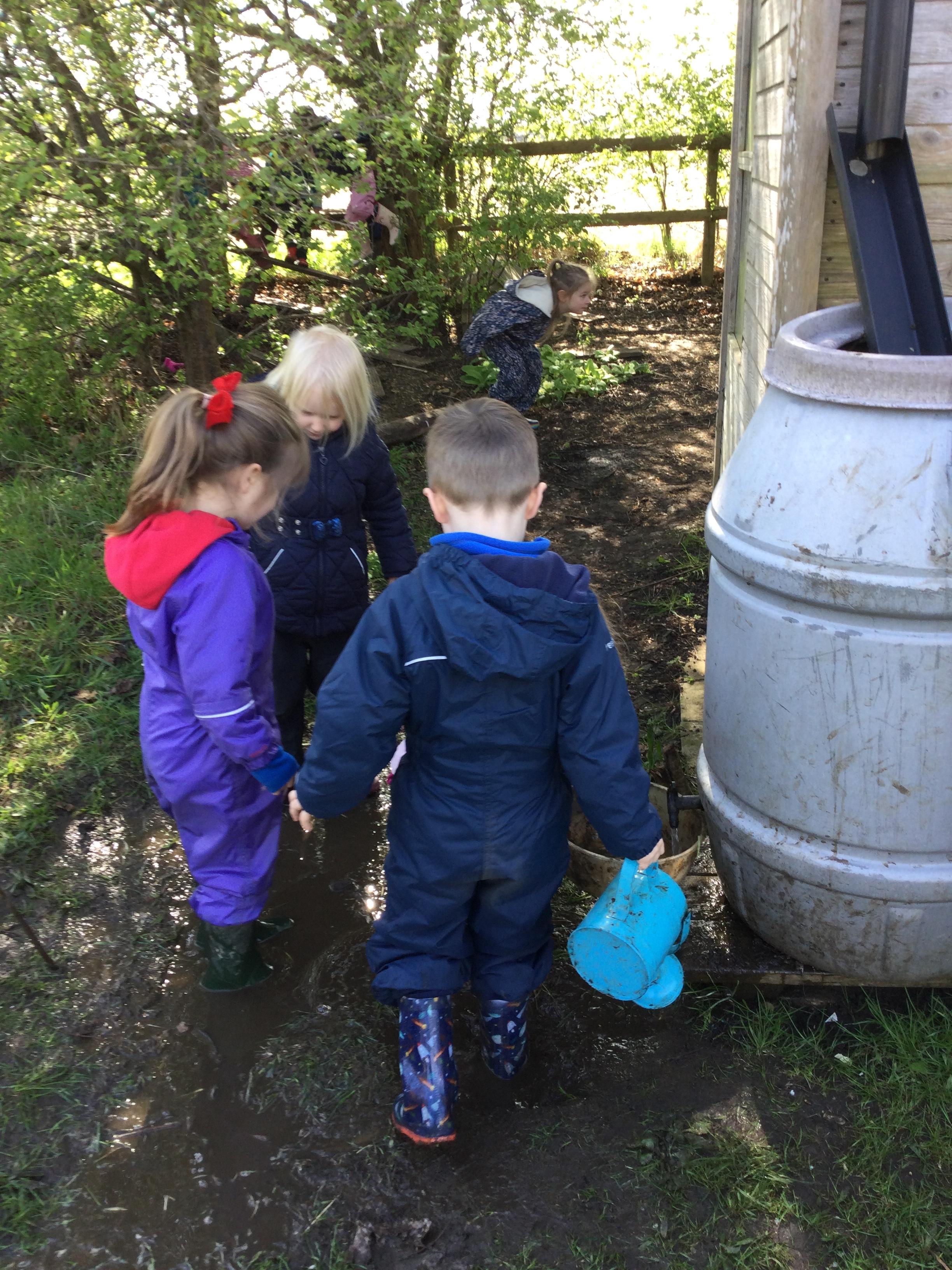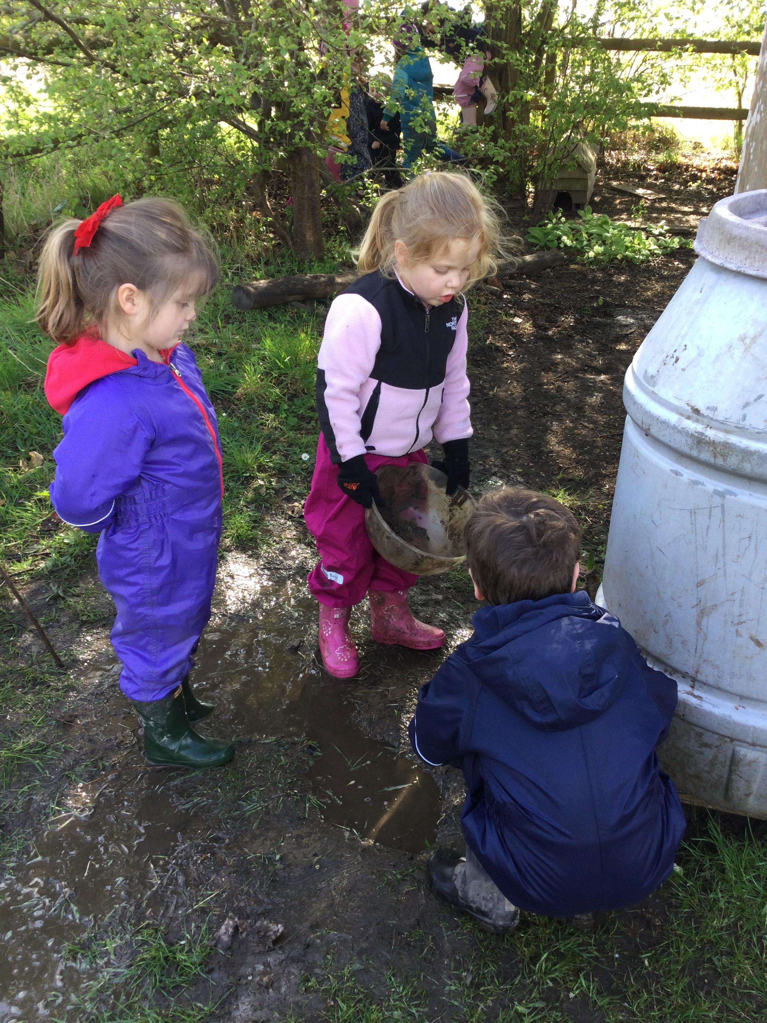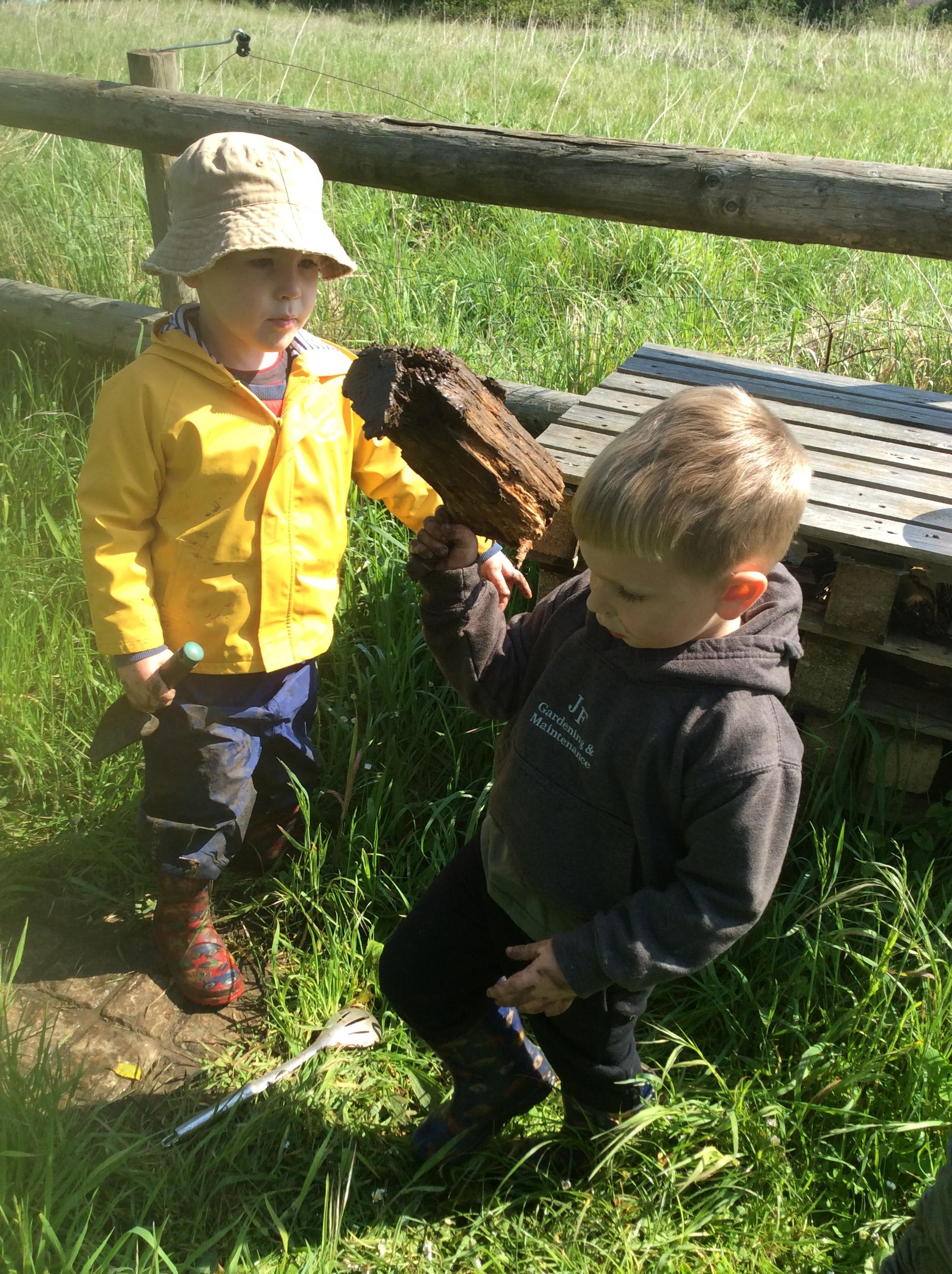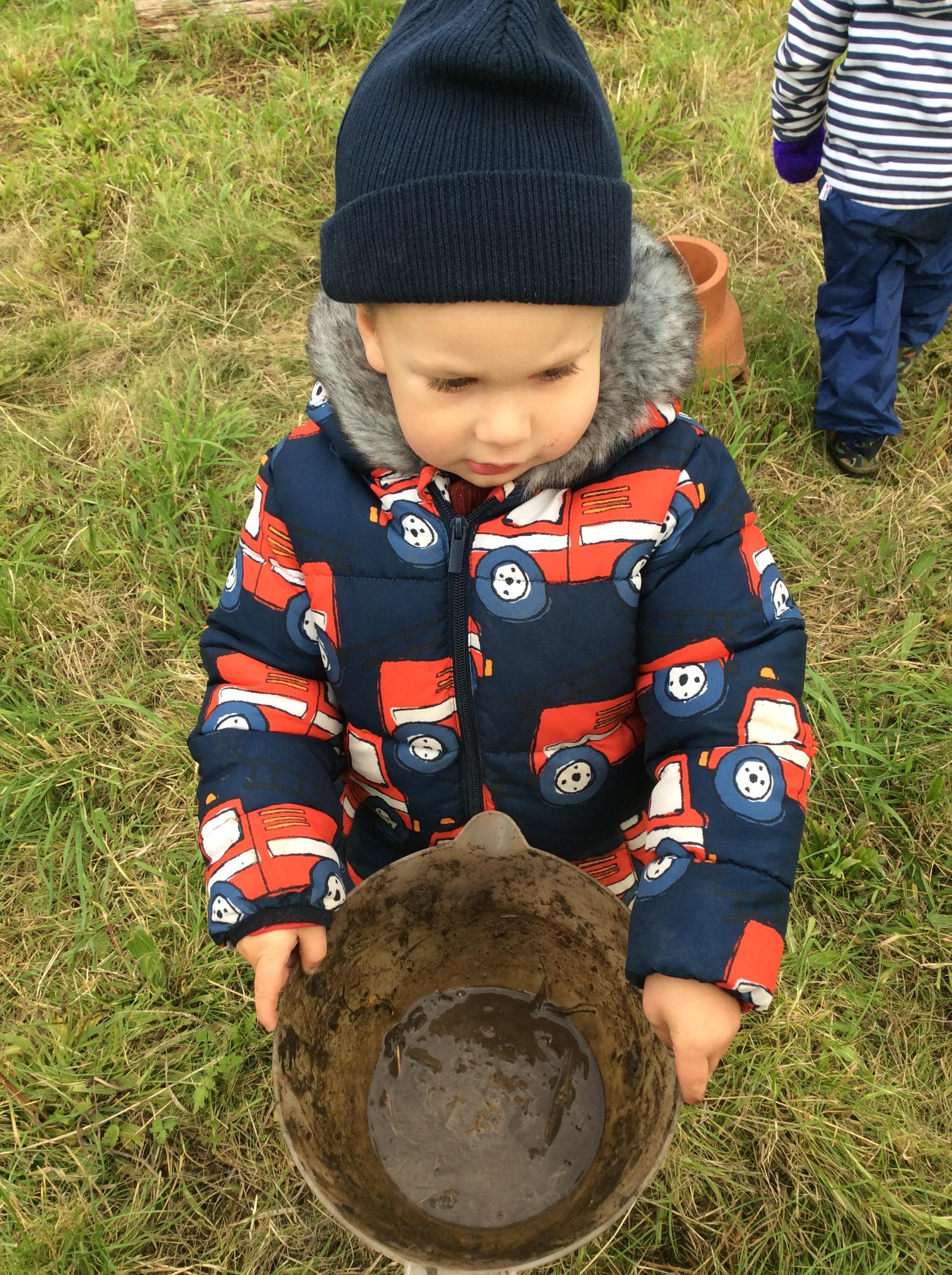 This term, Little and Big Acorns have enjoyed cooking over the fire as well as experimenting with mud. Rainy days and the water tank have provided ample opportunities for mud play. The children dug a small pond at the bottom of the allotment and relished jumping into it. Transporting water from the tank to the pond required focus and teamwork, and taking turns to jump in demanded patience.