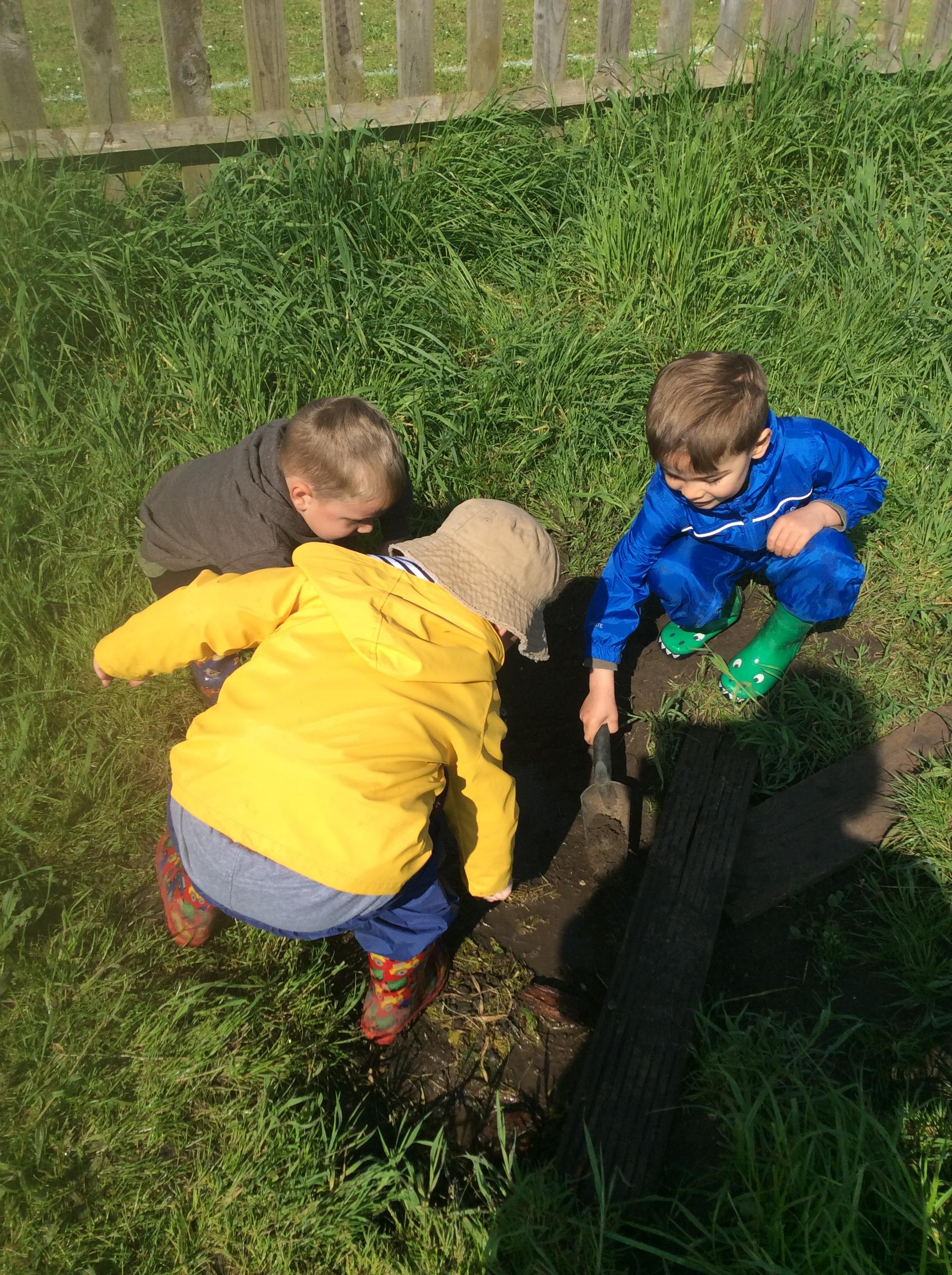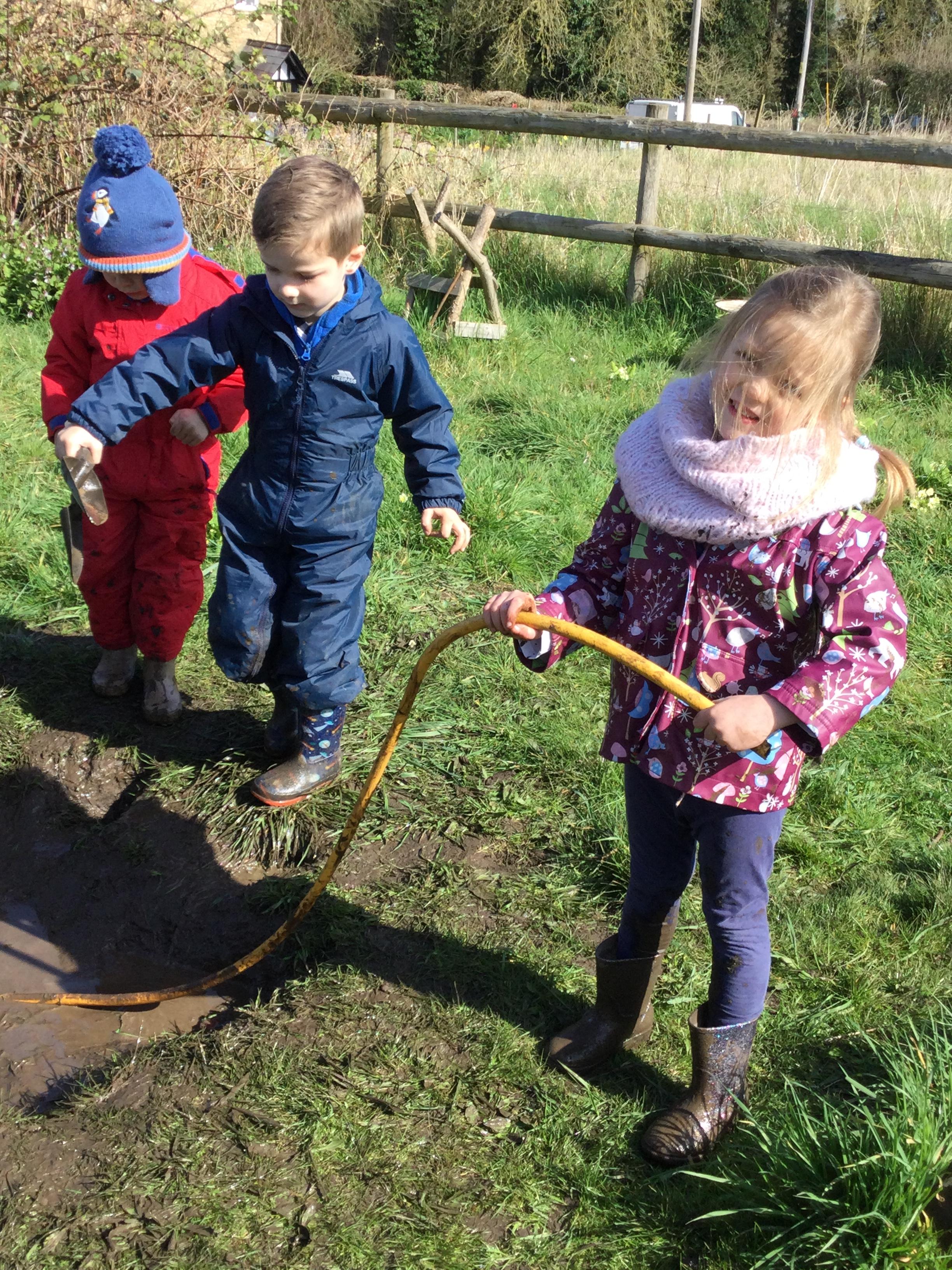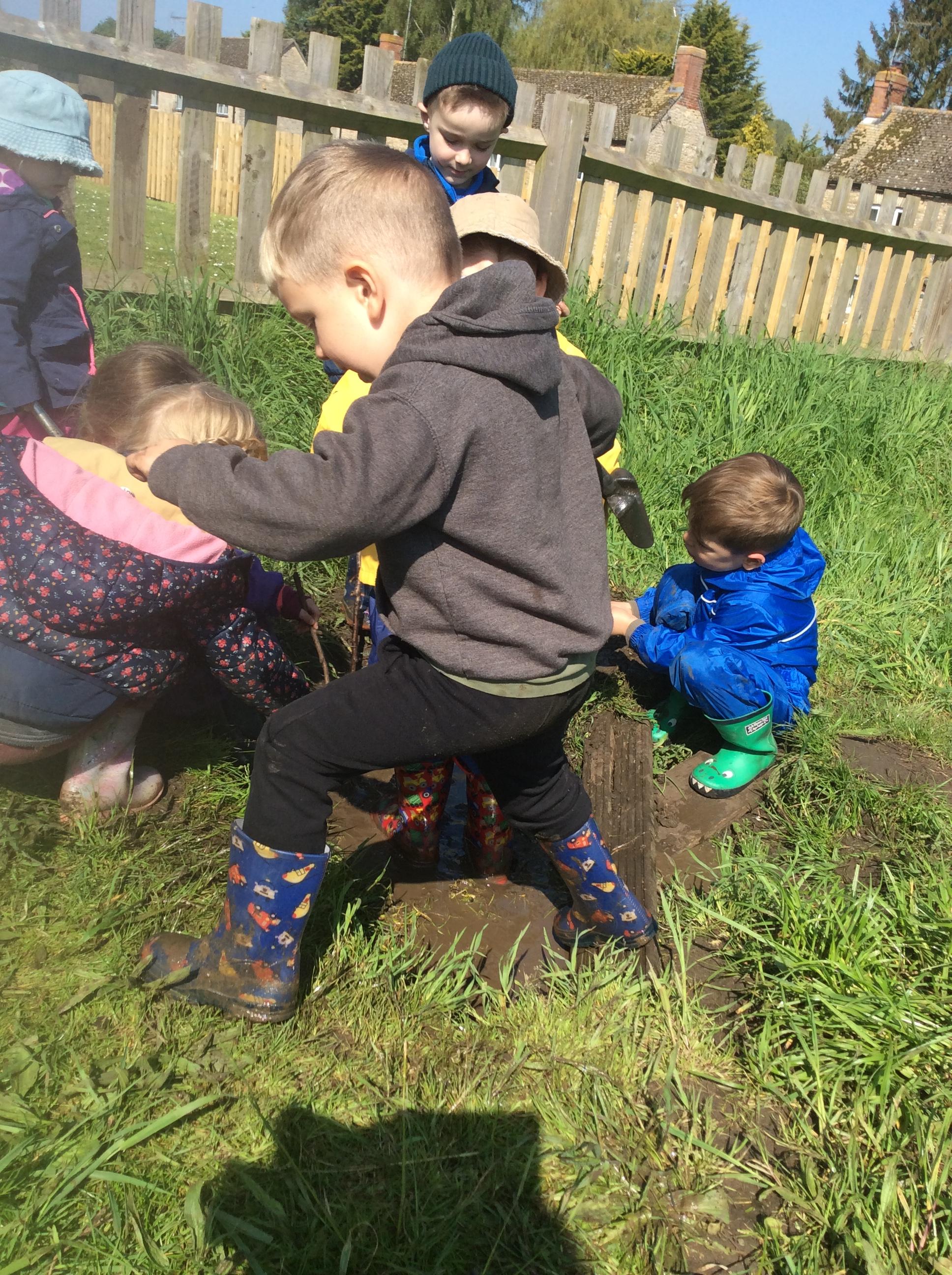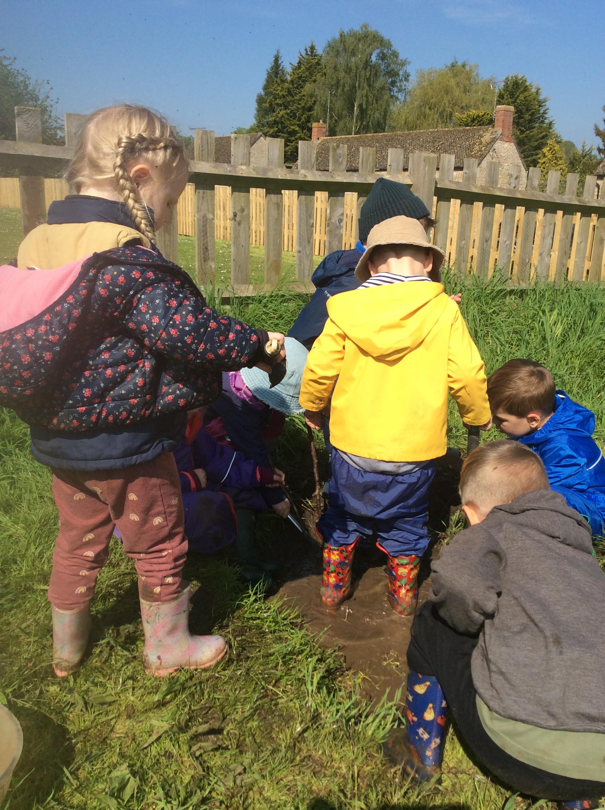 This term, Little and Big Acorns have enjoyed cooking over the fire as well as experimenting with mud. Rainy days and the water tank have provided ample opportunities for mud play. The children dug a small pond at the bottom of the allotment and relished jumping into it. Transporting water from the tank to the pond required focus and teamwork, and taking turns to jump in demanded patience.