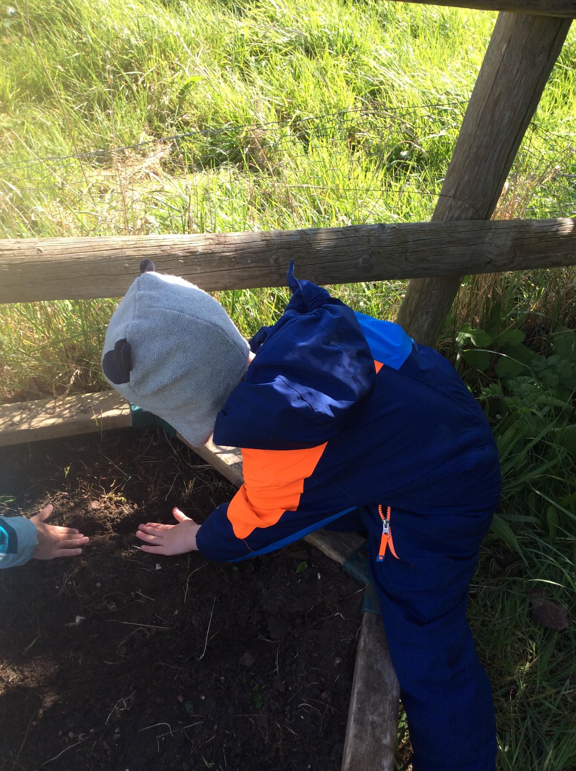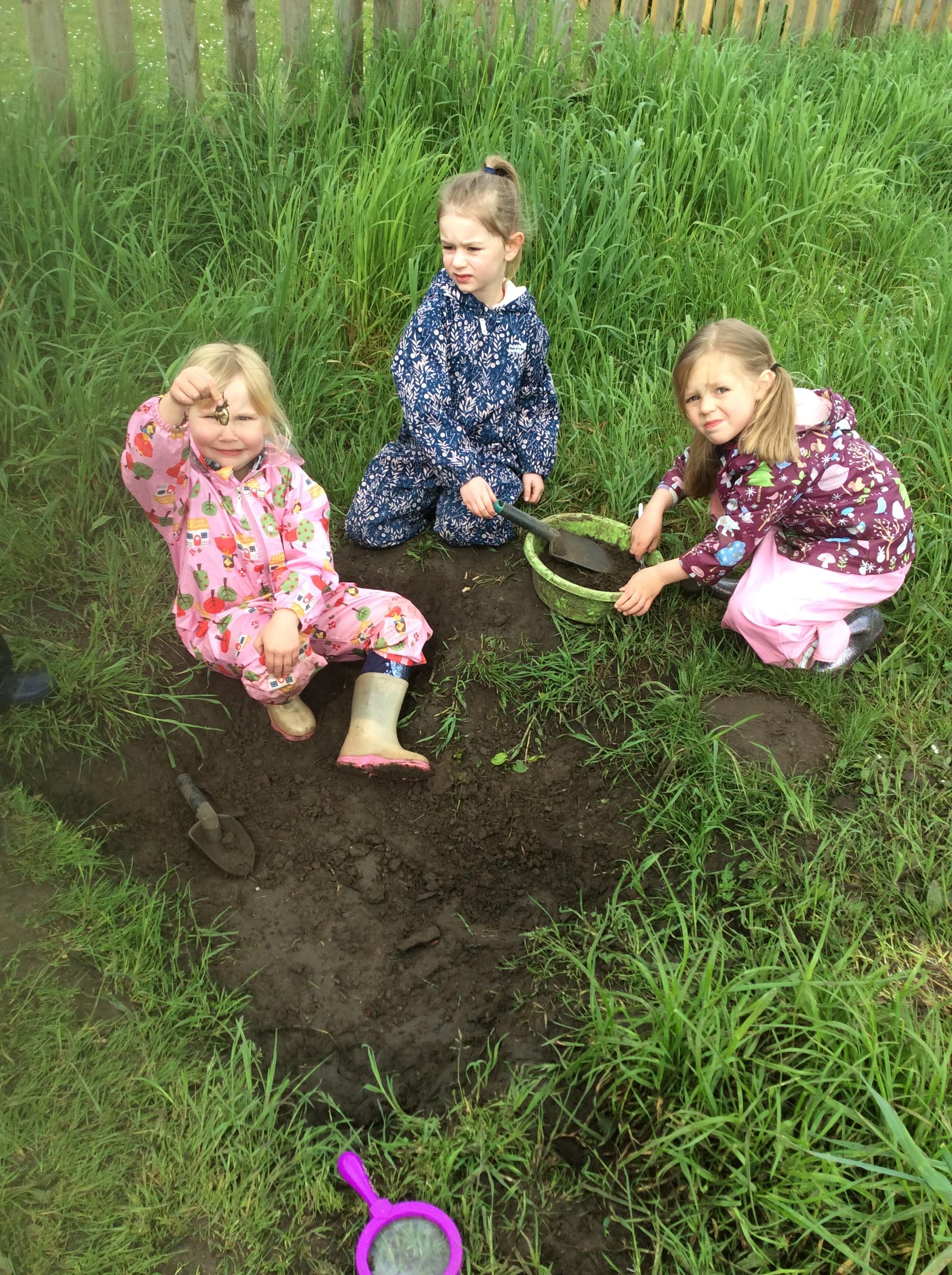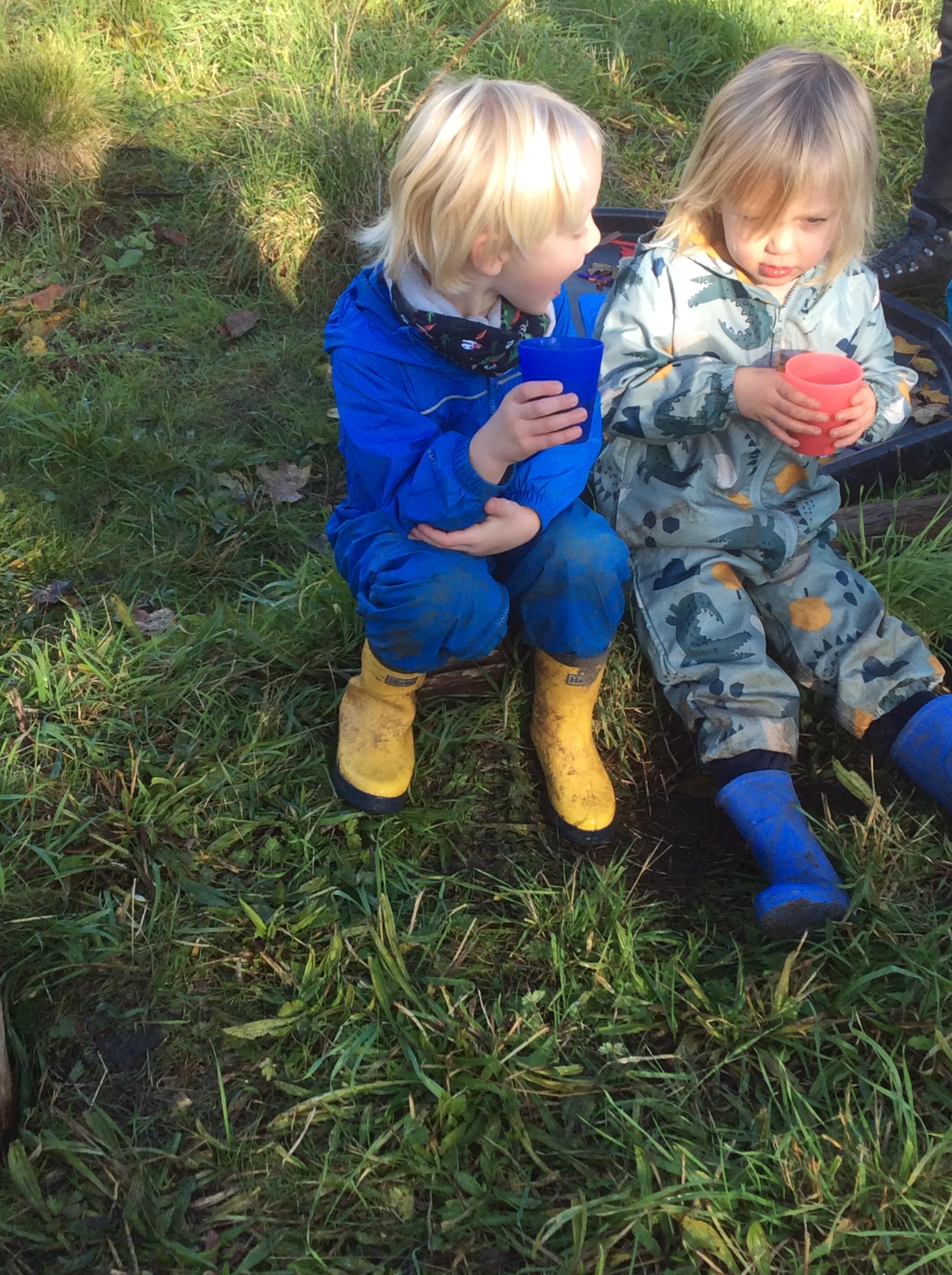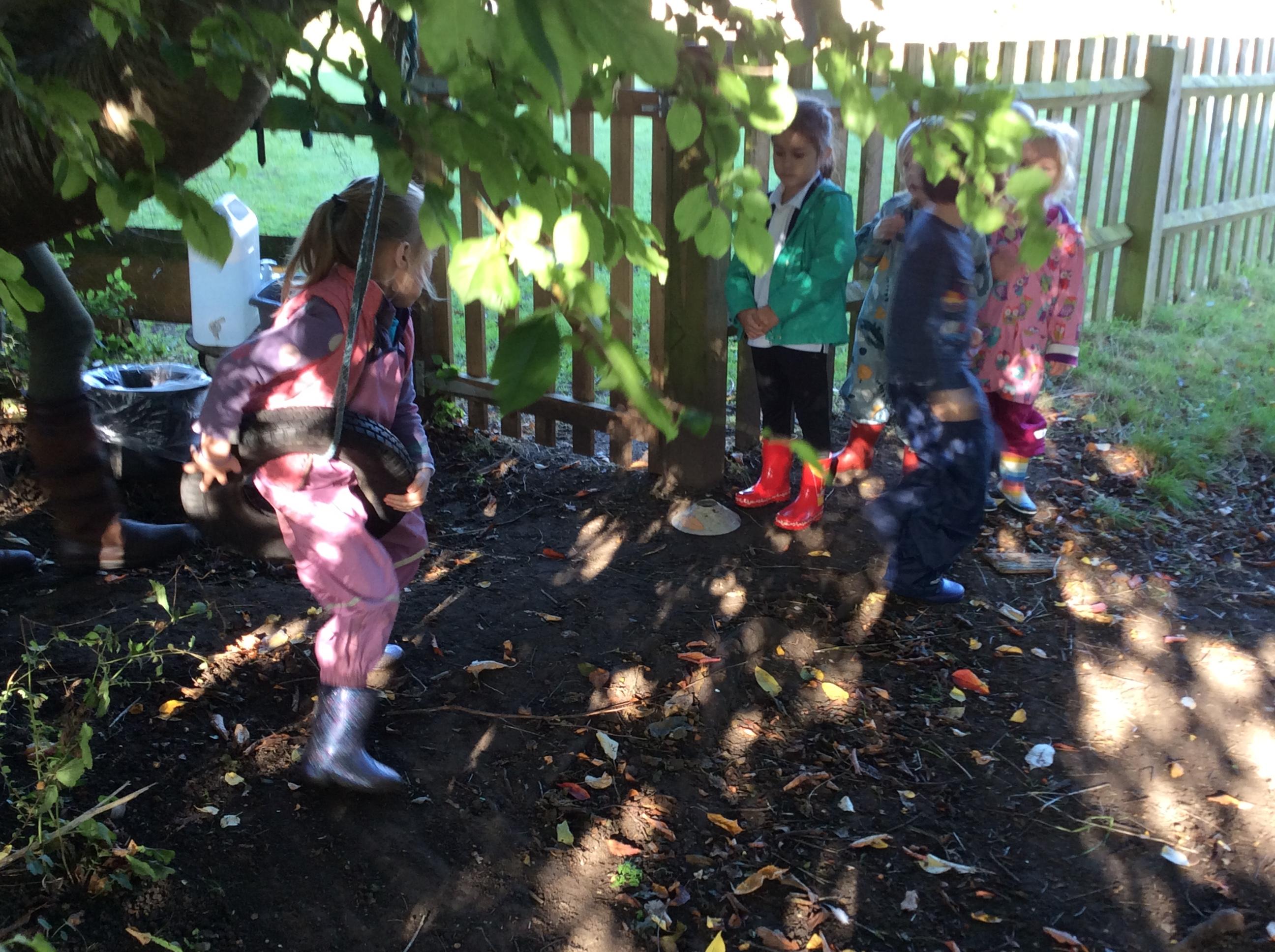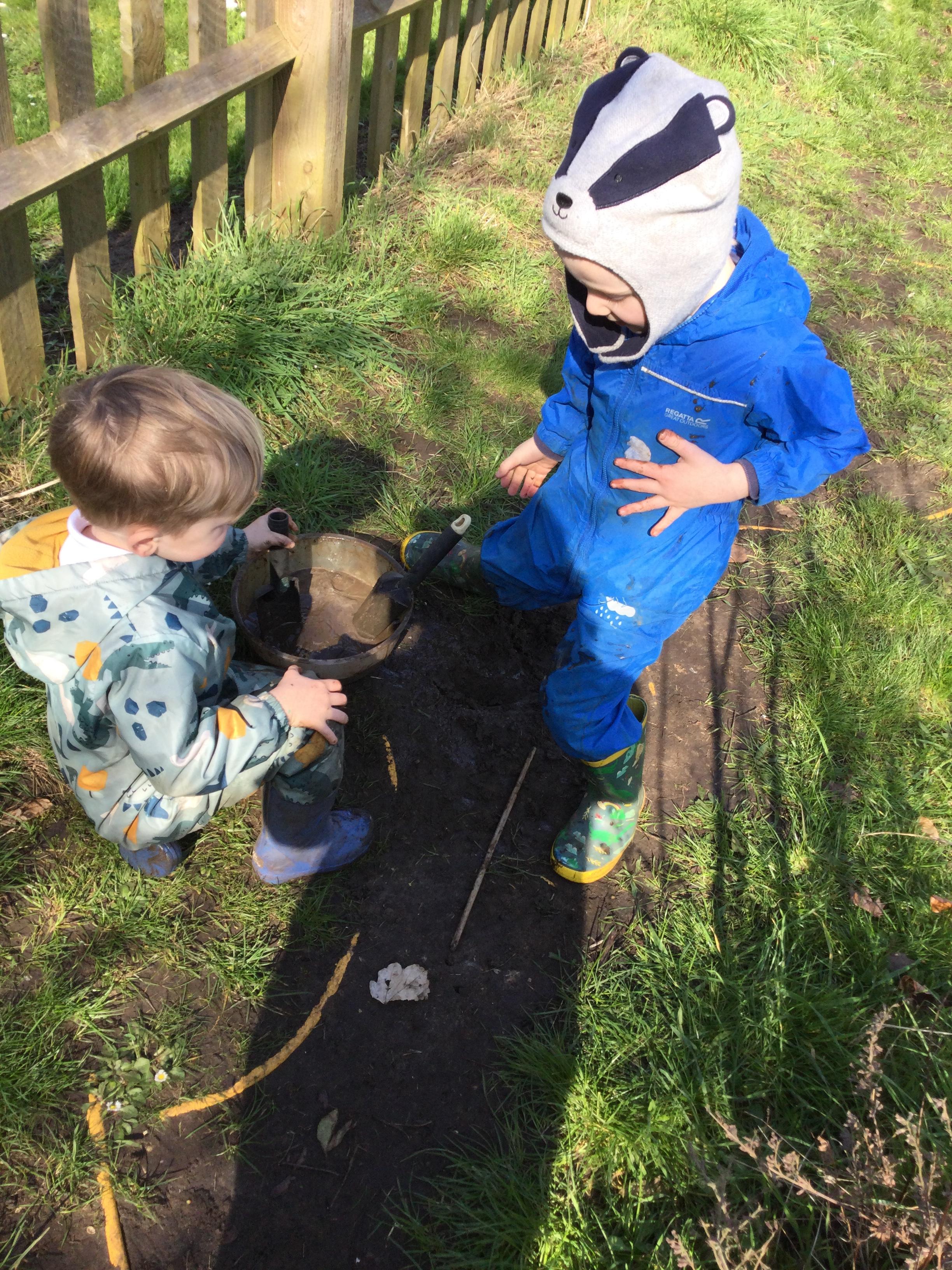 This term, Little and Big Acorns have enjoyed cooking over the fire as well as experimenting with mud. Rainy days and the water tank have provided ample opportunities for mud play. The children dug a small pond at the bottom of the allotment and relished jumping into it. Transporting water from the tank to the pond required focus and teamwork, and taking turns to jump in demanded patience.