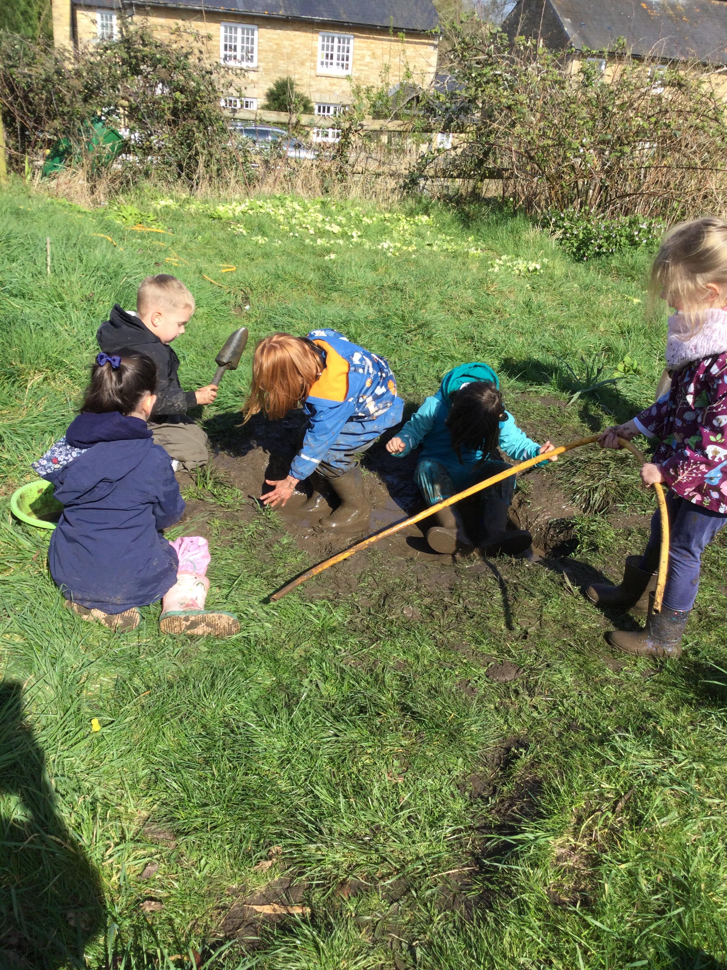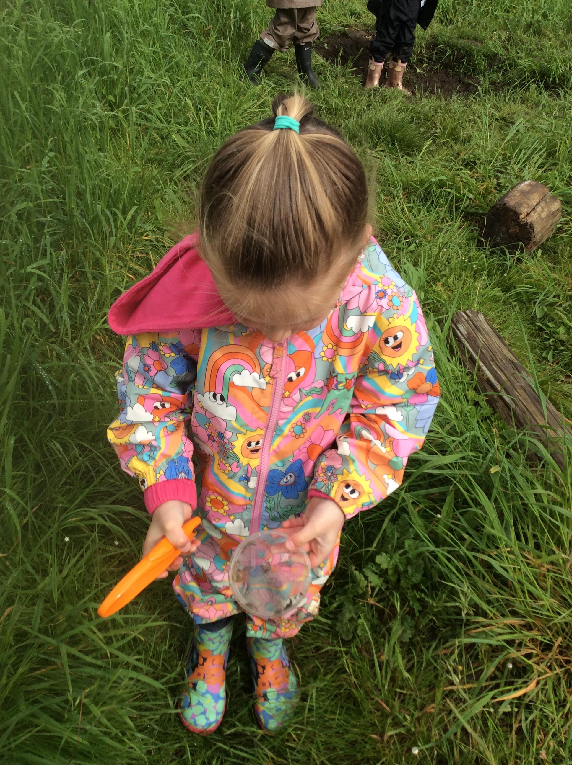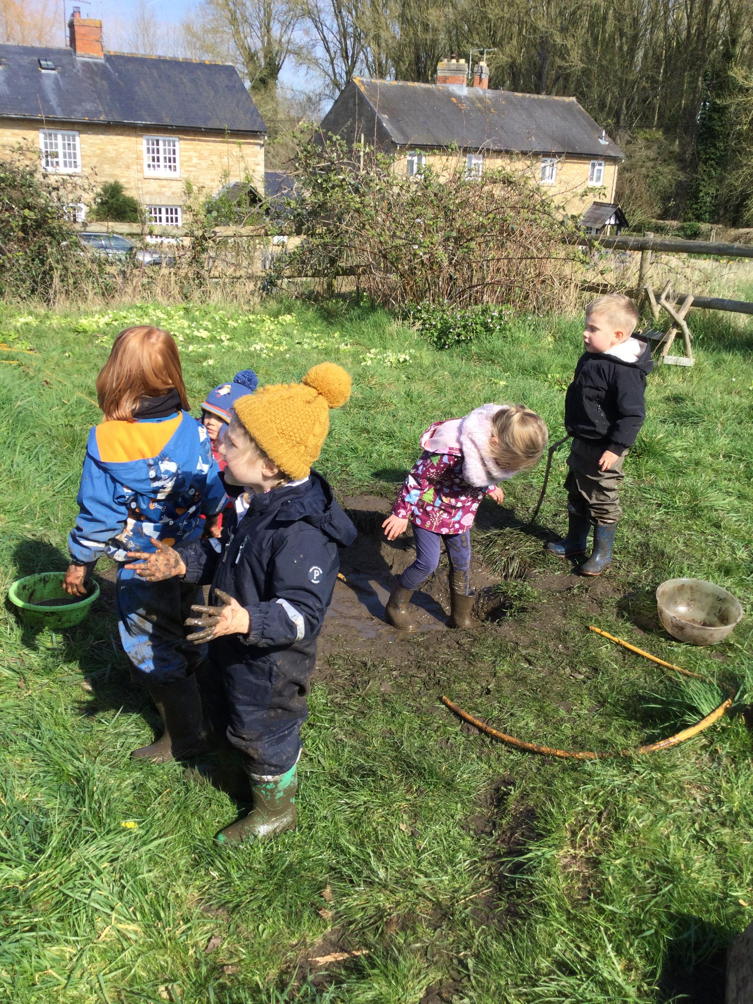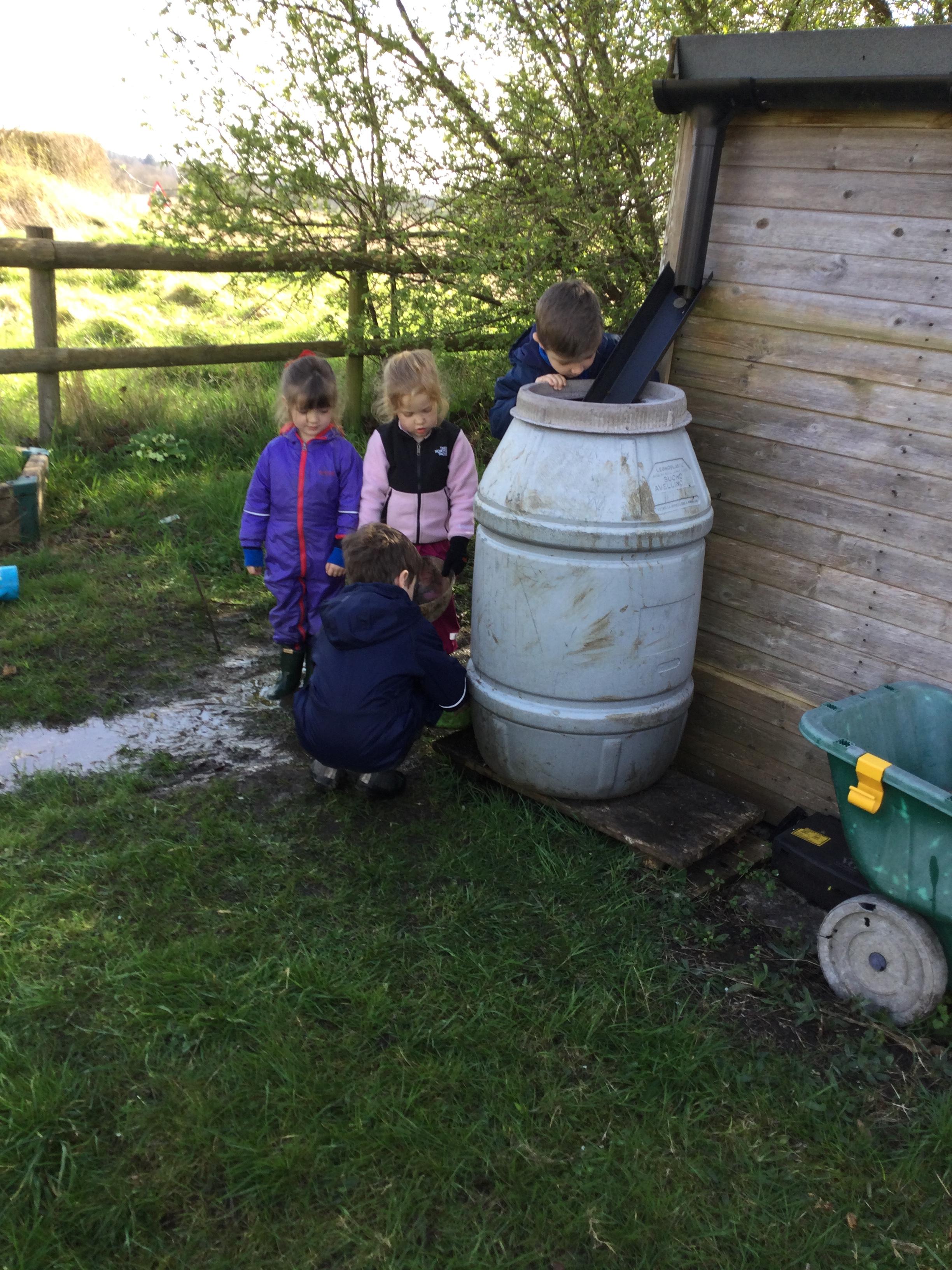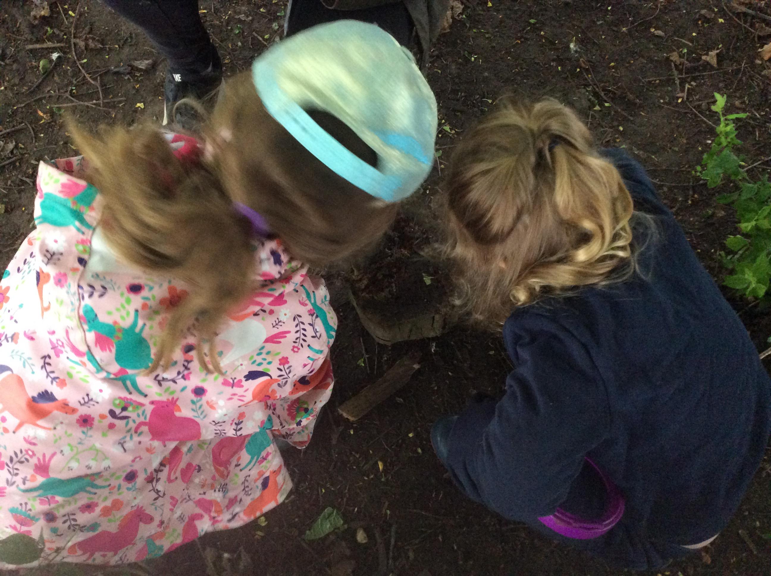 This term, Little and Big Acorns have enjoyed cooking over the fire as well as experimenting with mud. Rainy days and the water tank have provided ample opportunities for mud play. The children dug a small pond at the bottom of the allotment and relished jumping into it. Transporting water from the tank to the pond required focus and teamwork, and taking turns to jump in demanded patience.