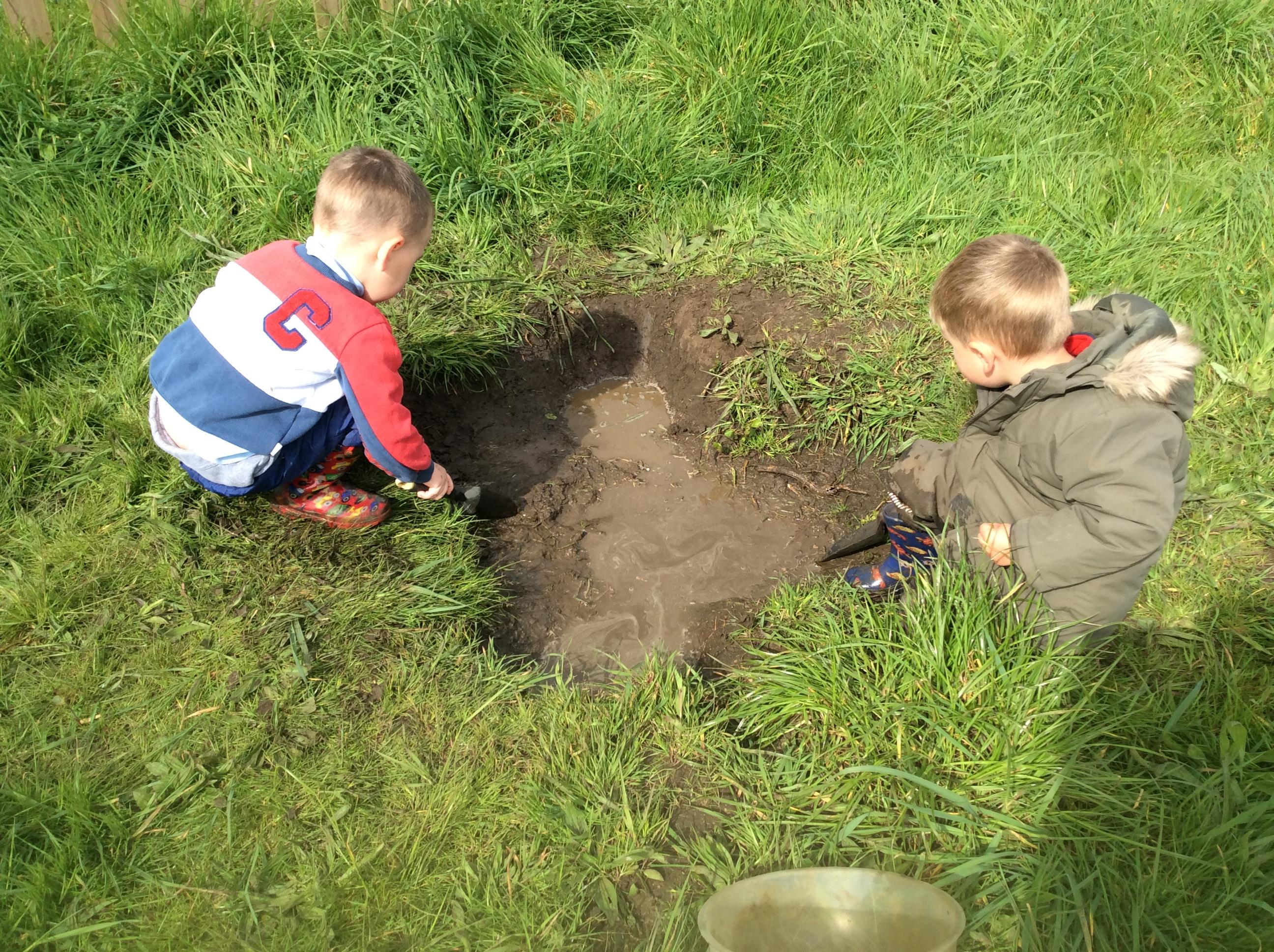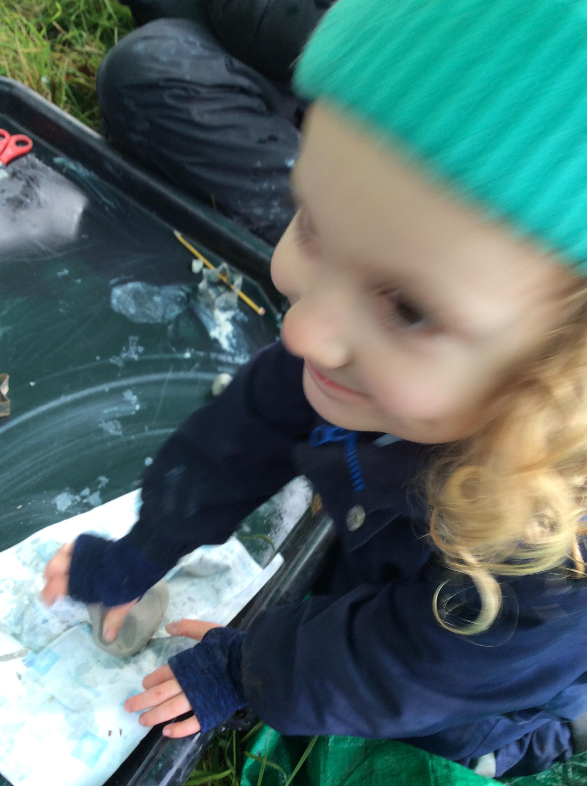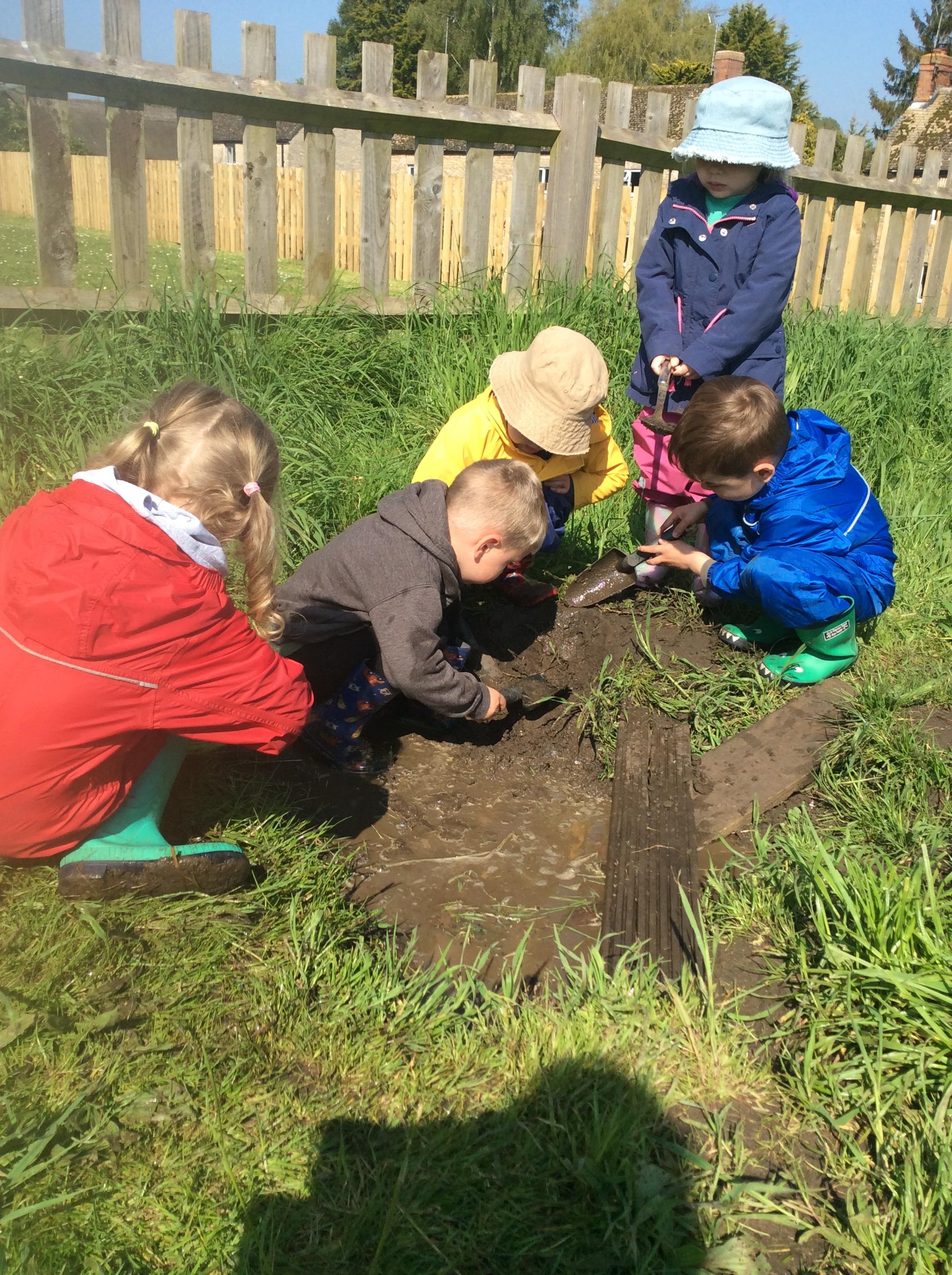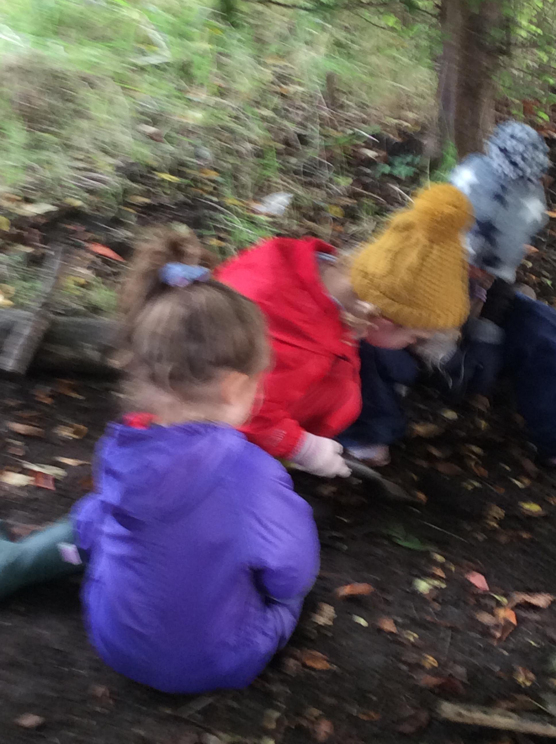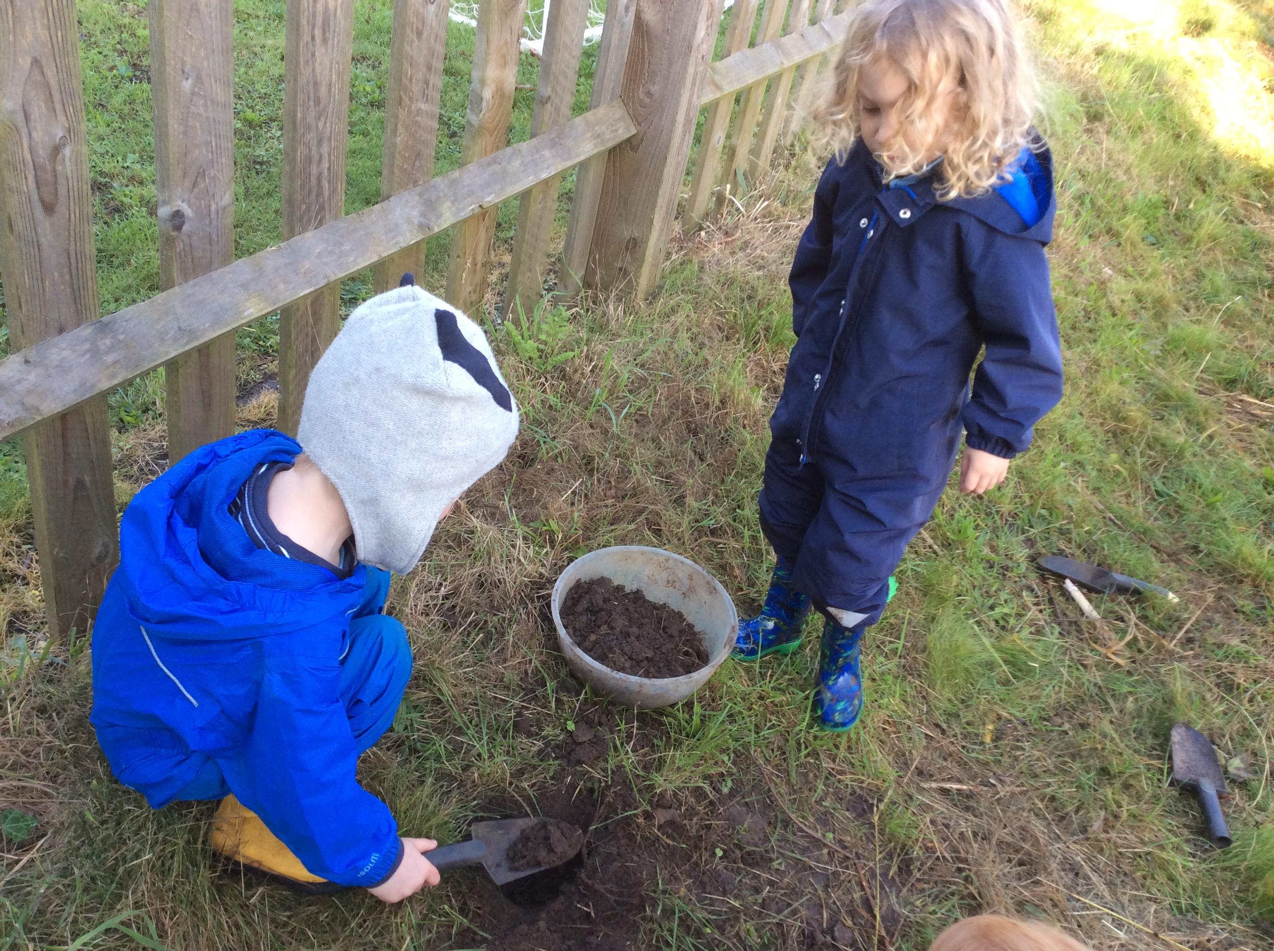 This term, Little and Big Acorns have enjoyed cooking over the fire as well as experimenting with mud. Rainy days and the water tank have provided ample opportunities for mud play. The children dug a small pond at the bottom of the allotment and relished jumping into it. Transporting water from the tank to the pond required focus and teamwork, and taking turns to jump in demanded patience.