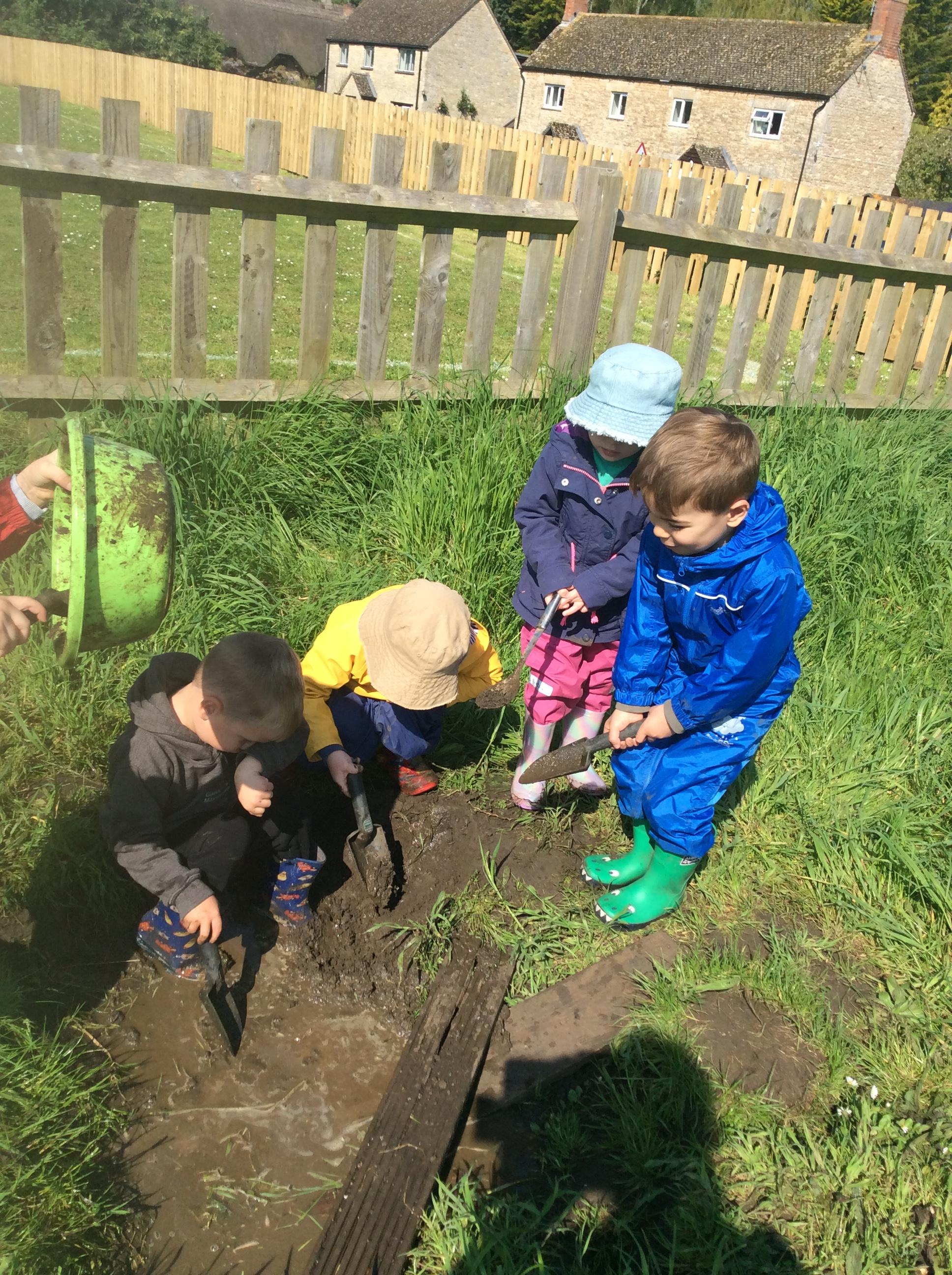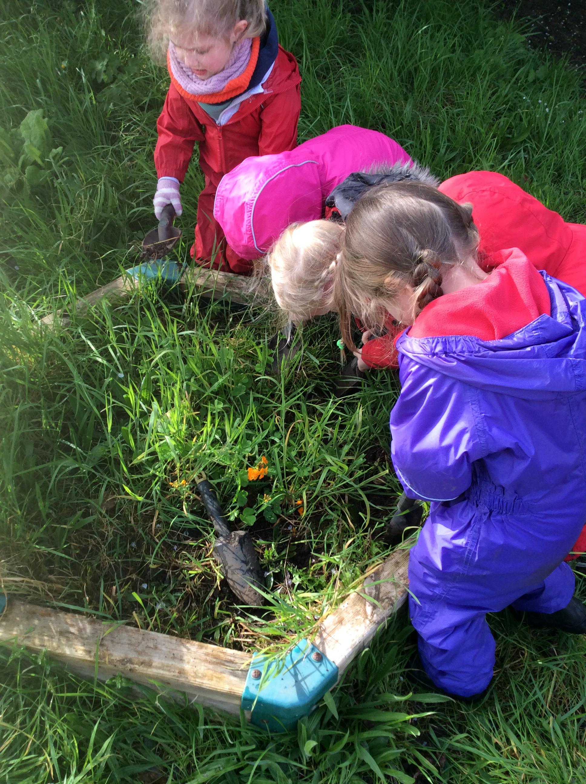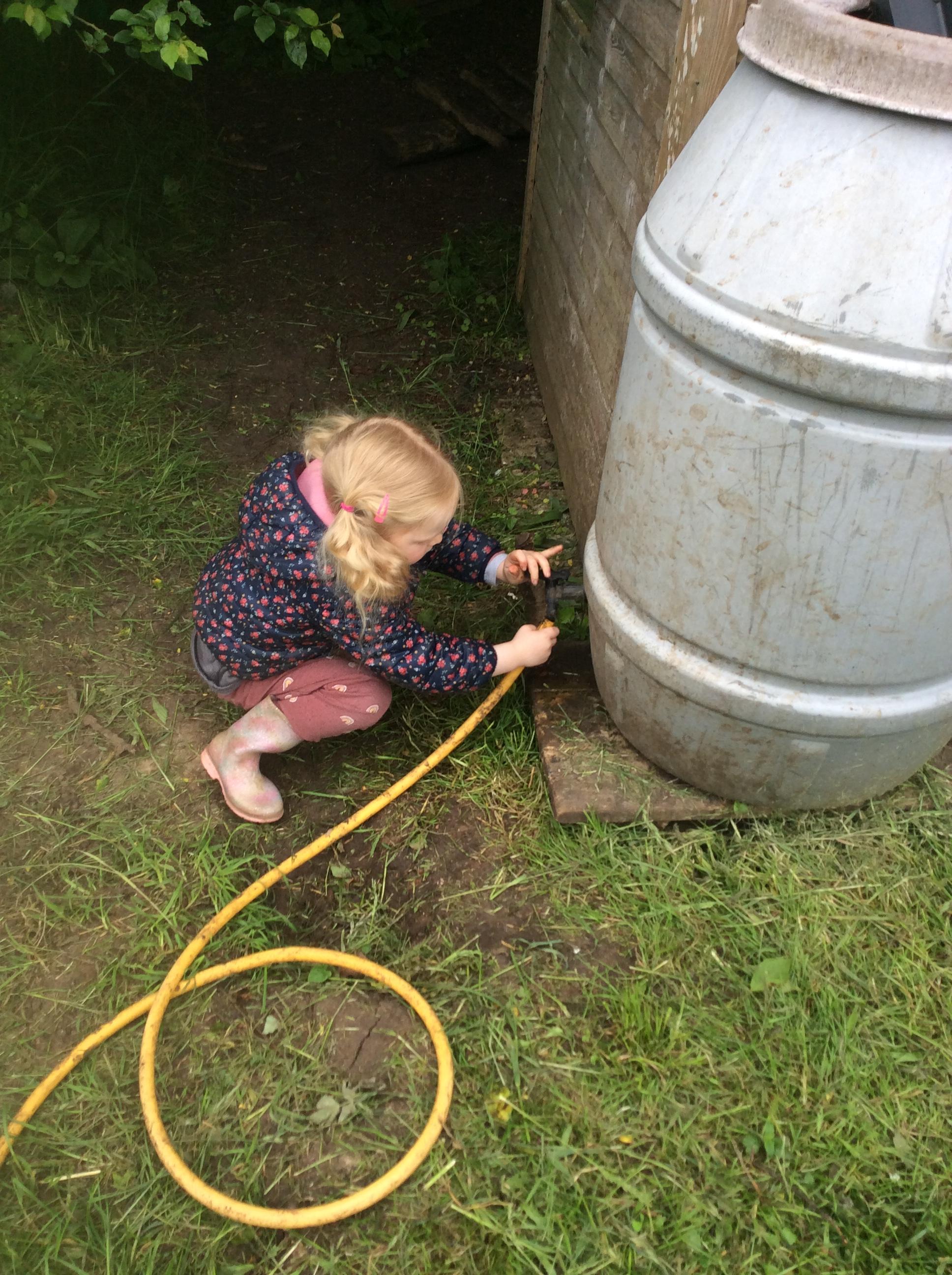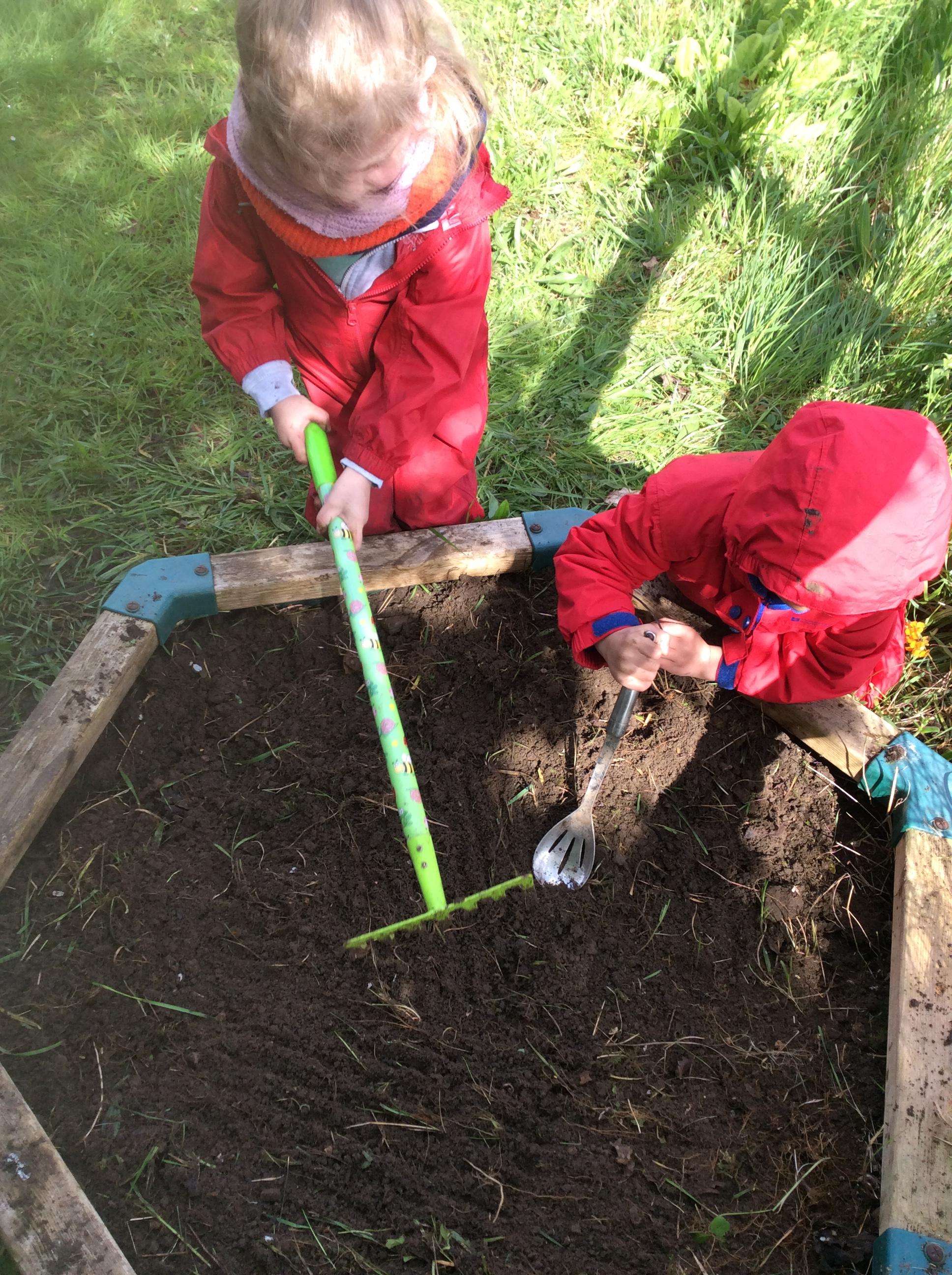 This term, Little and Big Acorns have enjoyed cooking over the fire as well as experimenting with mud. Rainy days and the water tank have provided ample opportunities for mud play. The children dug a small pond at the bottom of the allotment and relished jumping into it. Transporting water from the tank to the pond required focus and teamwork, and taking turns to jump in demanded patience.