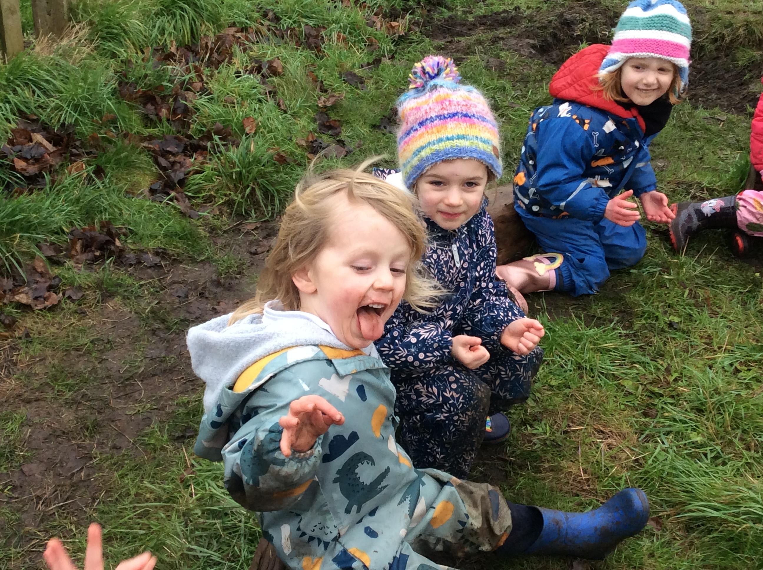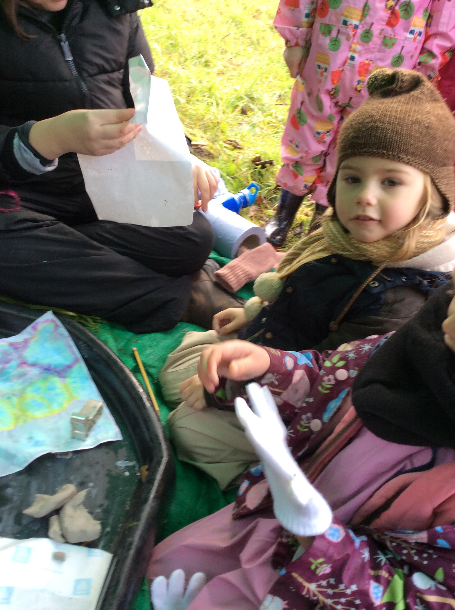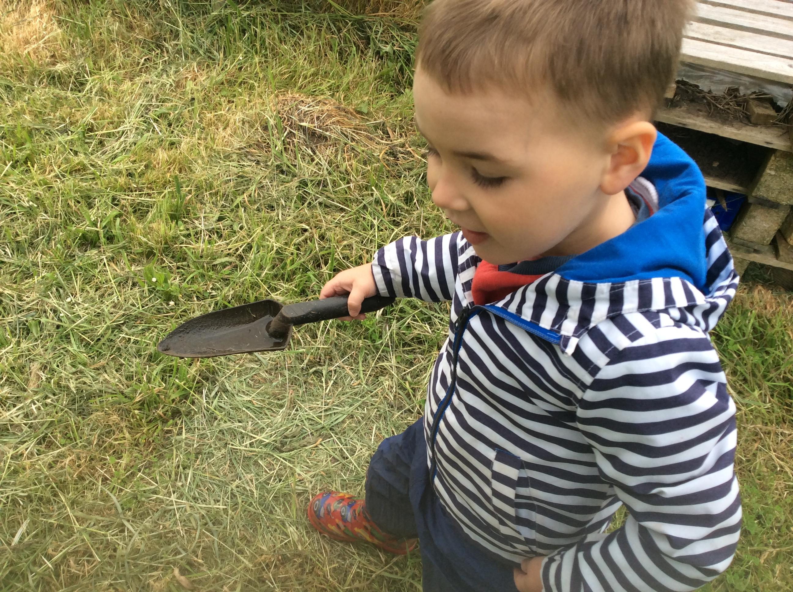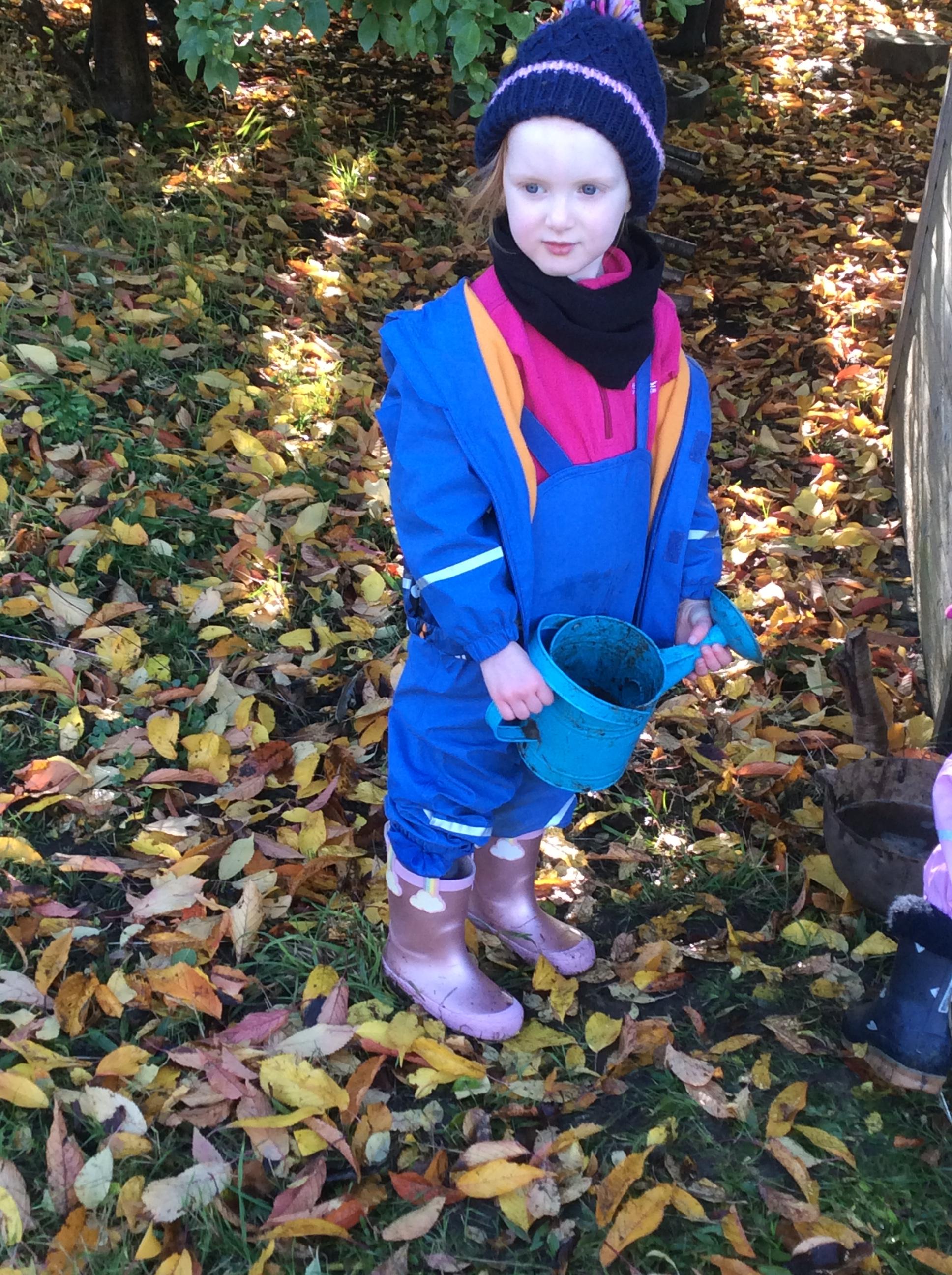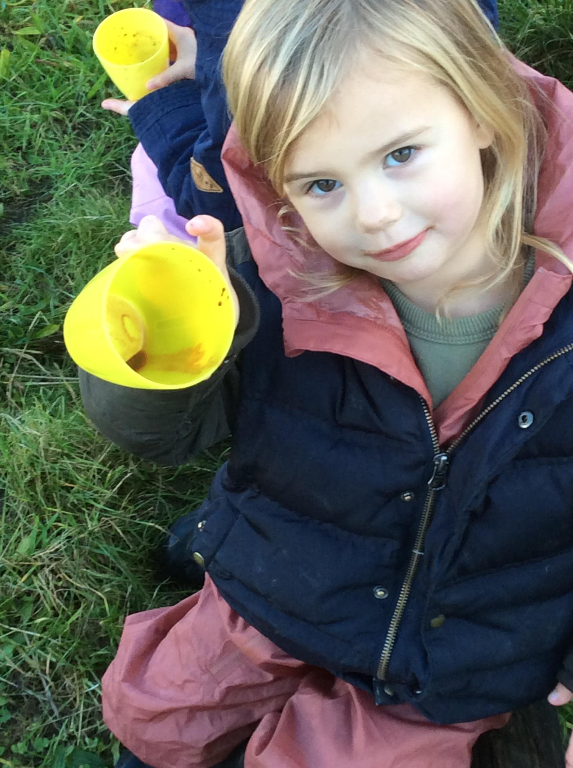 This term, Little and Big Acorns have enjoyed cooking over the fire as well as experimenting with mud. Rainy days and the water tank have provided ample opportunities for mud play. The children dug a small pond at the bottom of the allotment and relished jumping into it. Transporting water from the tank to the pond required focus and teamwork, and taking turns to jump in demanded patience.