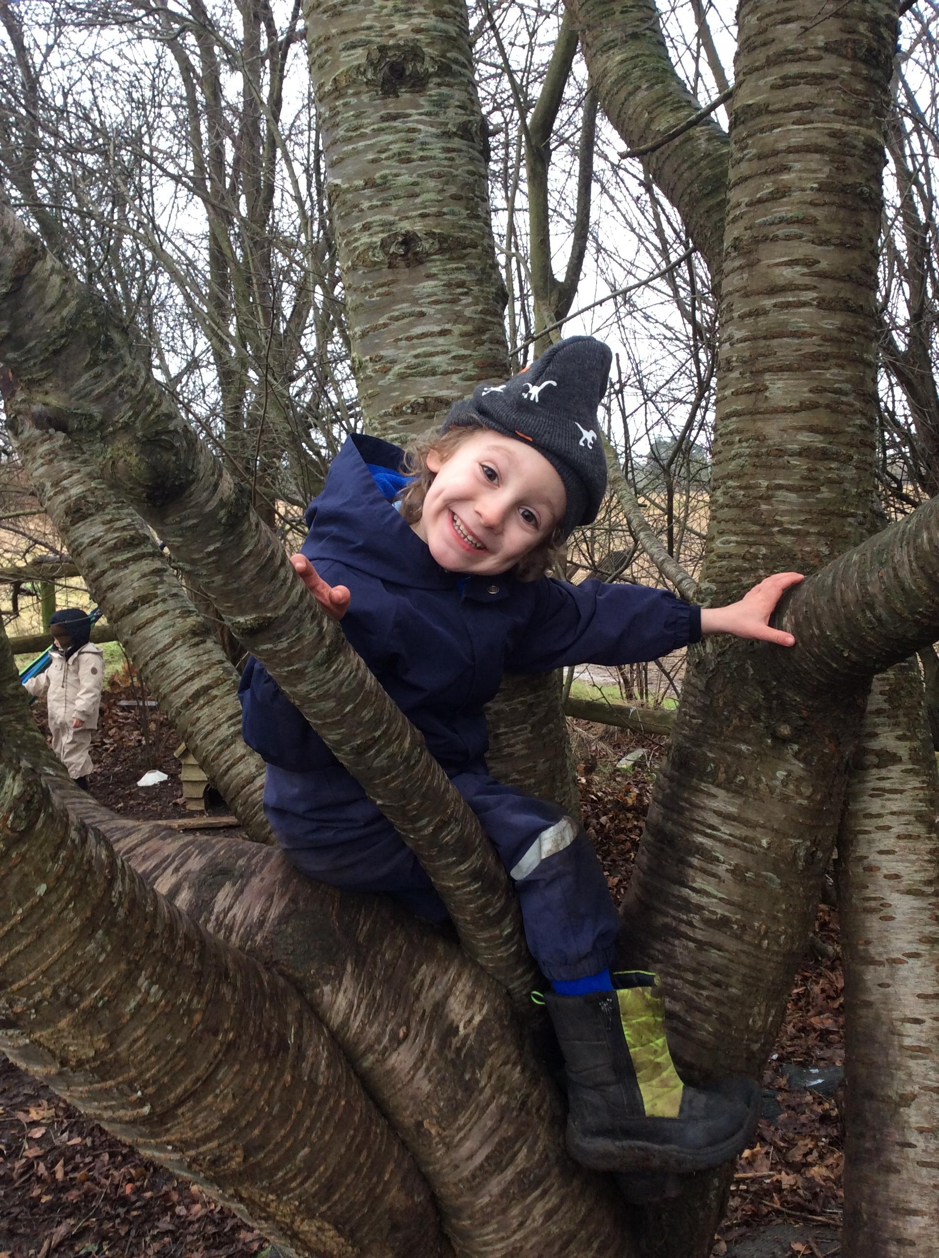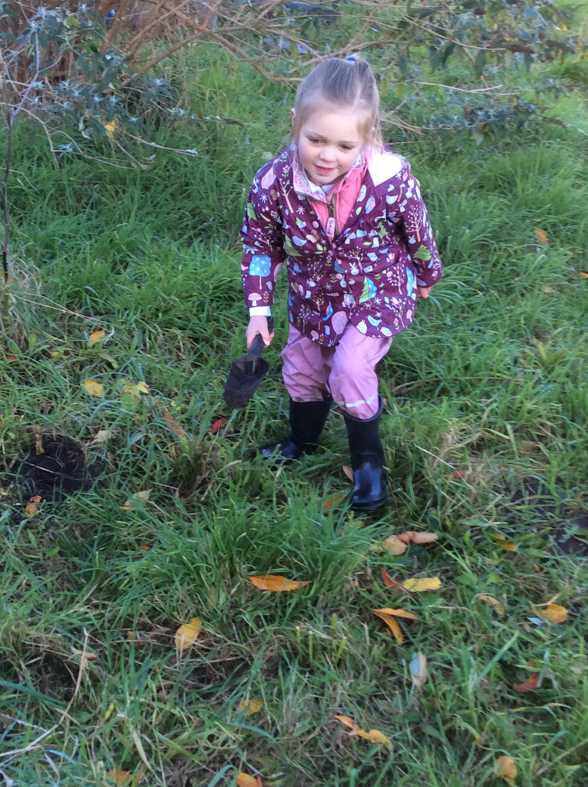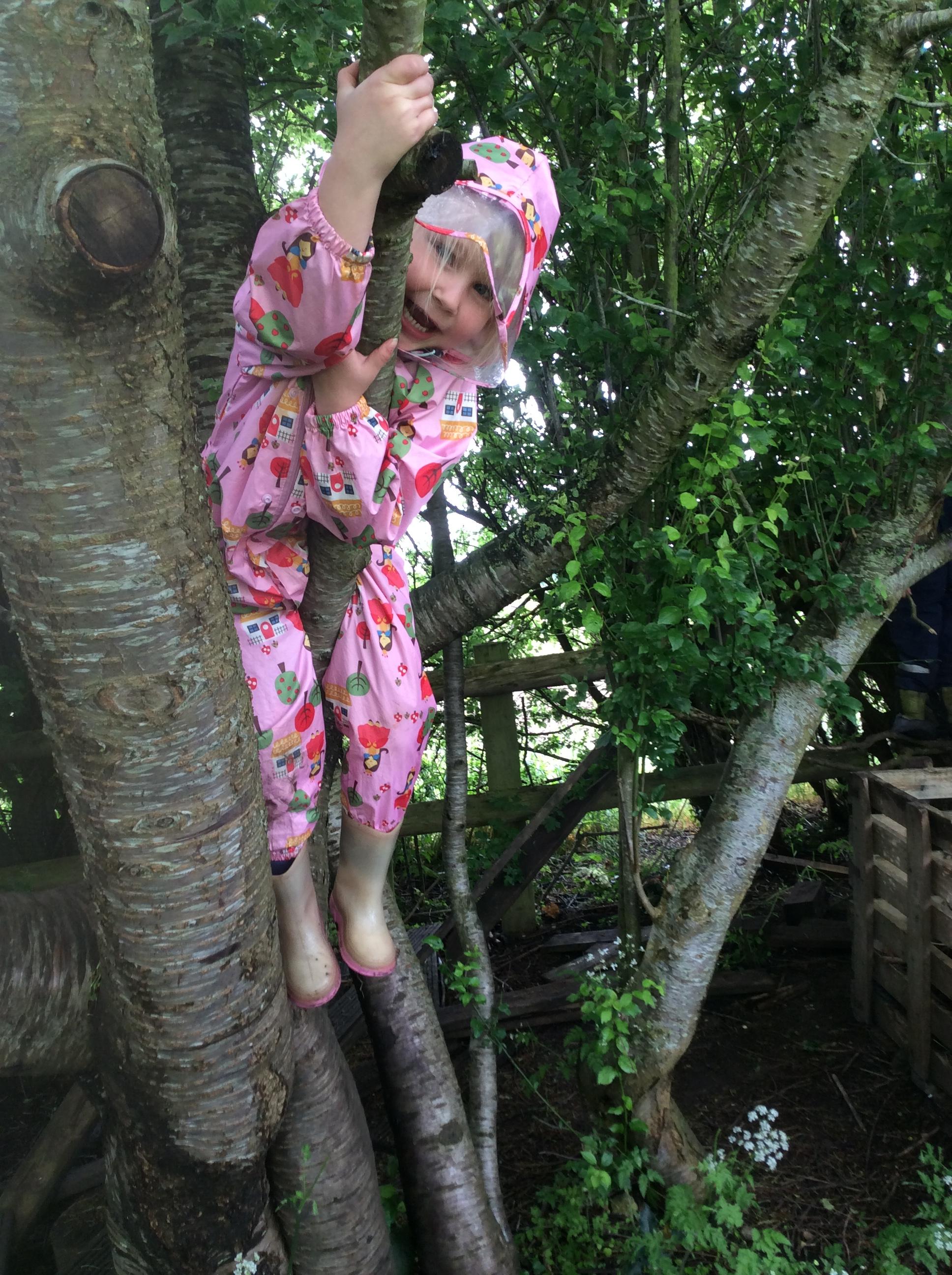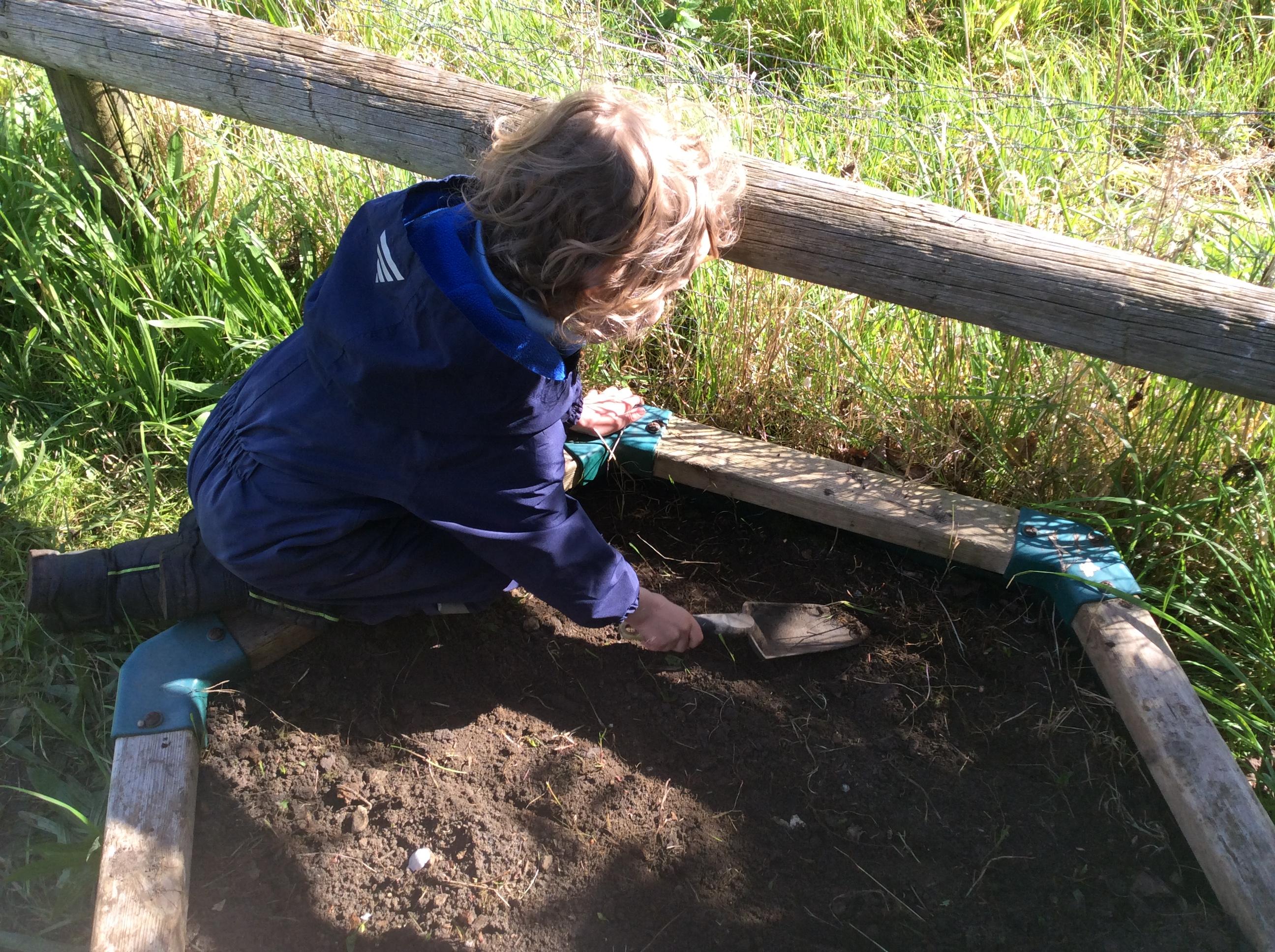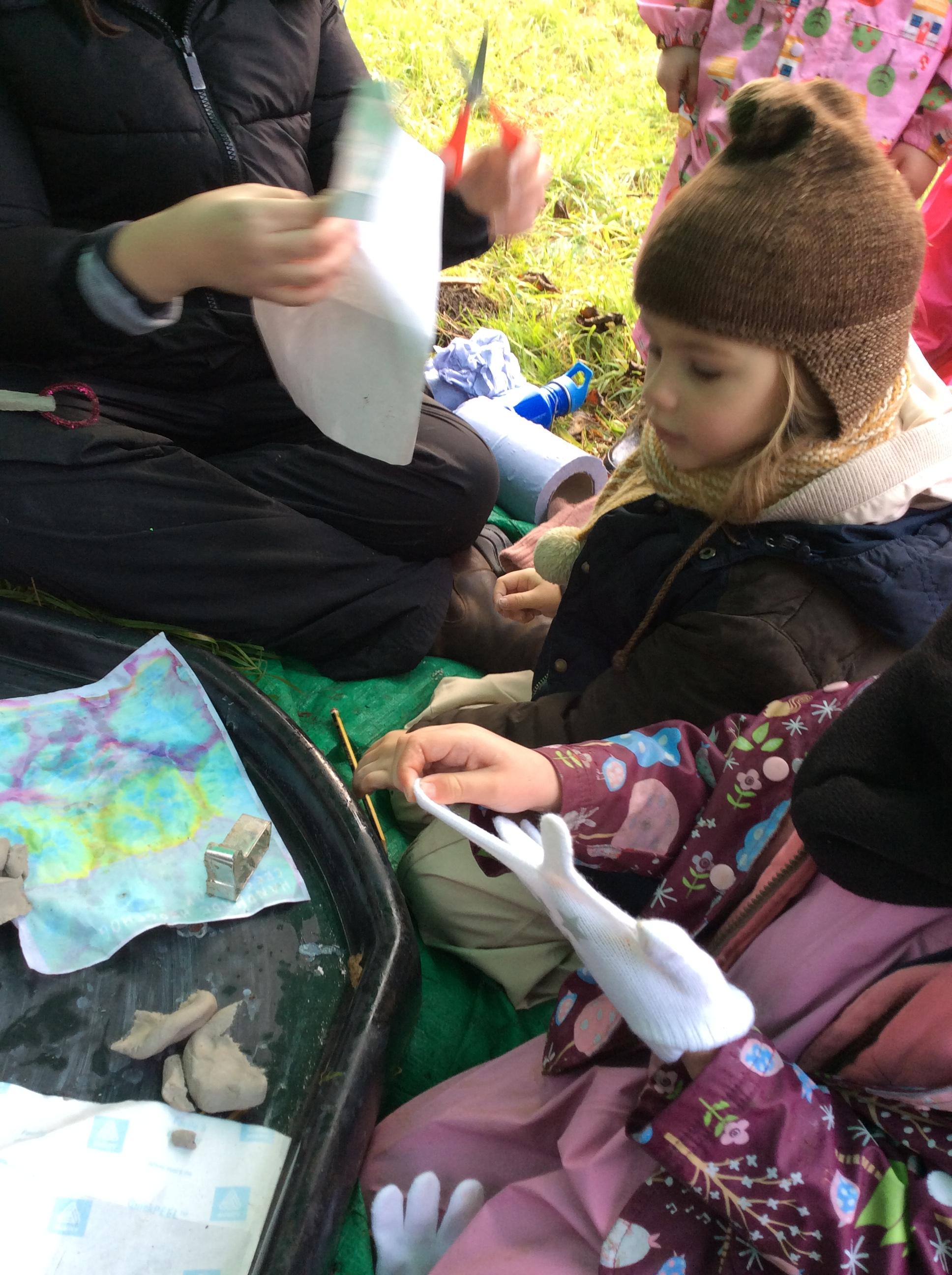 This term, Little and Big Acorns have enjoyed cooking over the fire as well as experimenting with mud. Rainy days and the water tank have provided ample opportunities for mud play. The children dug a small pond at the bottom of the allotment and relished jumping into it. Transporting water from the tank to the pond required focus and teamwork, and taking turns to jump in demanded patience.