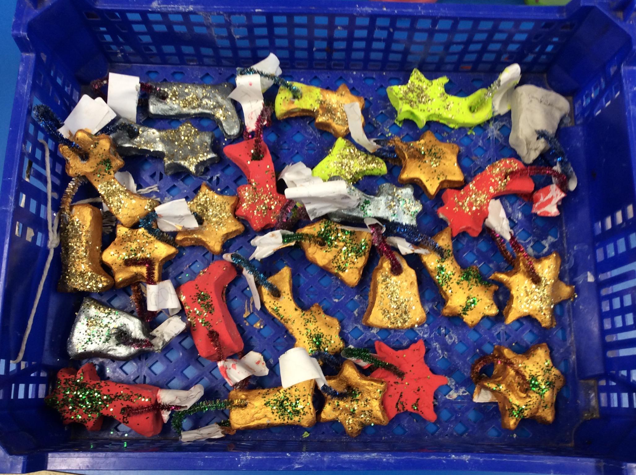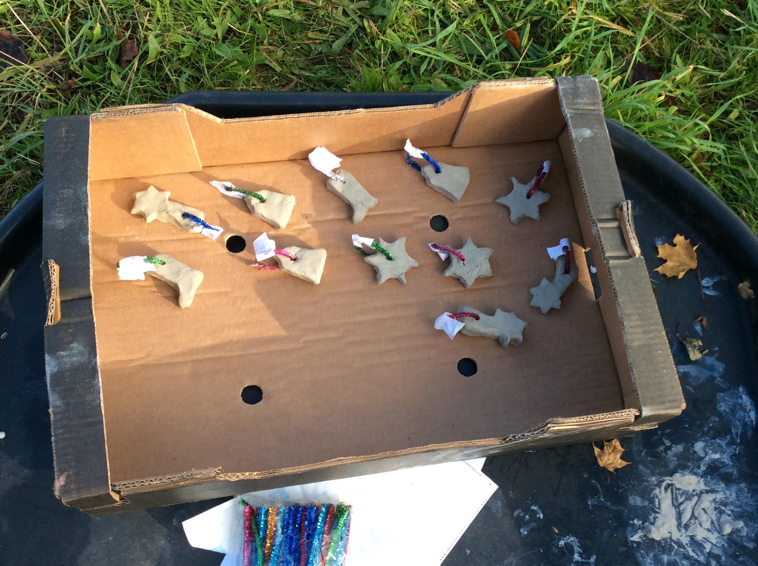 At the end of term 2, we made our own Christmas tree decorations out of clay and then decorated them in the classroom using paint and lots of glitter. As Mrs. Lefebvre always says, 'life is better with glitter' I'm sure the children were proud to show you what they made. However, they might not have mentioned how resilient they were during the process. Both groups did this on a cold day, opting to take off their gloves to shape the clay more easily. Additionally, Big Acorns worked during a rainy session, making the clay very sticky. Despite setting up a temporary tarpaulin shelter, the humidity made the clay challenging to work with. Fortunately, Miss Hatton was there to assist us, and we all loved having her at Forest School.