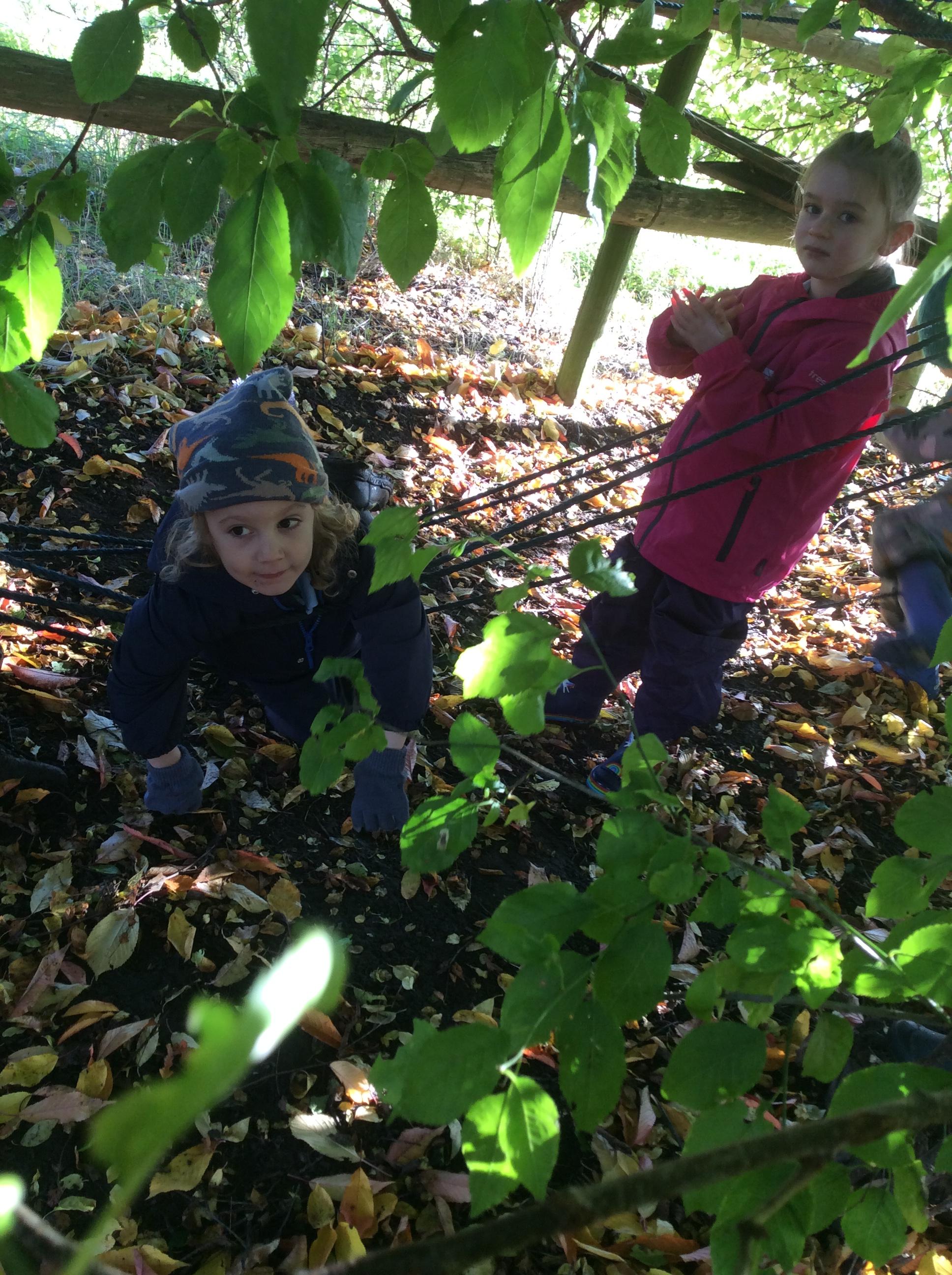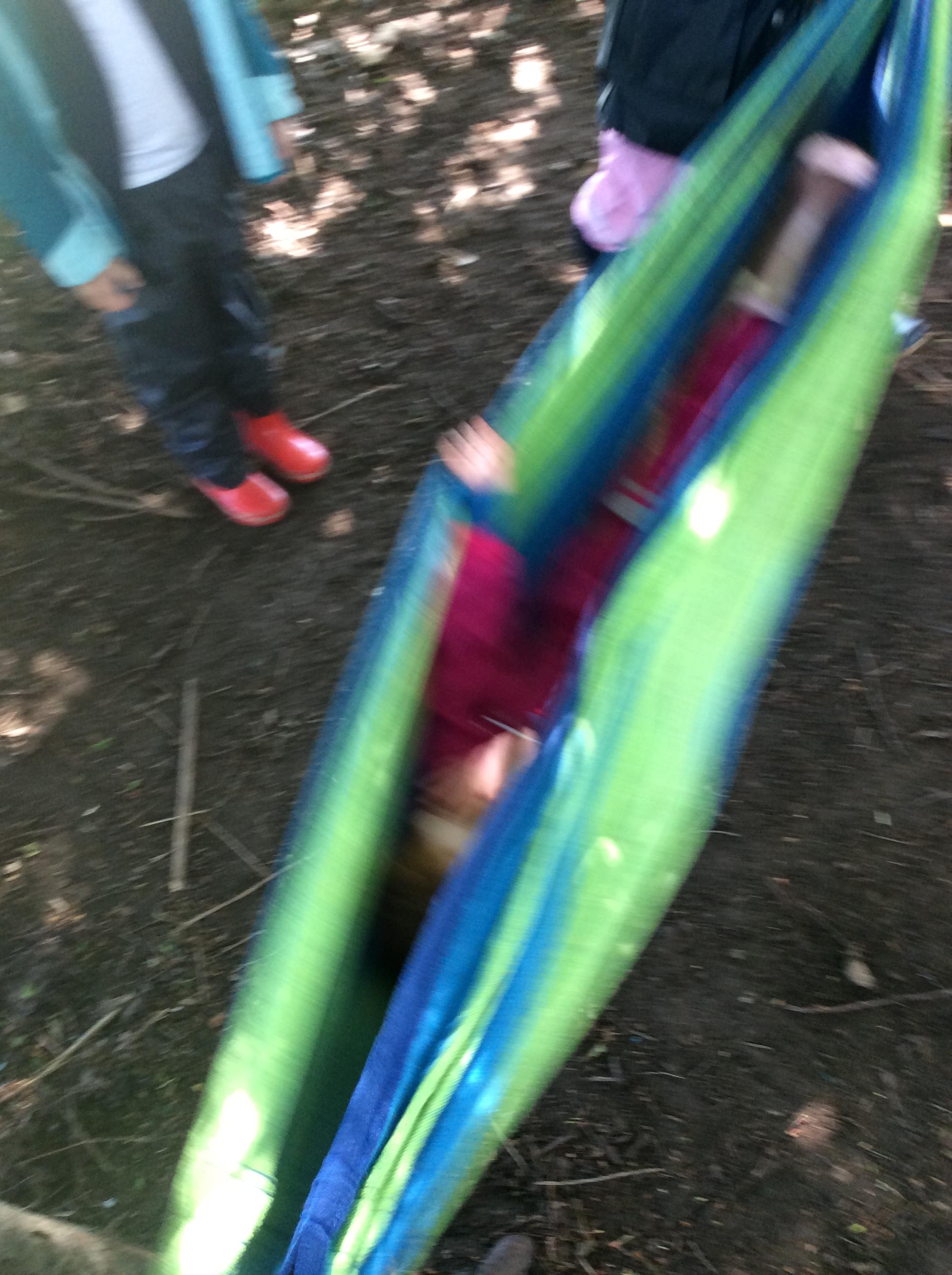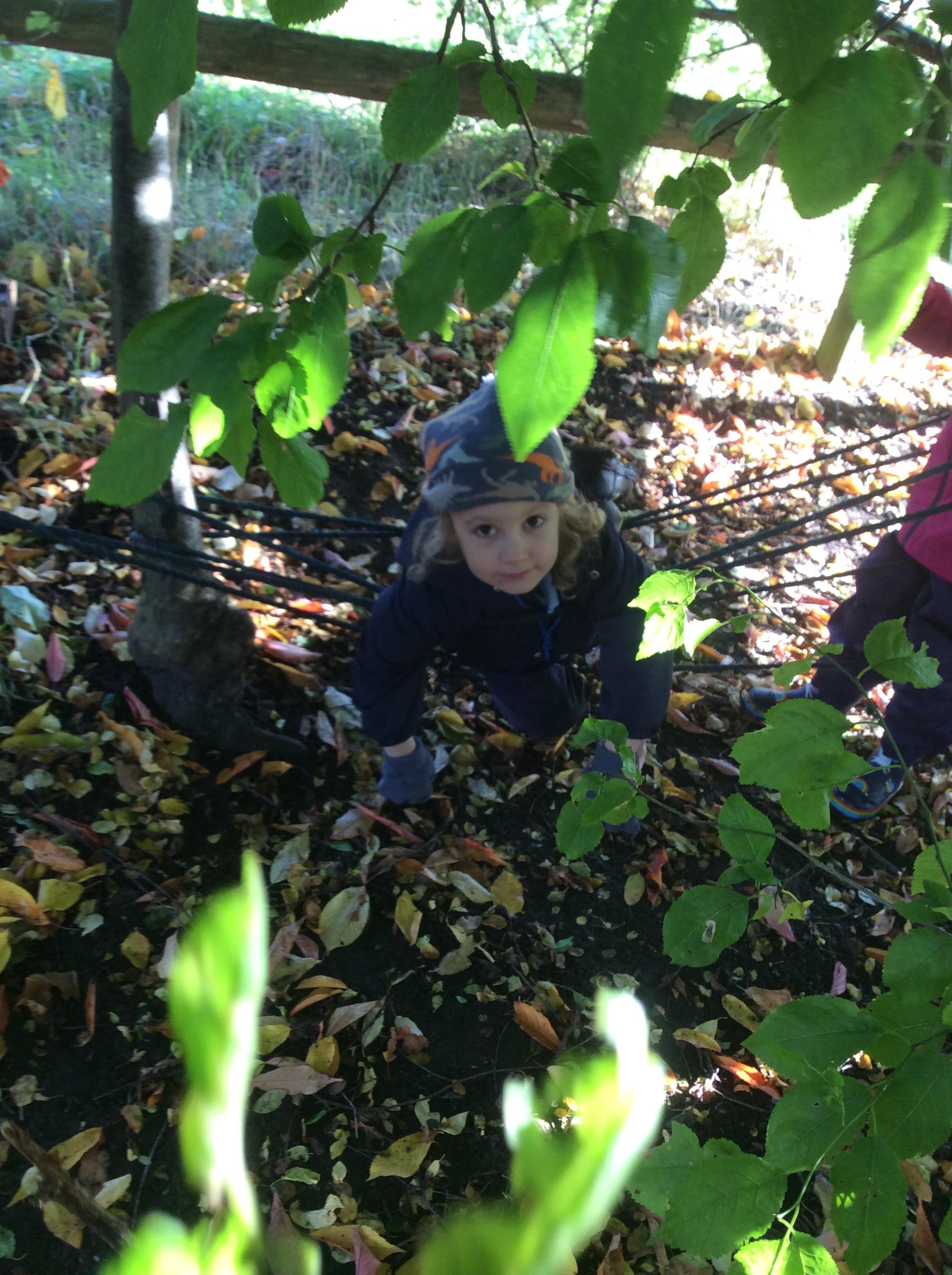 Instead of the hammock, we had a rope spider web. Similar to the story 'We're Going on a Leaf Hunt,' the children had the opportunity to go under, through, or around it.