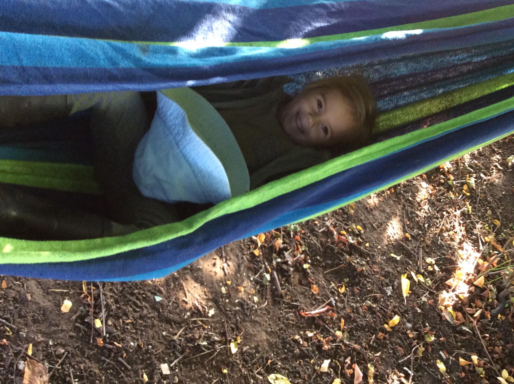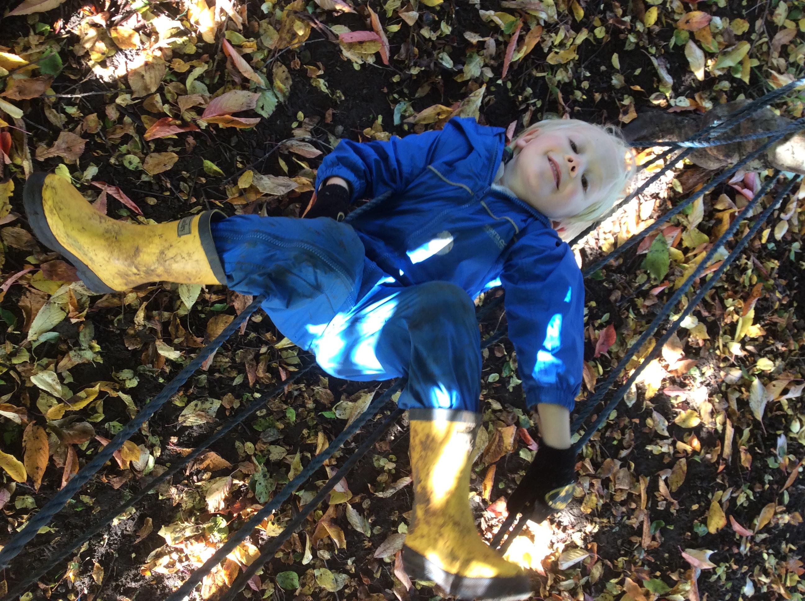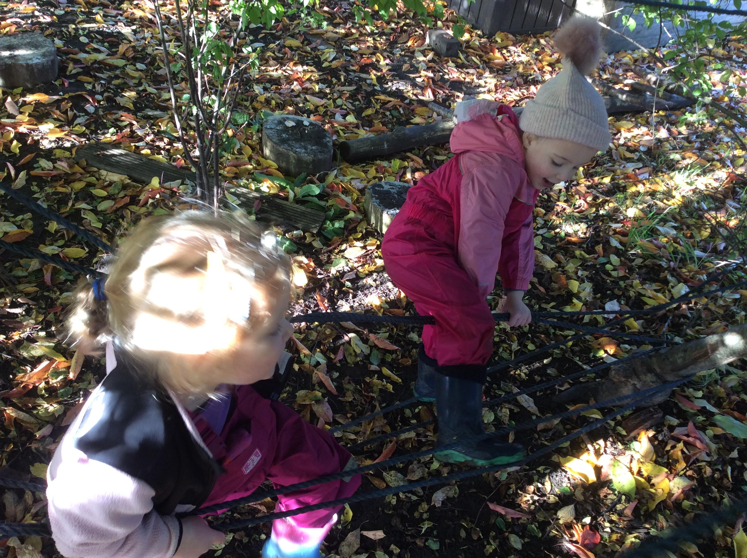 Instead of the hammock, we had a rope spider web. Similar to the story 'We're Going on a Leaf Hunt,' the children had the opportunity to go under, through, or around it.