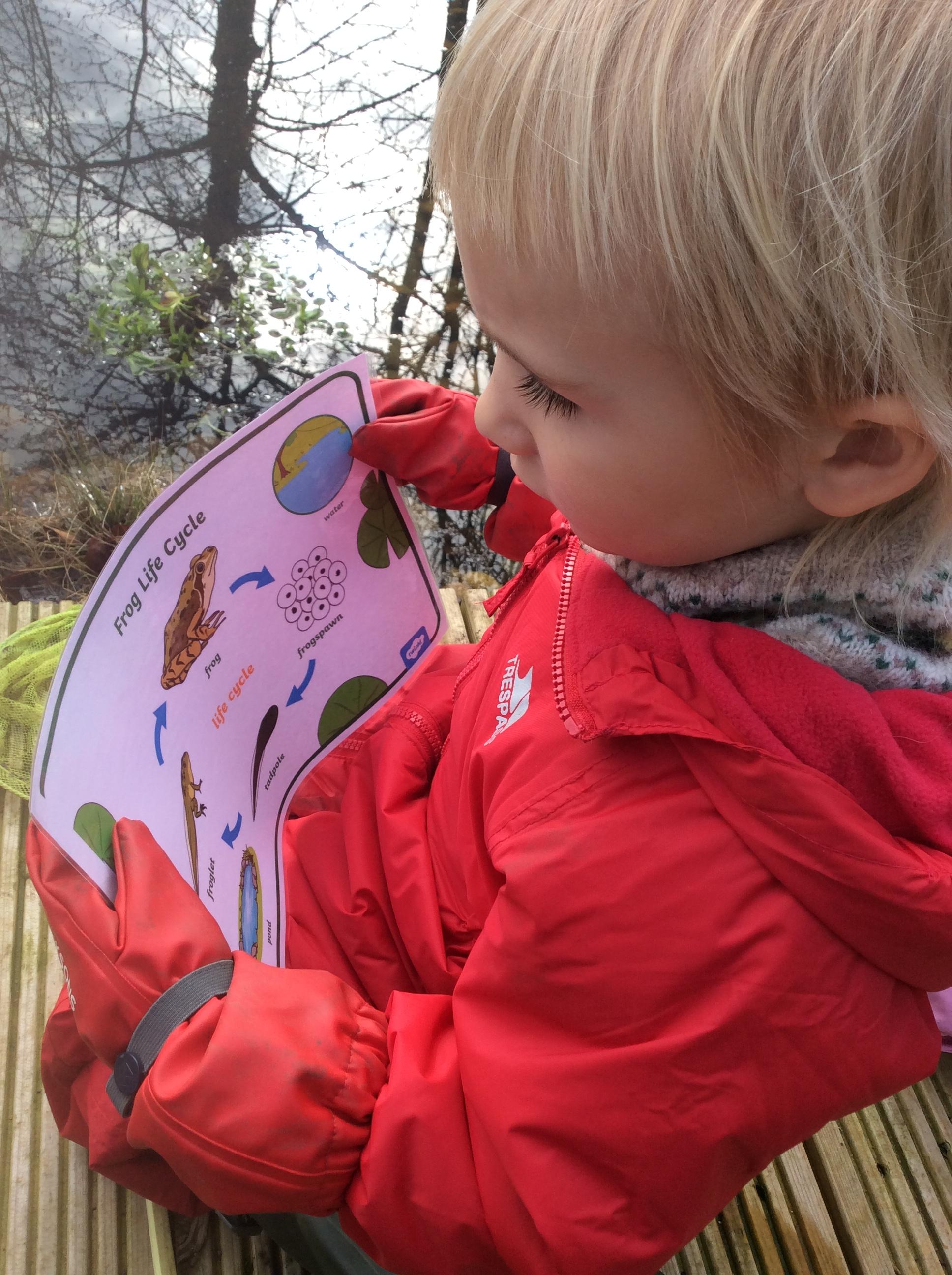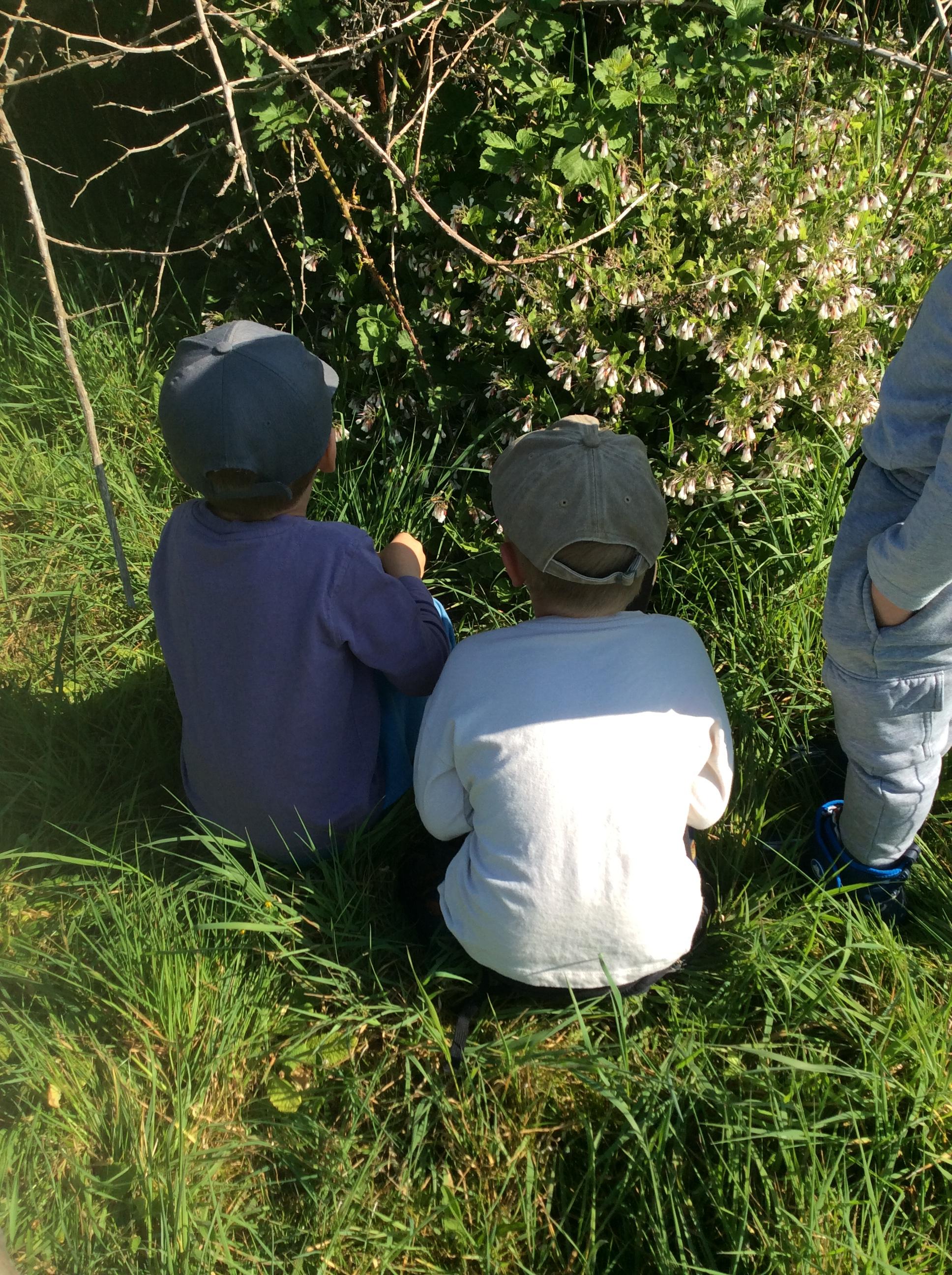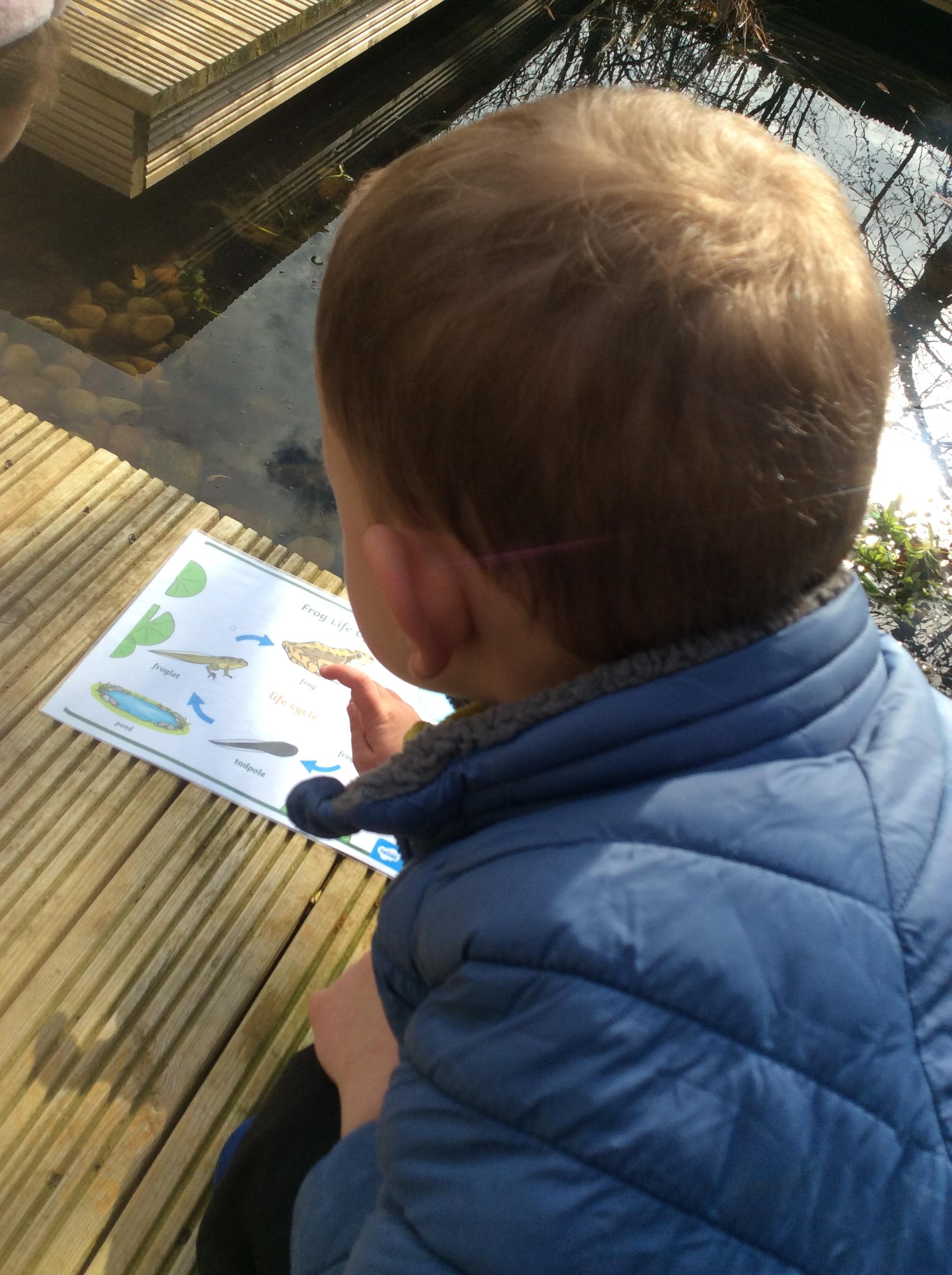 The children were respectful of the frogs and other creatures living in the pond habitat. They avoided touching the water to prevent any disturbance and used their quiet voices so as not to scare the frogs. Unfortunately, the sun wasn’t out, so most of the frogs were hiding.