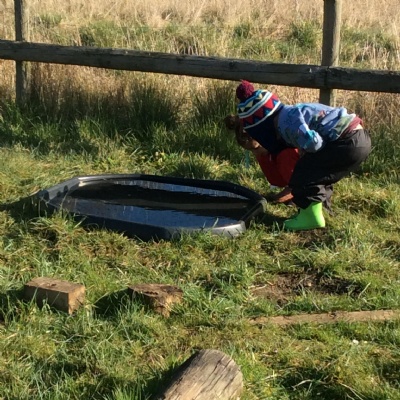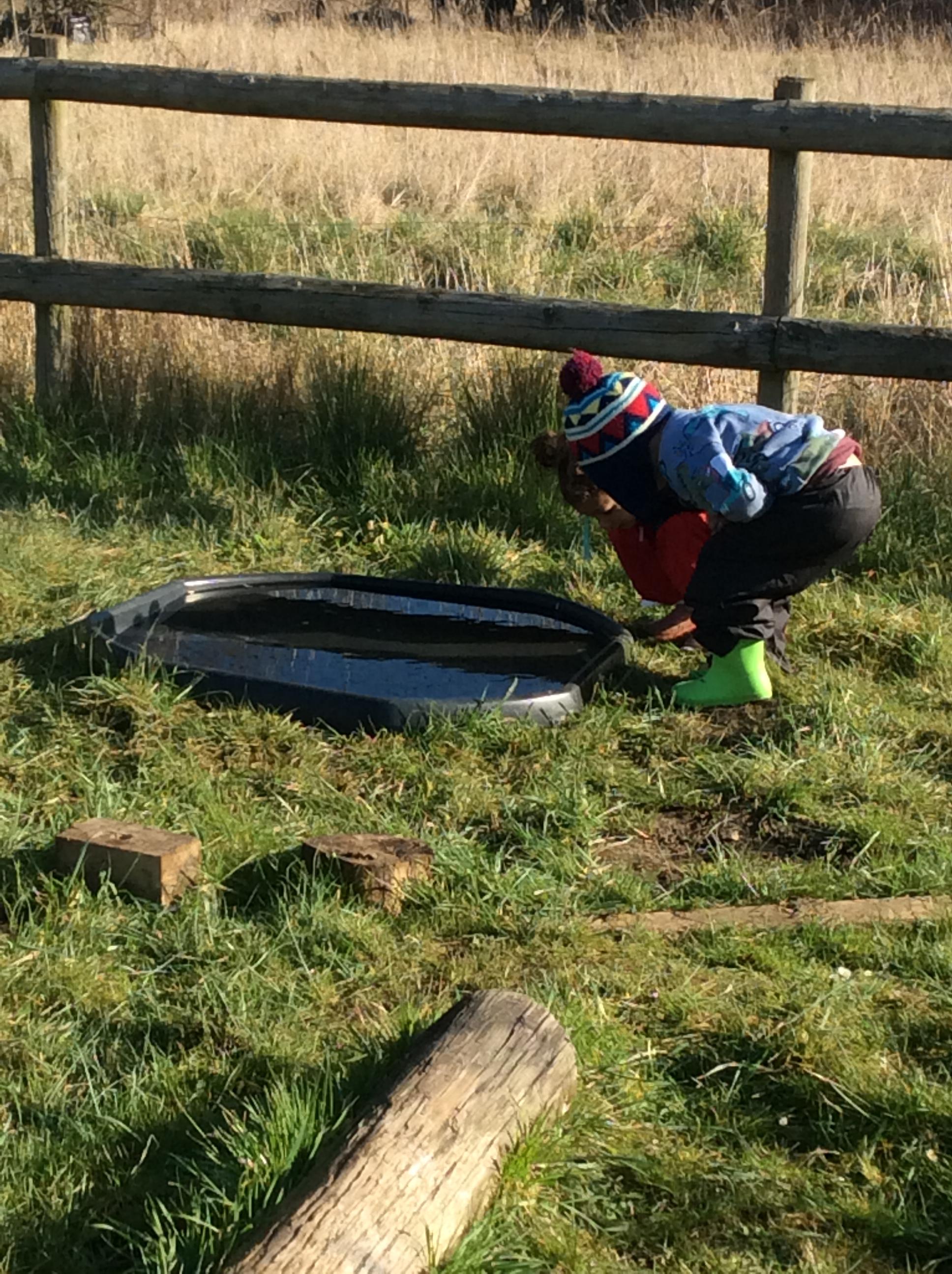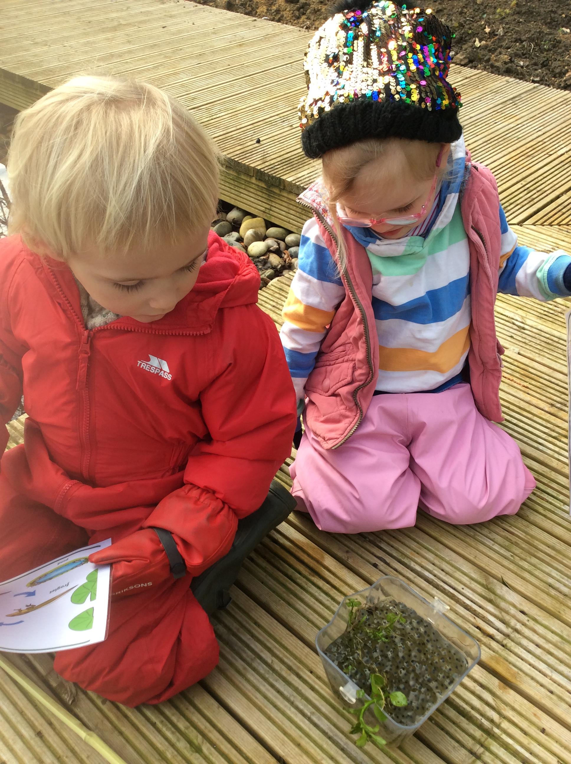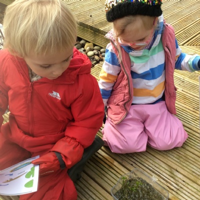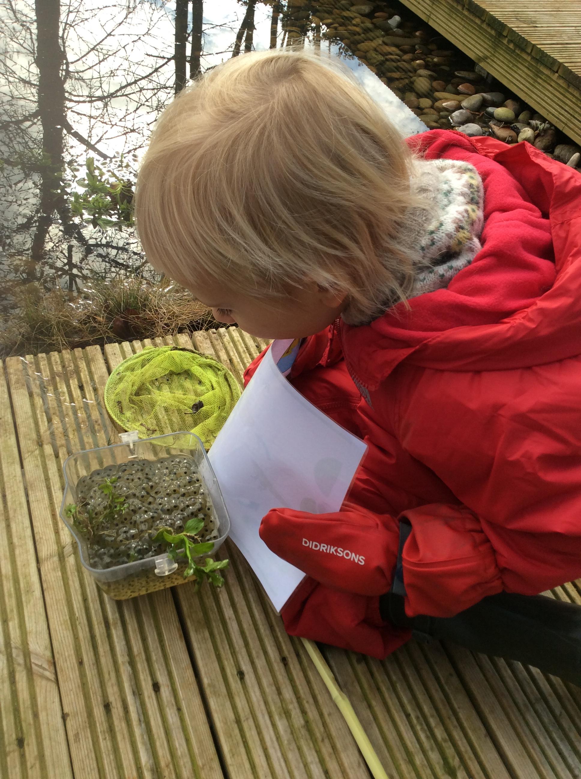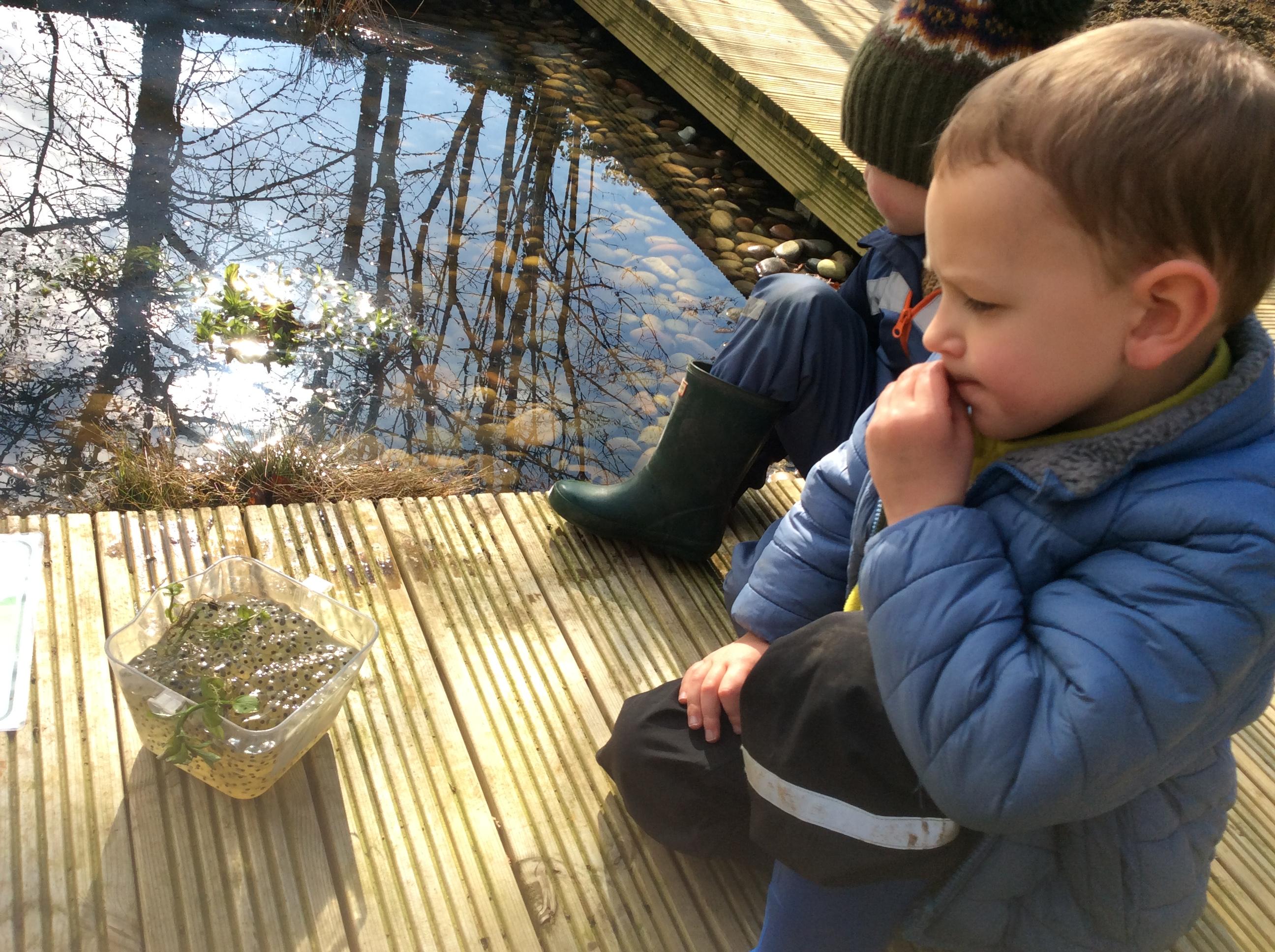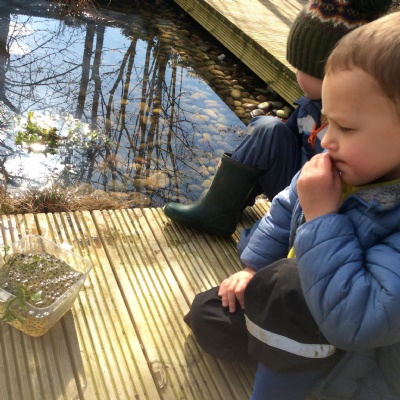 Last week's session at Forest School was really special and precious. Before joining the allotment as usual, we went to the pond and saw some frogspawn. We used a net to carefully place some in a little bowl so the children could observe them up close. We were very careful not to harm them.