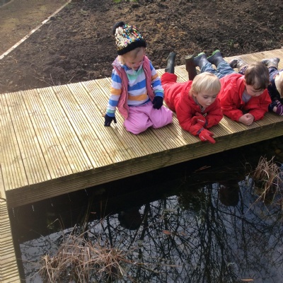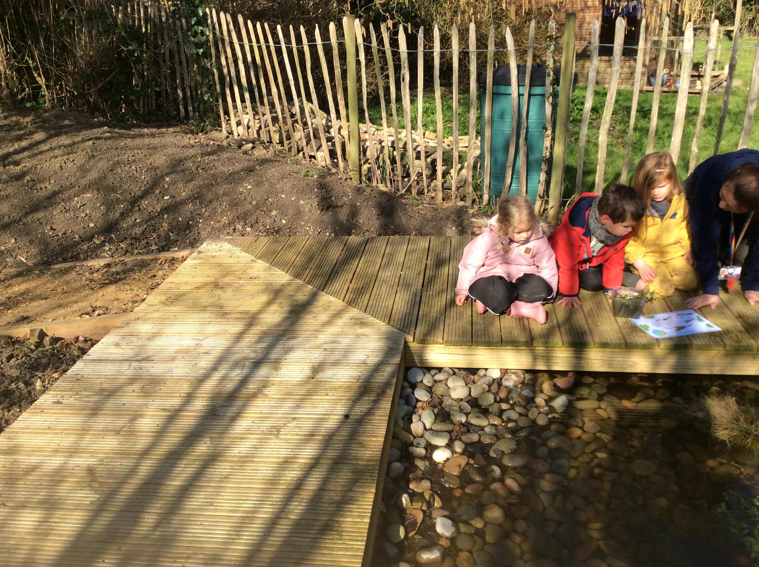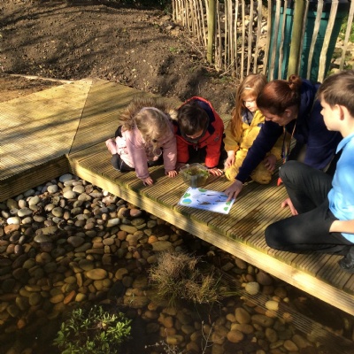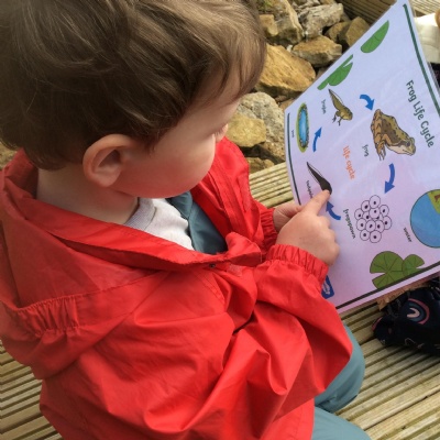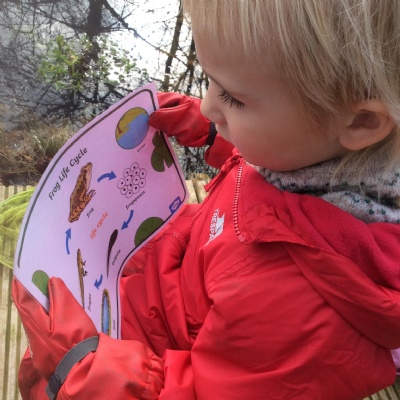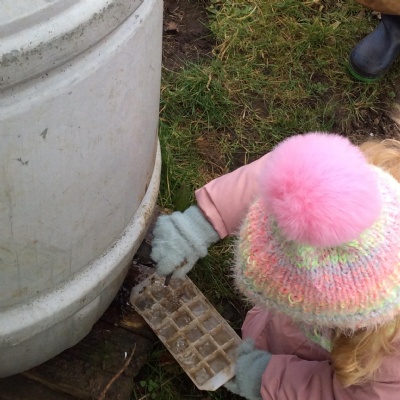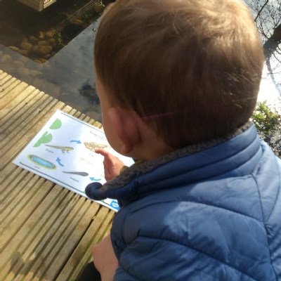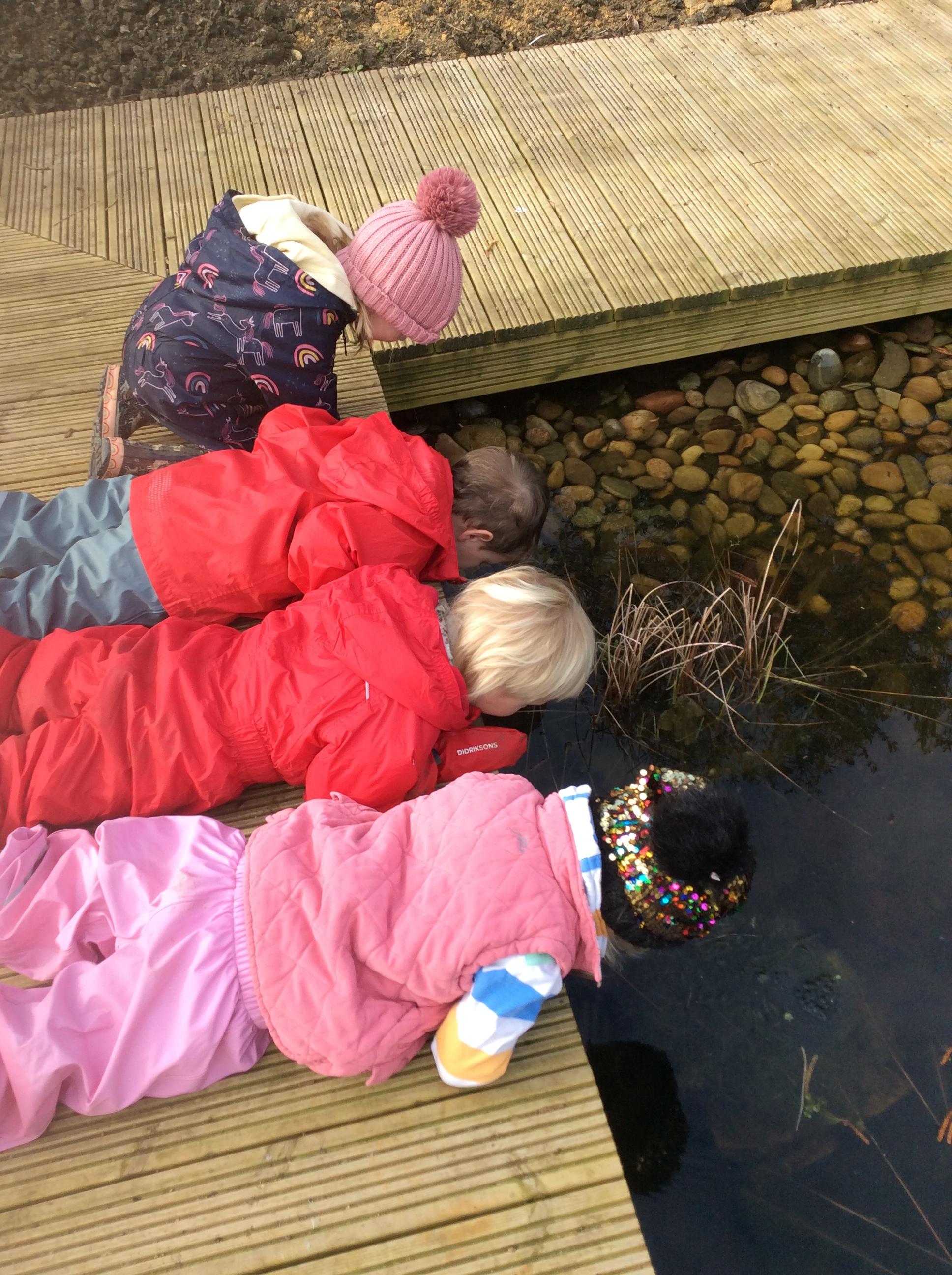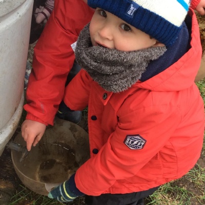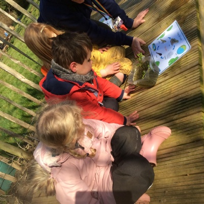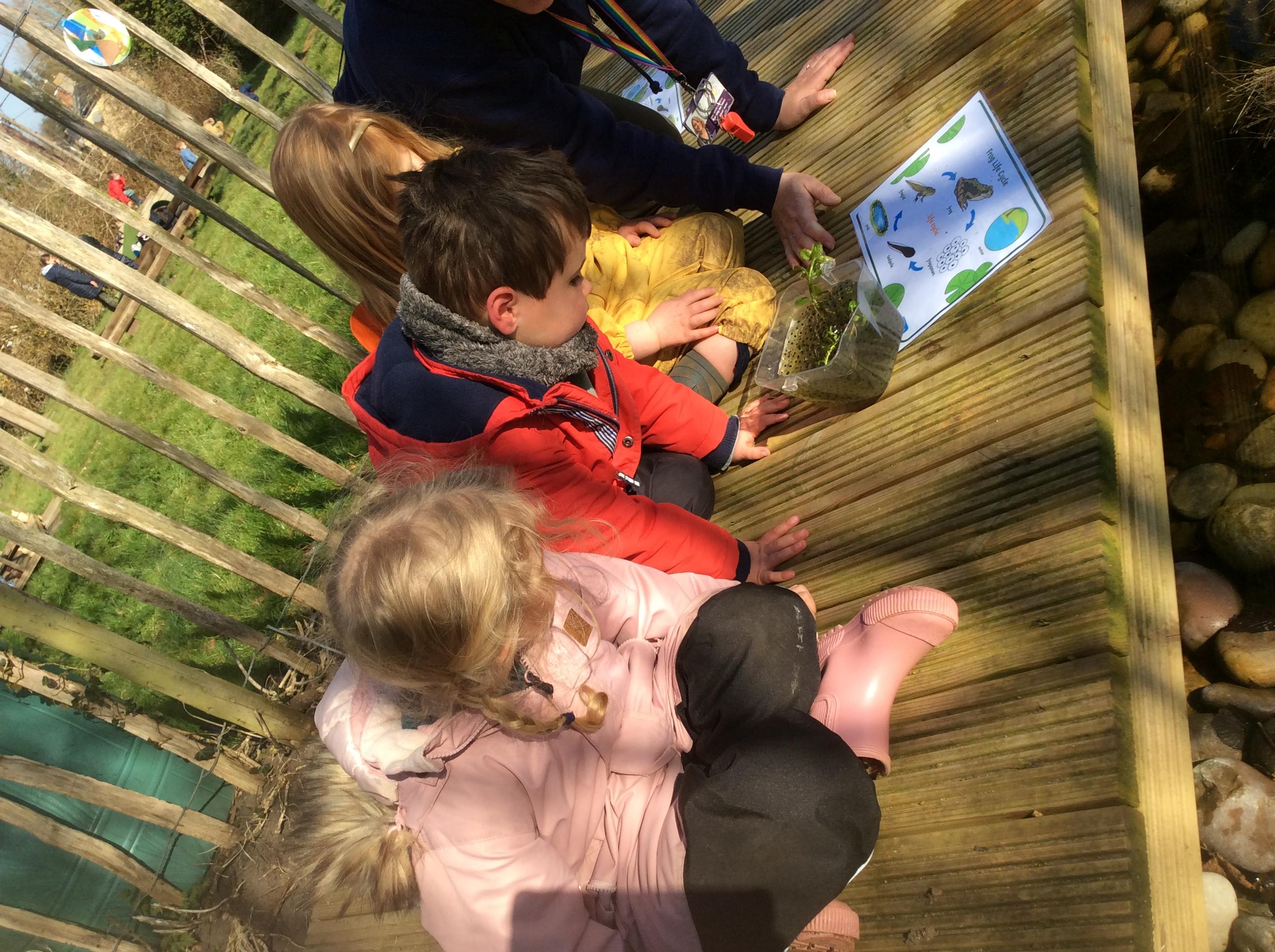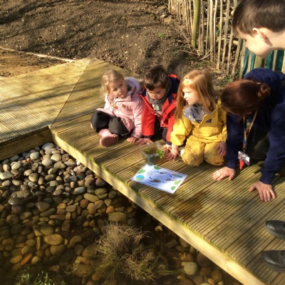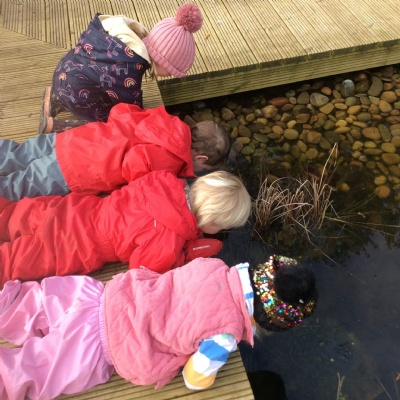 Last week's session at Forest School was really special and precious. Before joining the allotment as usual, we went to the pond and saw some frogspawn. We used a net to carefully place some in a little bowl so the children could observe them up close. We were very careful not to harm them.