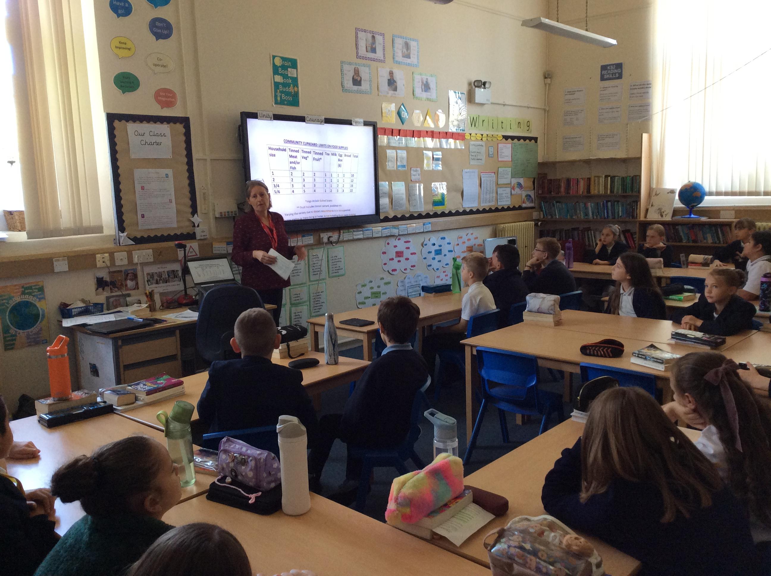 After our whole school harvest festival, Liz Spain (from the Rose Hill Community Cupboard) came into Oak class to discuss her role in supporting families who struggle to provide enough food.