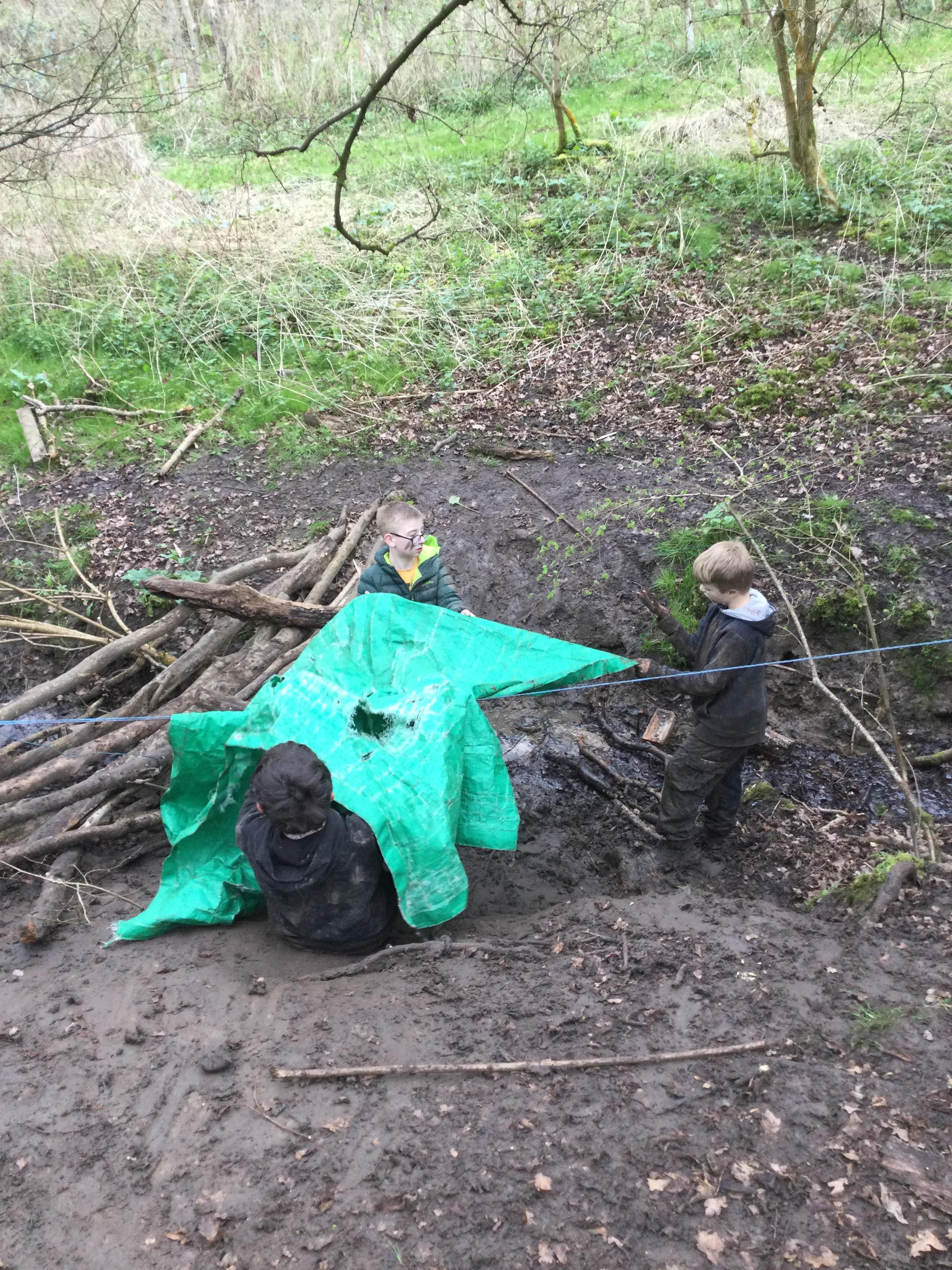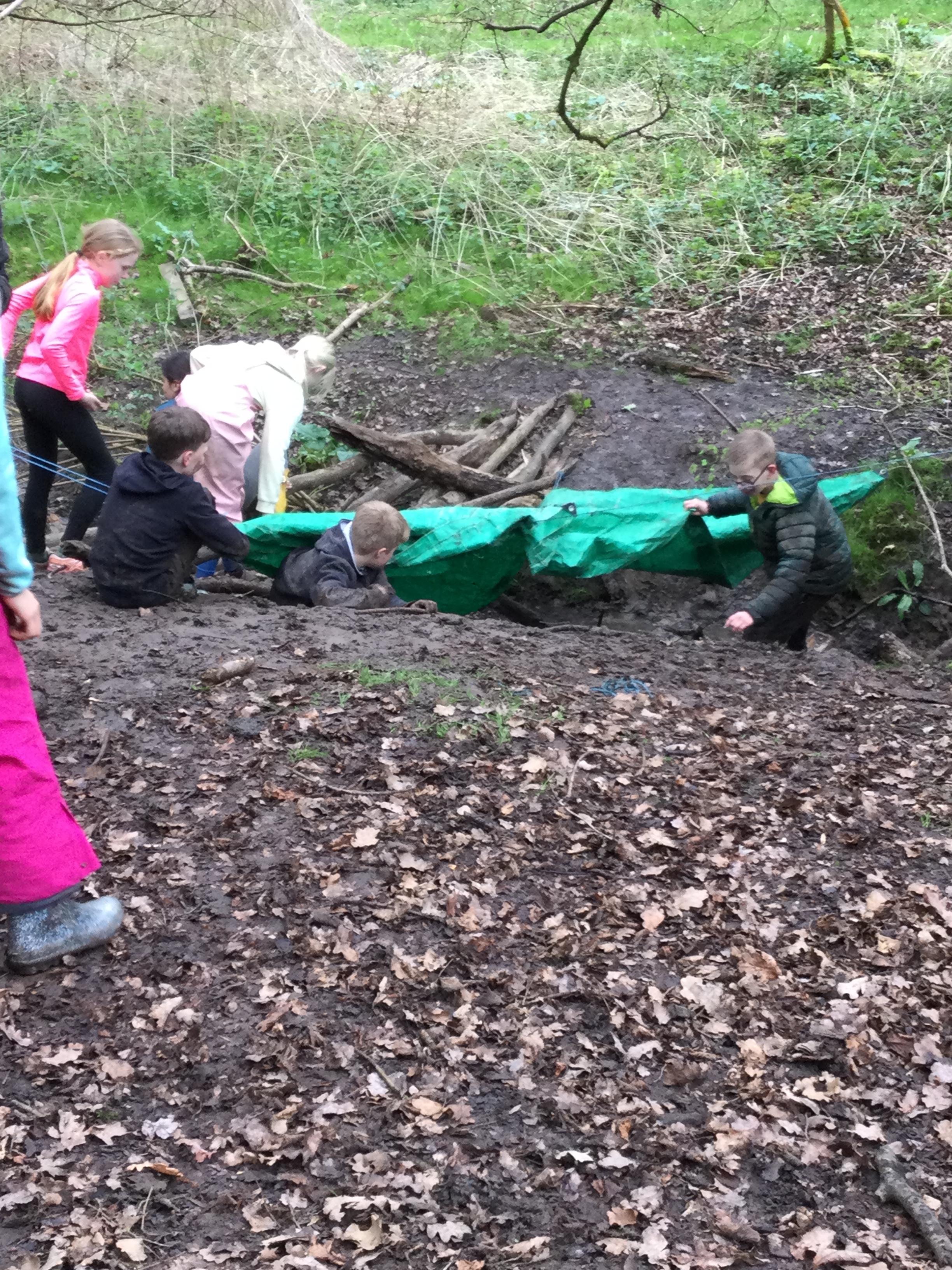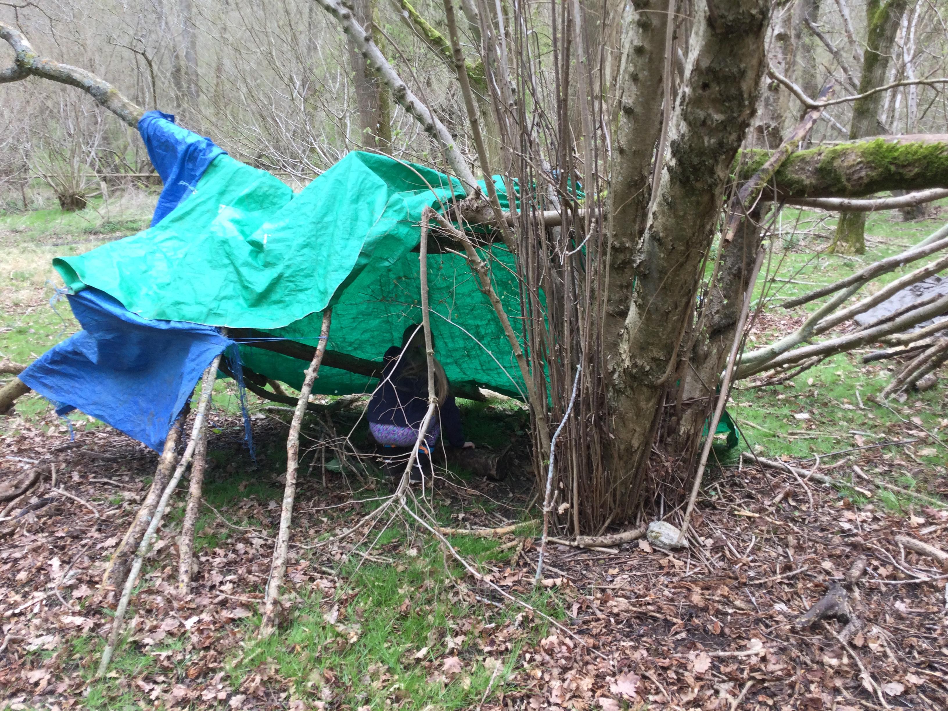 After that, they got creative and built dens in the forest using natural resources, strings, ropes, and tarpaulin. Different groups created very different shelters with their own specificity. One of the groups did an amazing recycling work; it's unimaginable all the abandoned objects we can find in the forest. Some dens were really fancy, with different rooms and even a garage! Some children pretended to make nettle tea, adding to the fun. One group even built their den by the stream. Everyone loved getting muddy while building and playing.