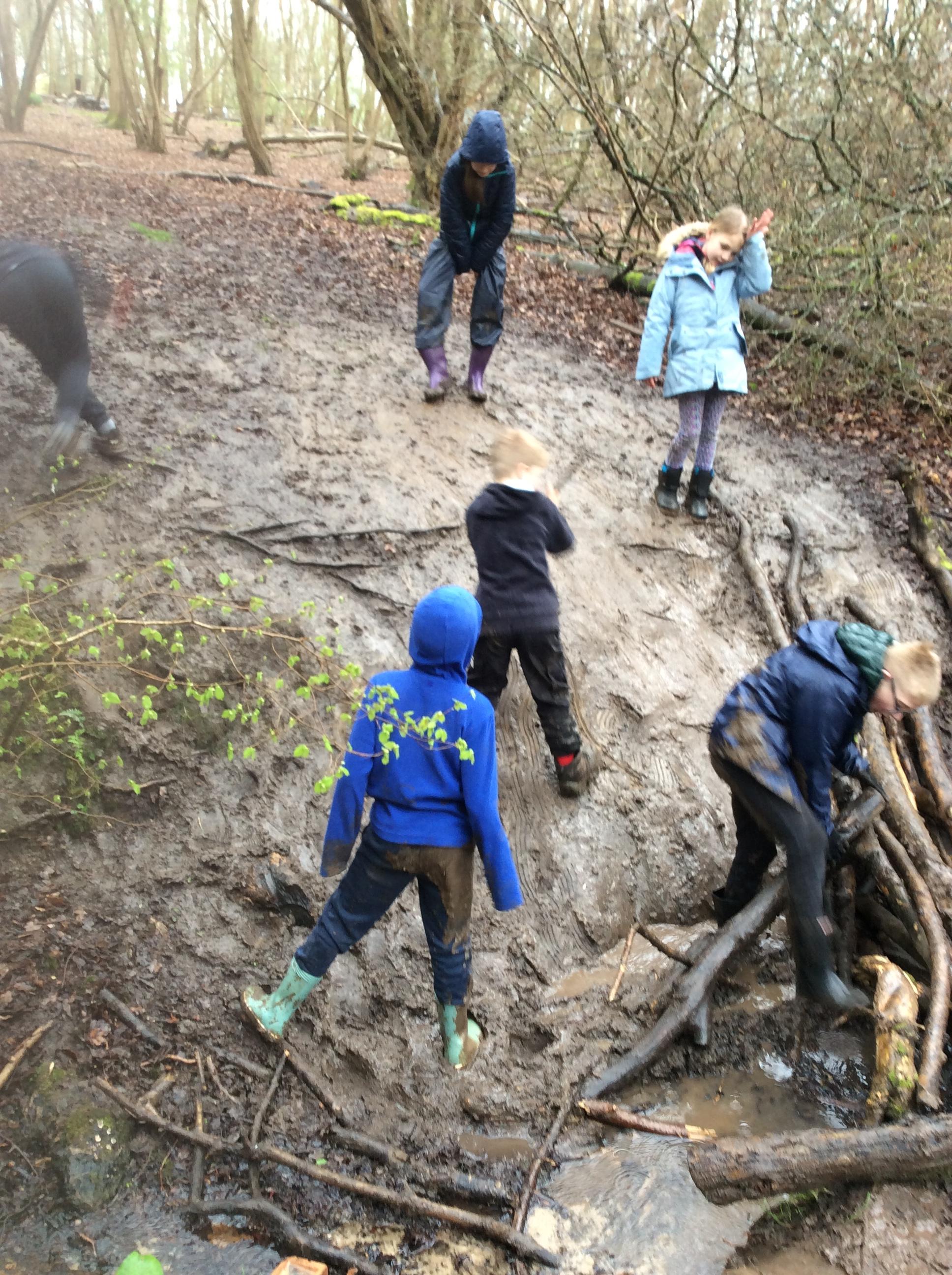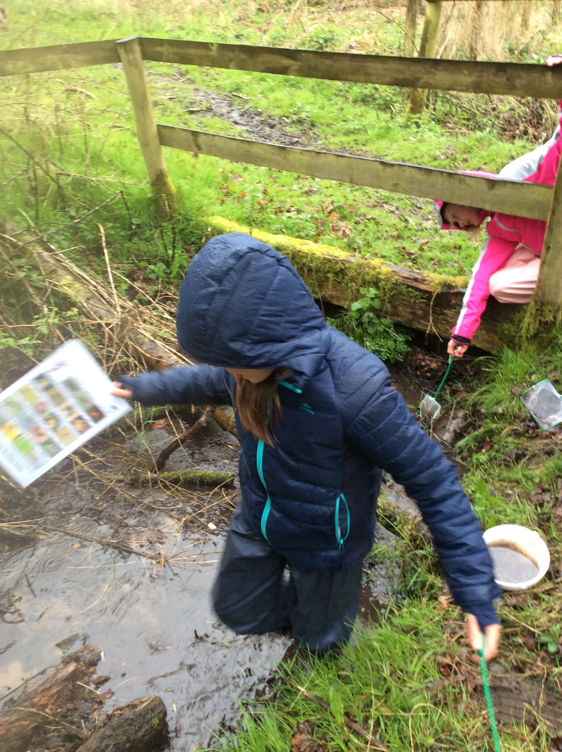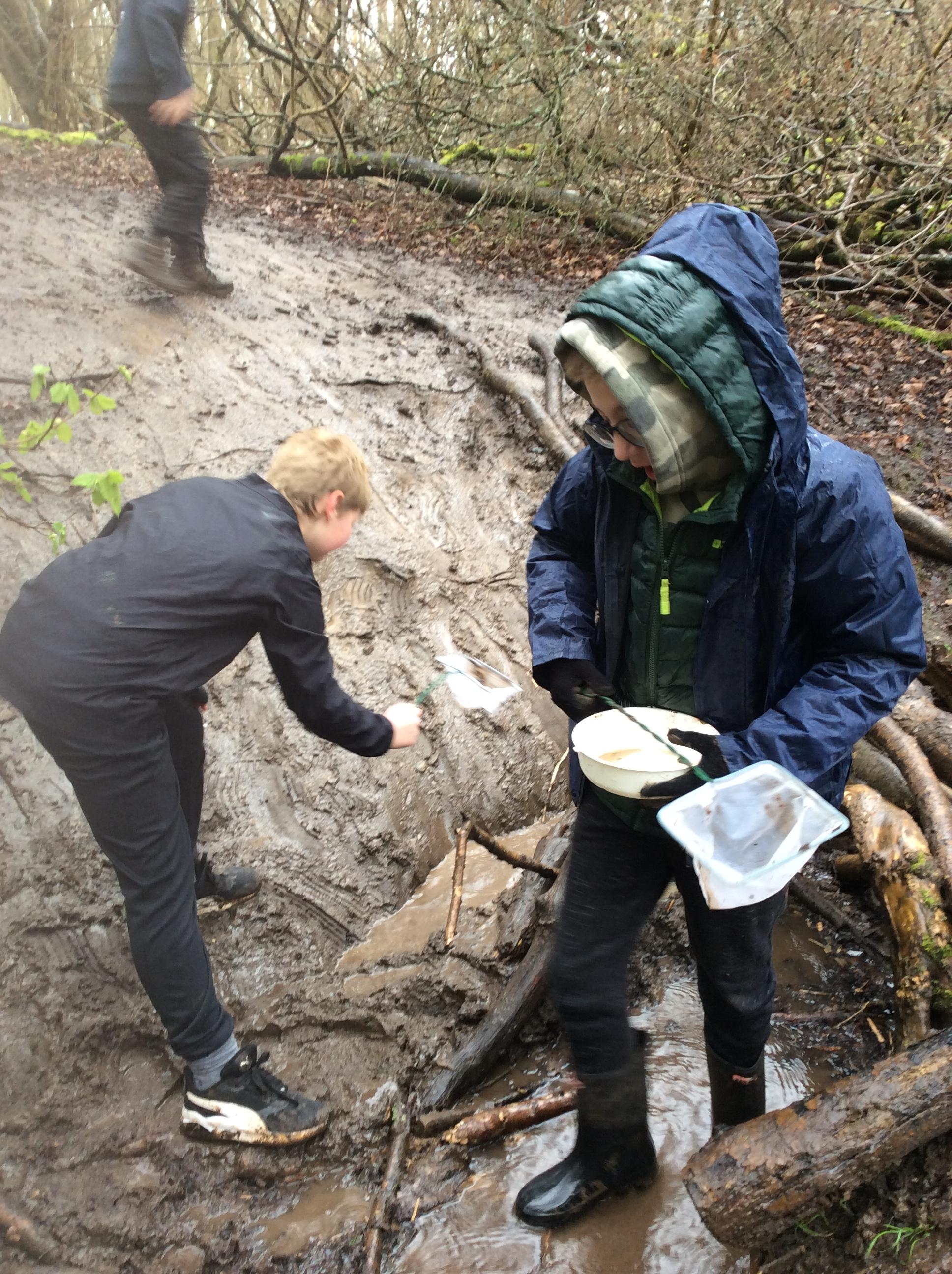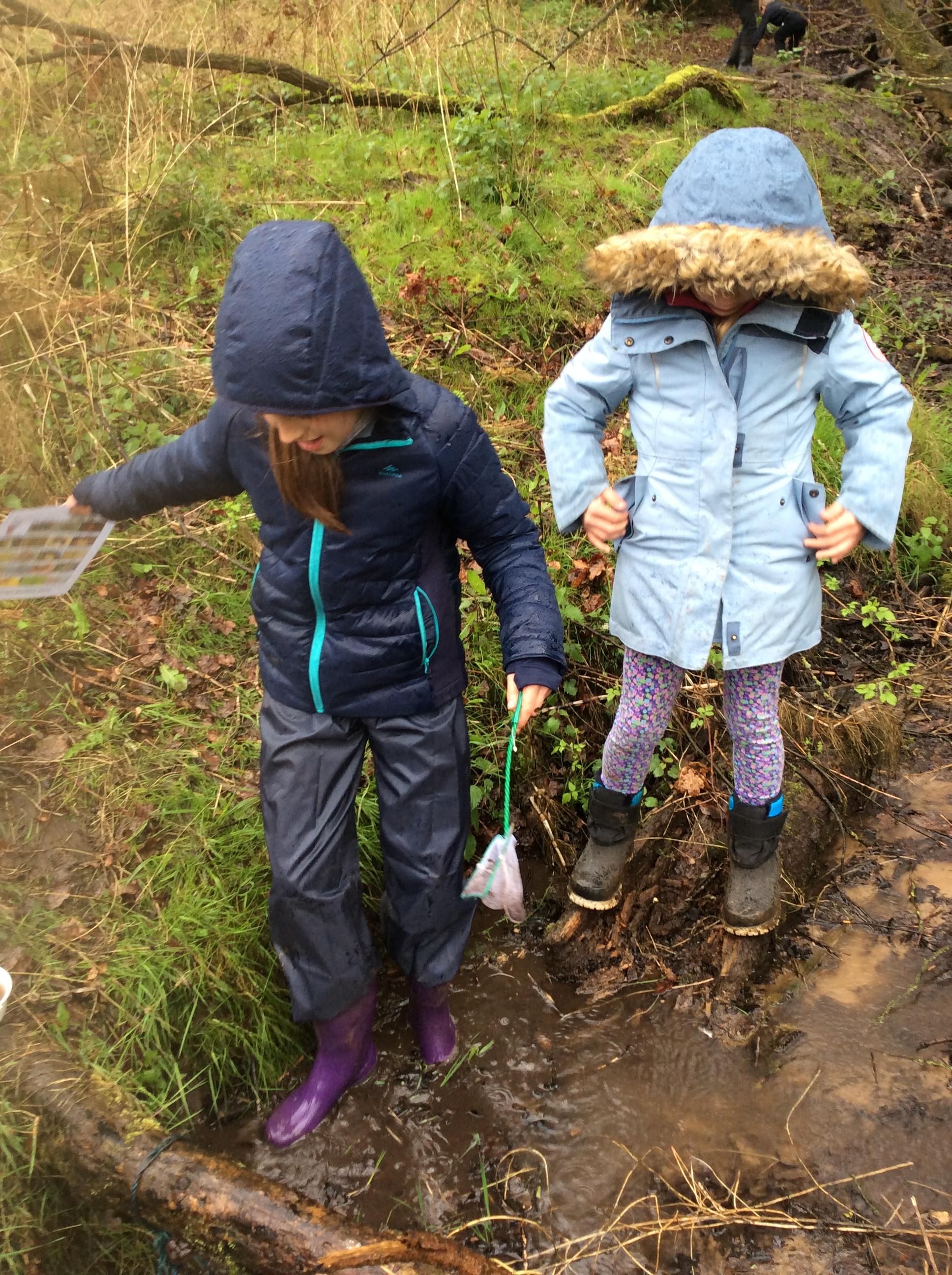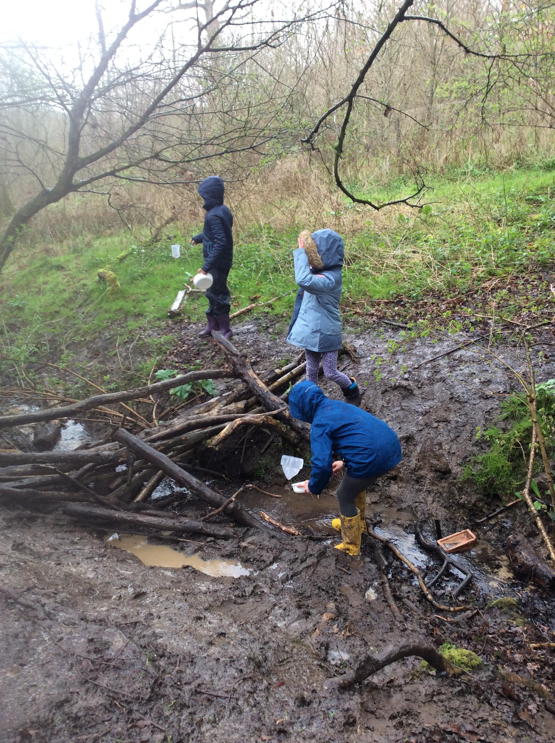 During day 2, it rained a lot, but the children didn't mind. They were still excited to go back to the muddy forest. They couldn't wait to get back next to the stream and explore. Some children dipped their nets in the water, but they didn't find many creatures. Maybe the big boots scared them away!