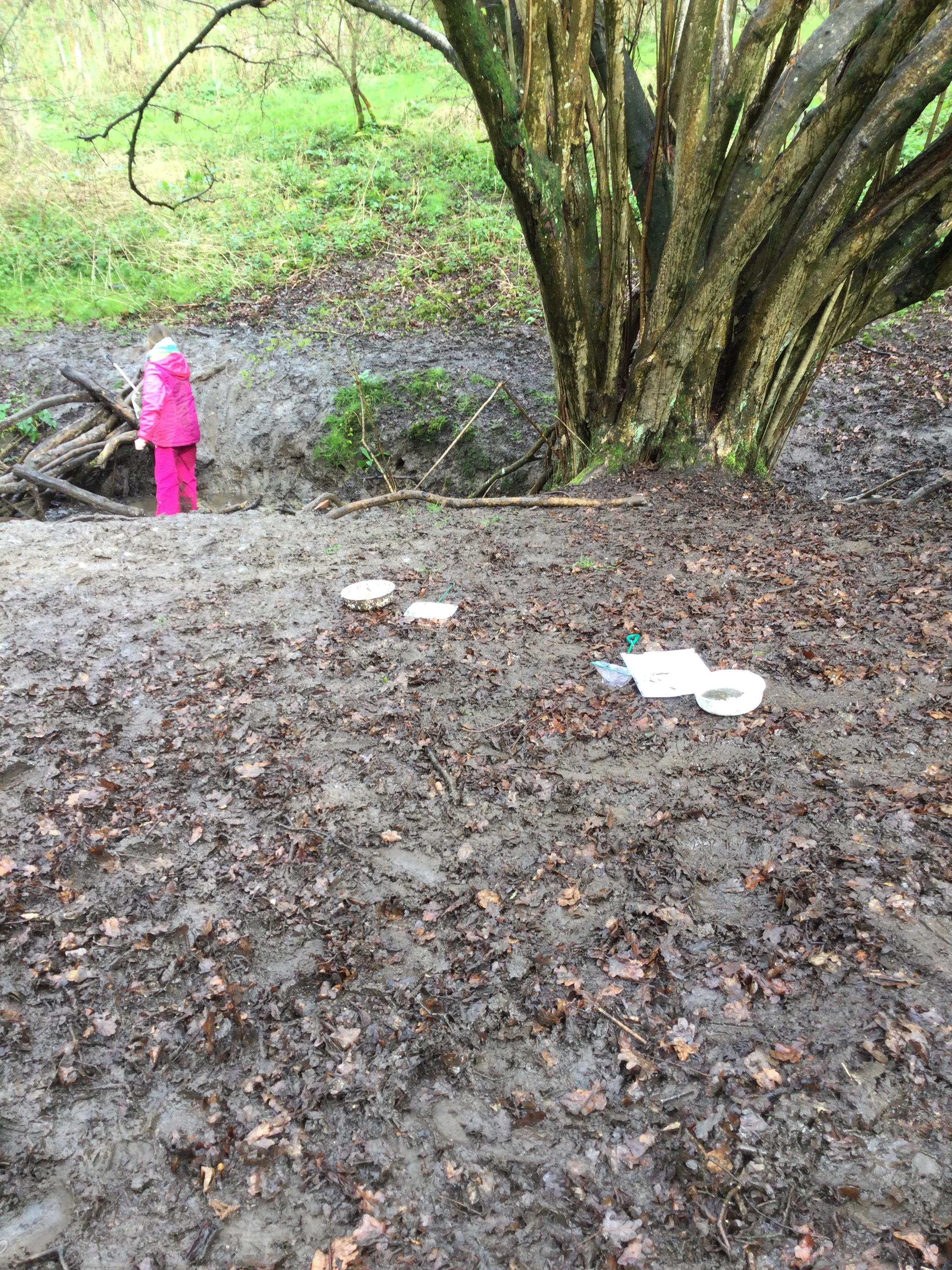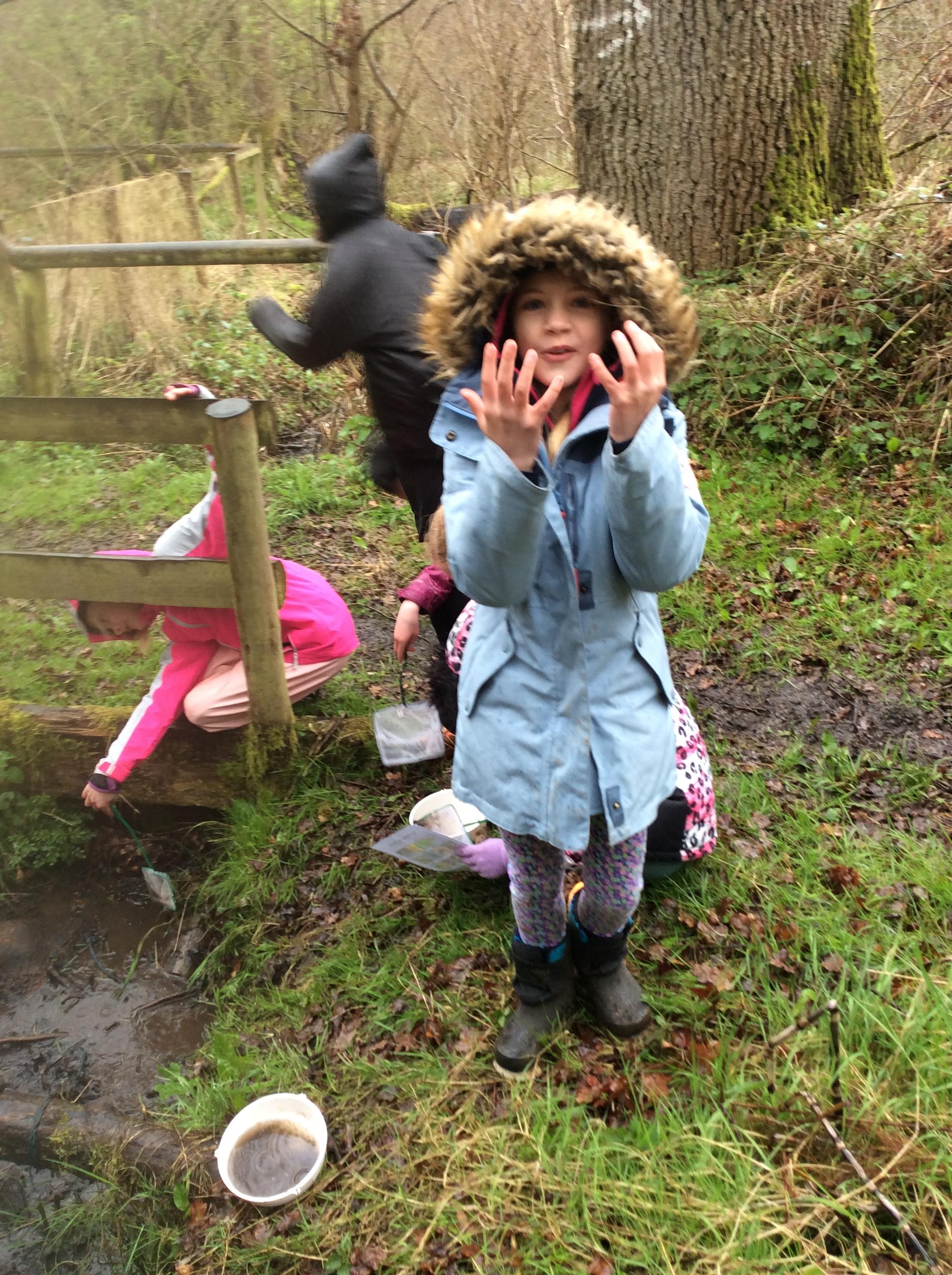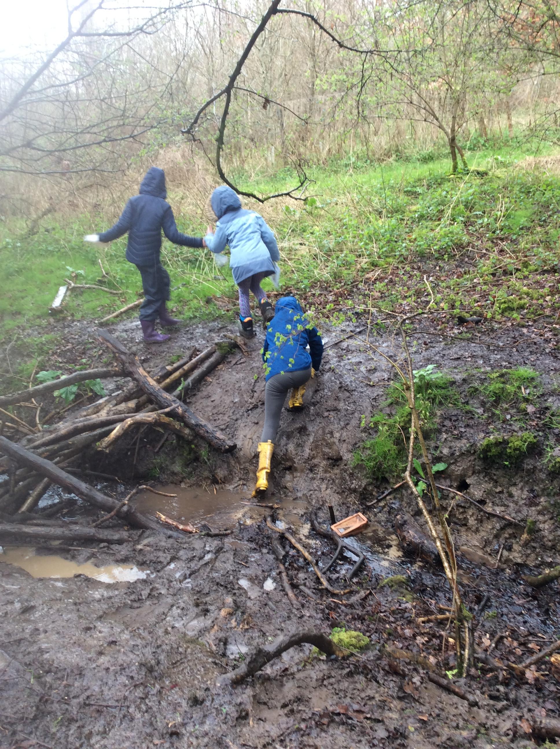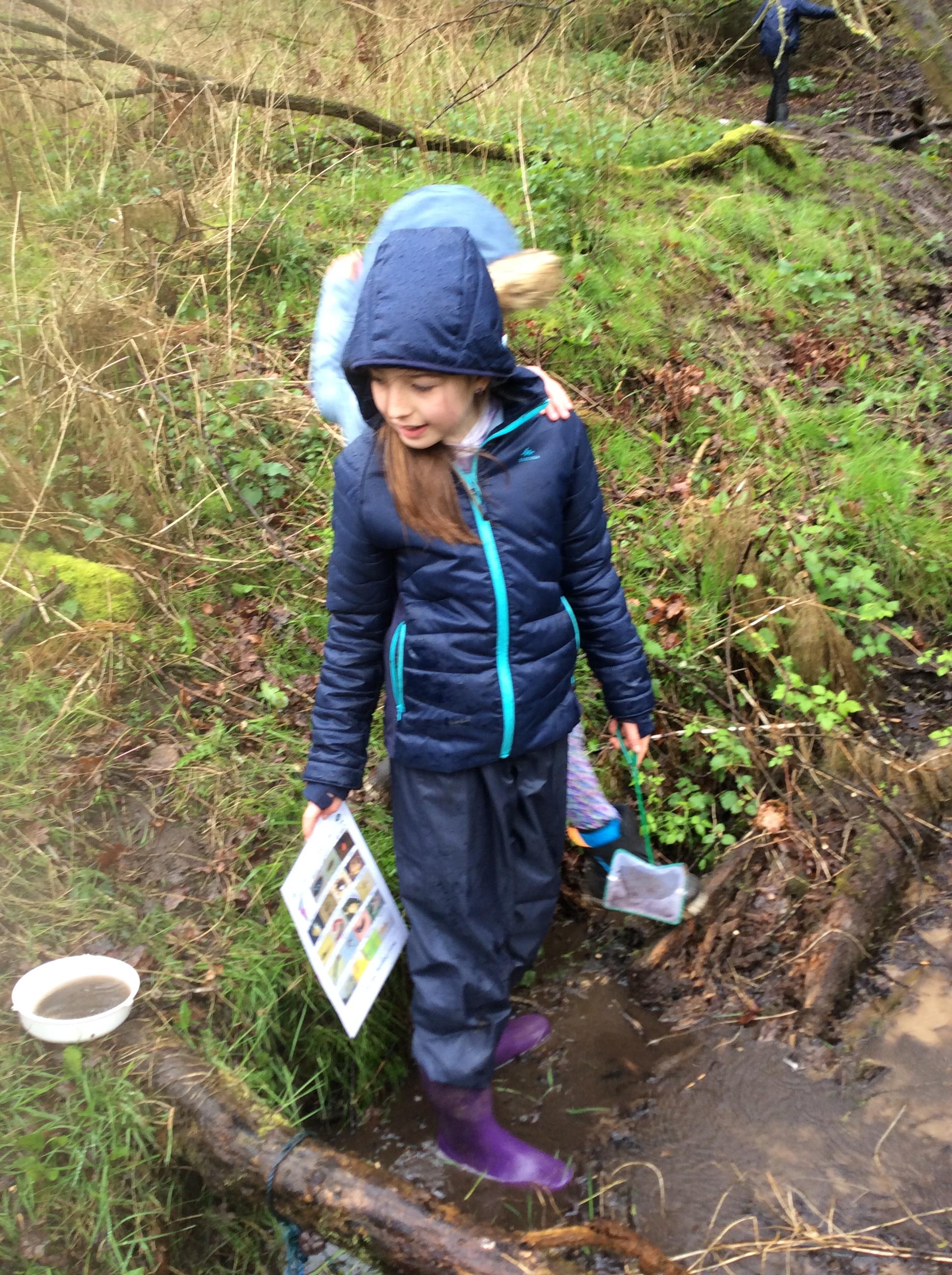 During day 2, it rained a lot, but the children didn't mind. They were still excited to go back to the muddy forest. They couldn't wait to get back next to the stream and explore. Some children dipped their nets in the water, but they didn't find many creatures. Maybe the big boots scared them away!