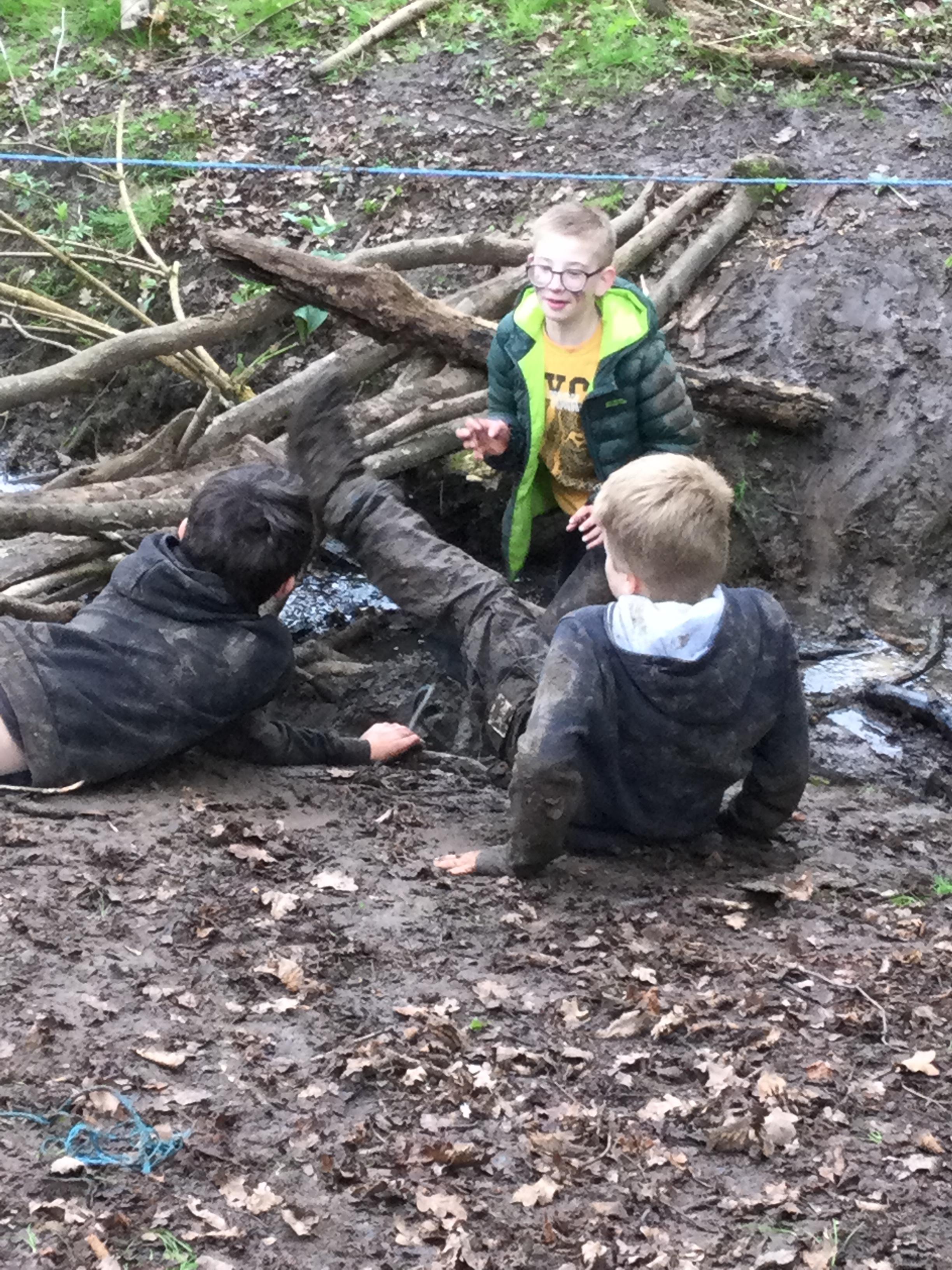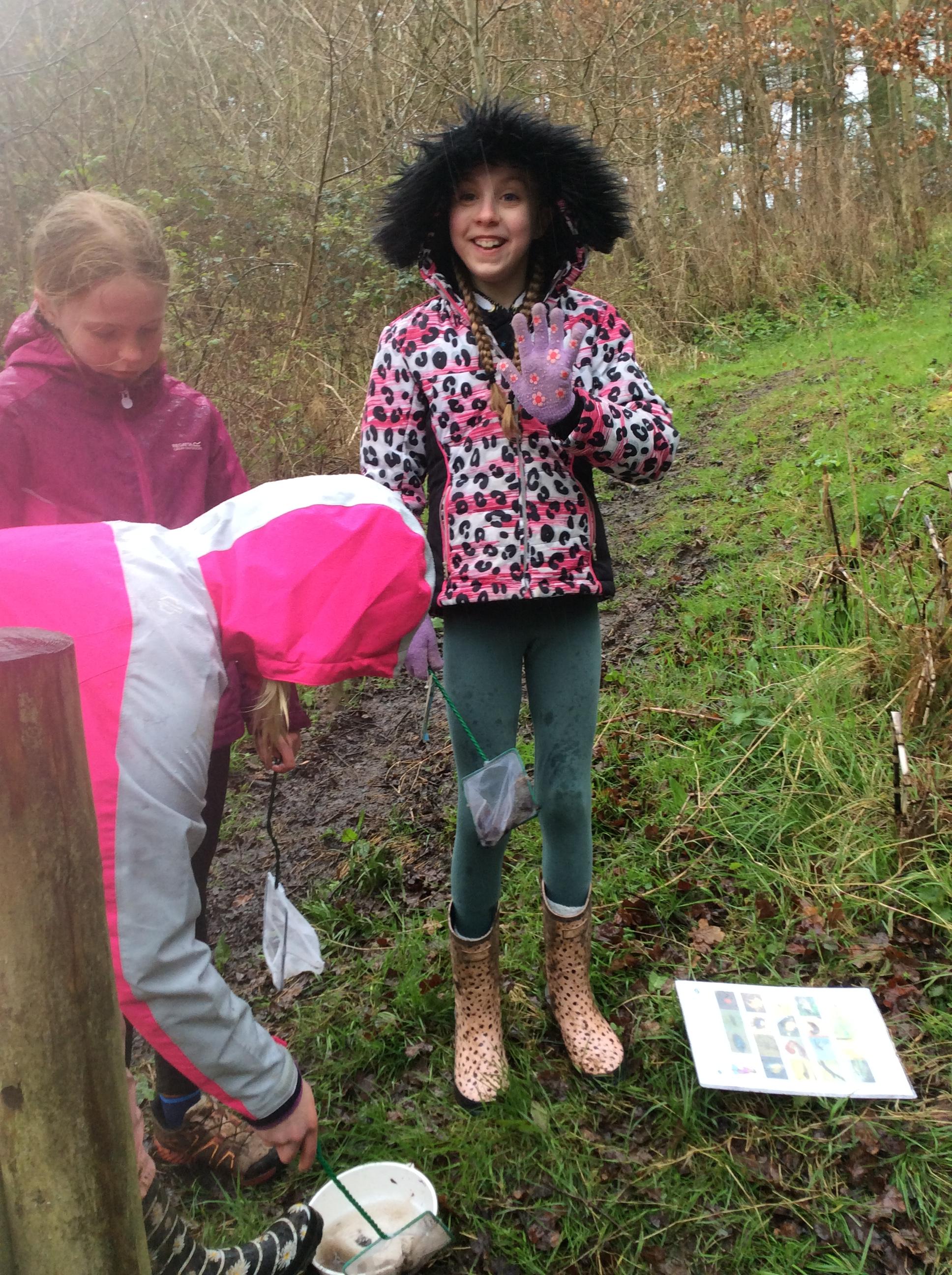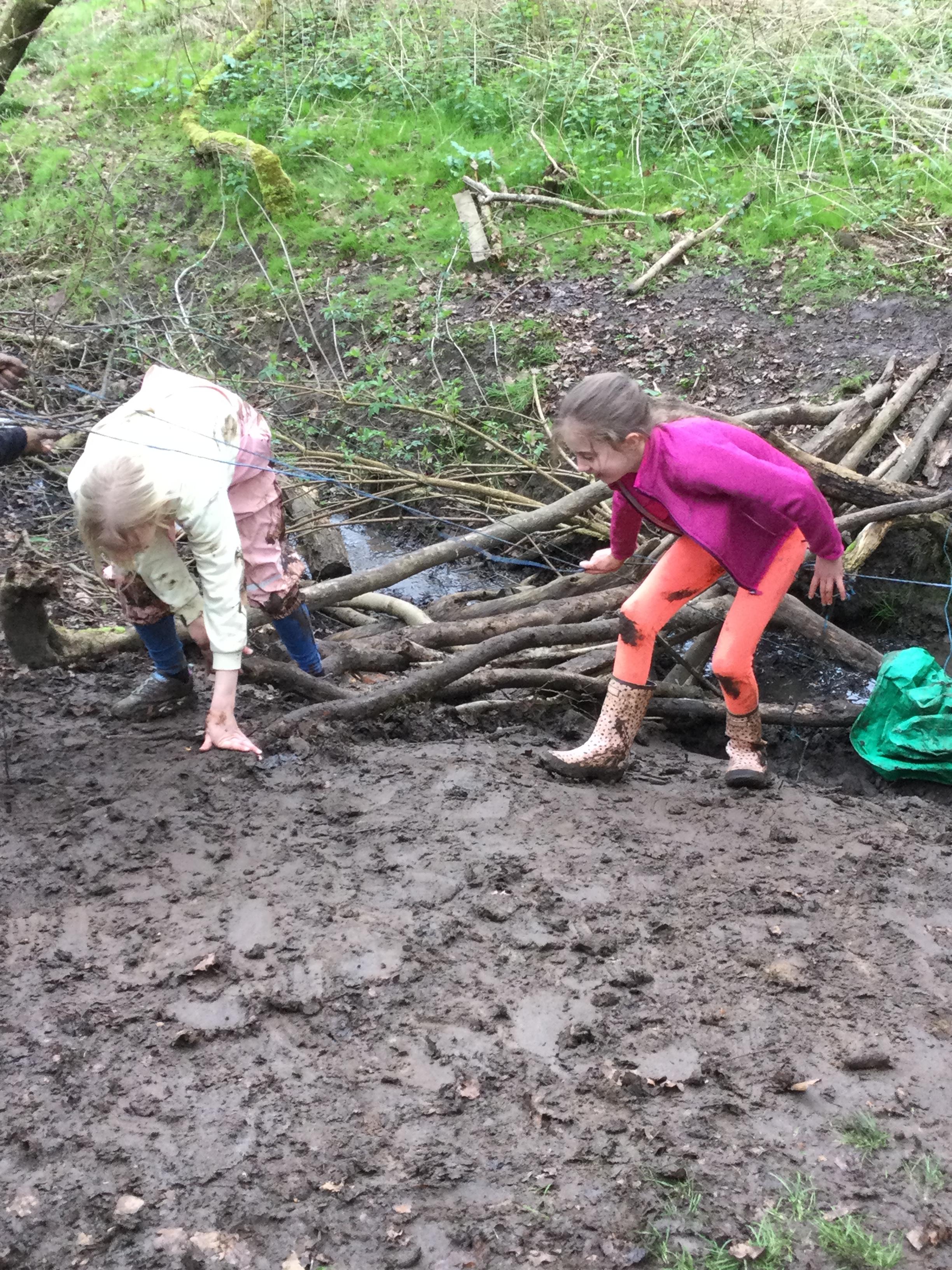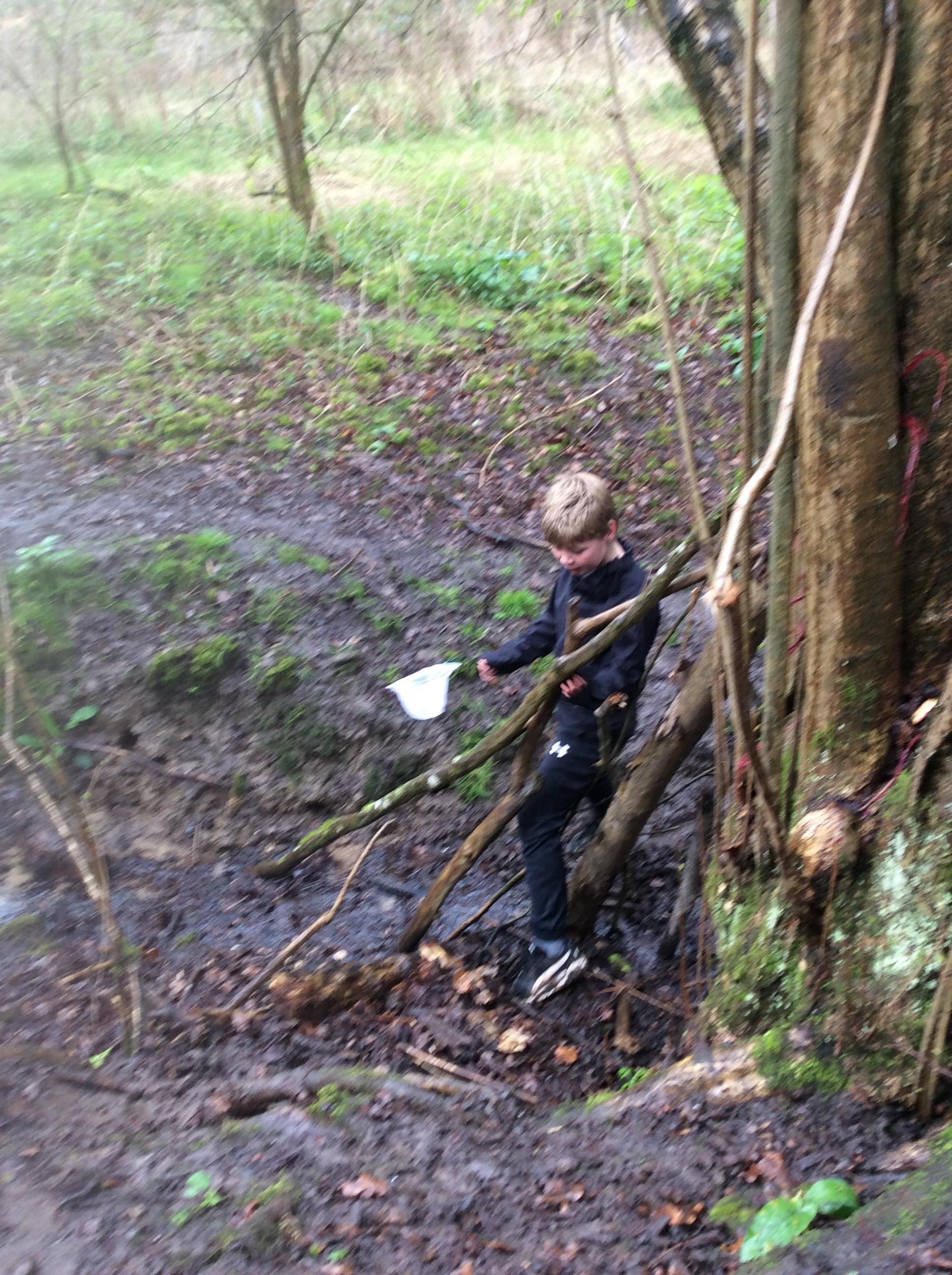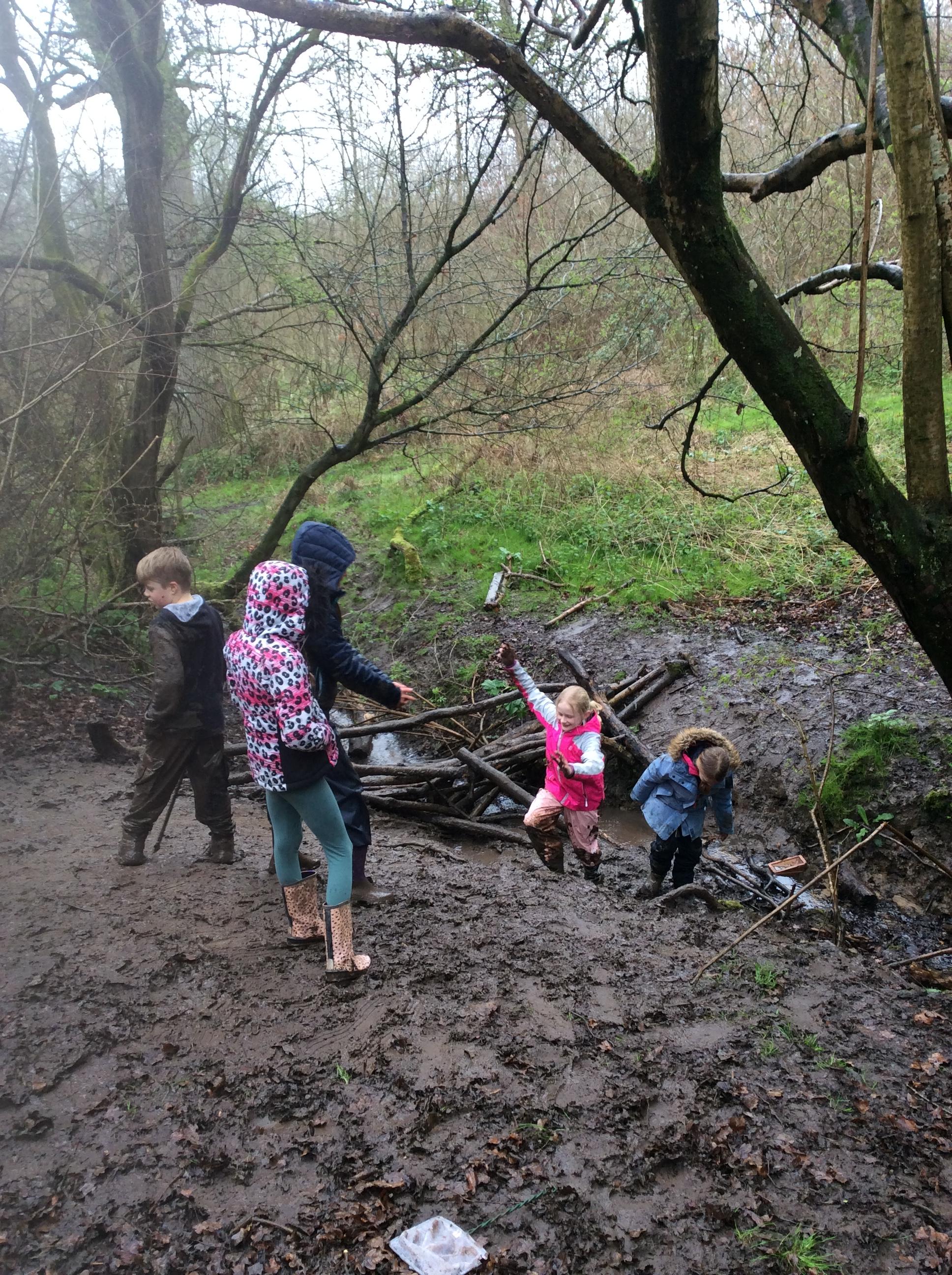 During day 2, it rained a lot, but the children didn't mind. They were still excited to go back to the muddy forest. They couldn't wait to get back next to the stream and explore. Some children dipped their nets in the water, but they didn't find many creatures. Maybe the big boots scared them away!
