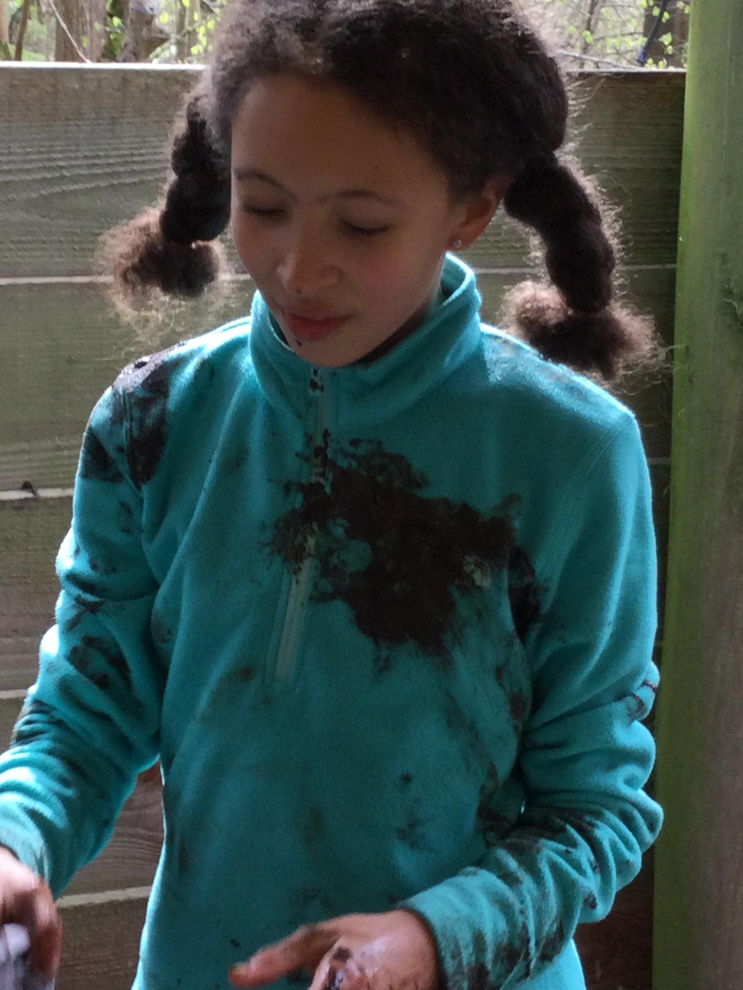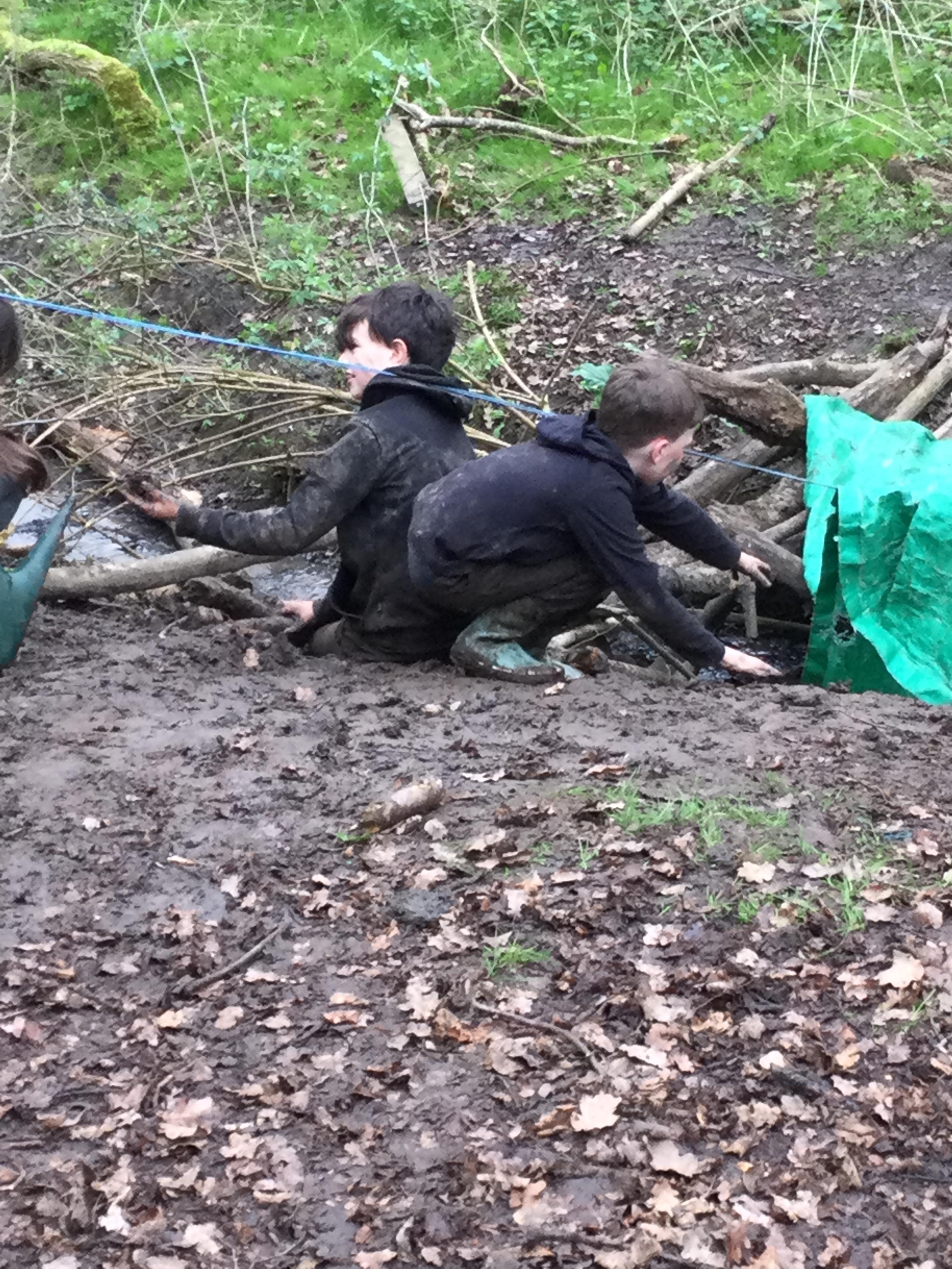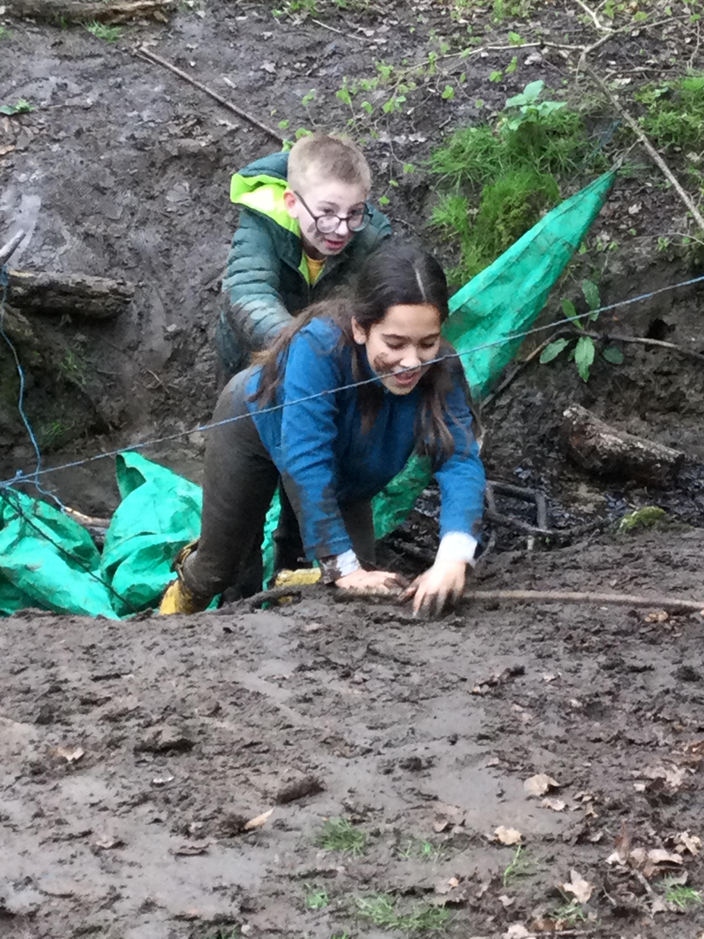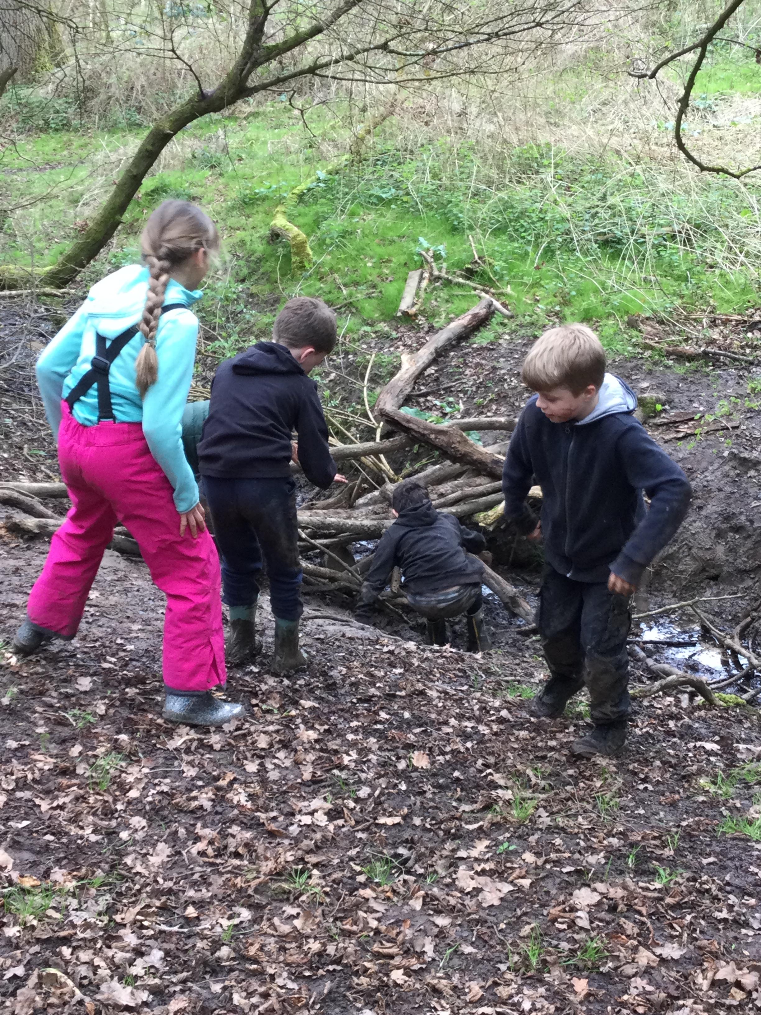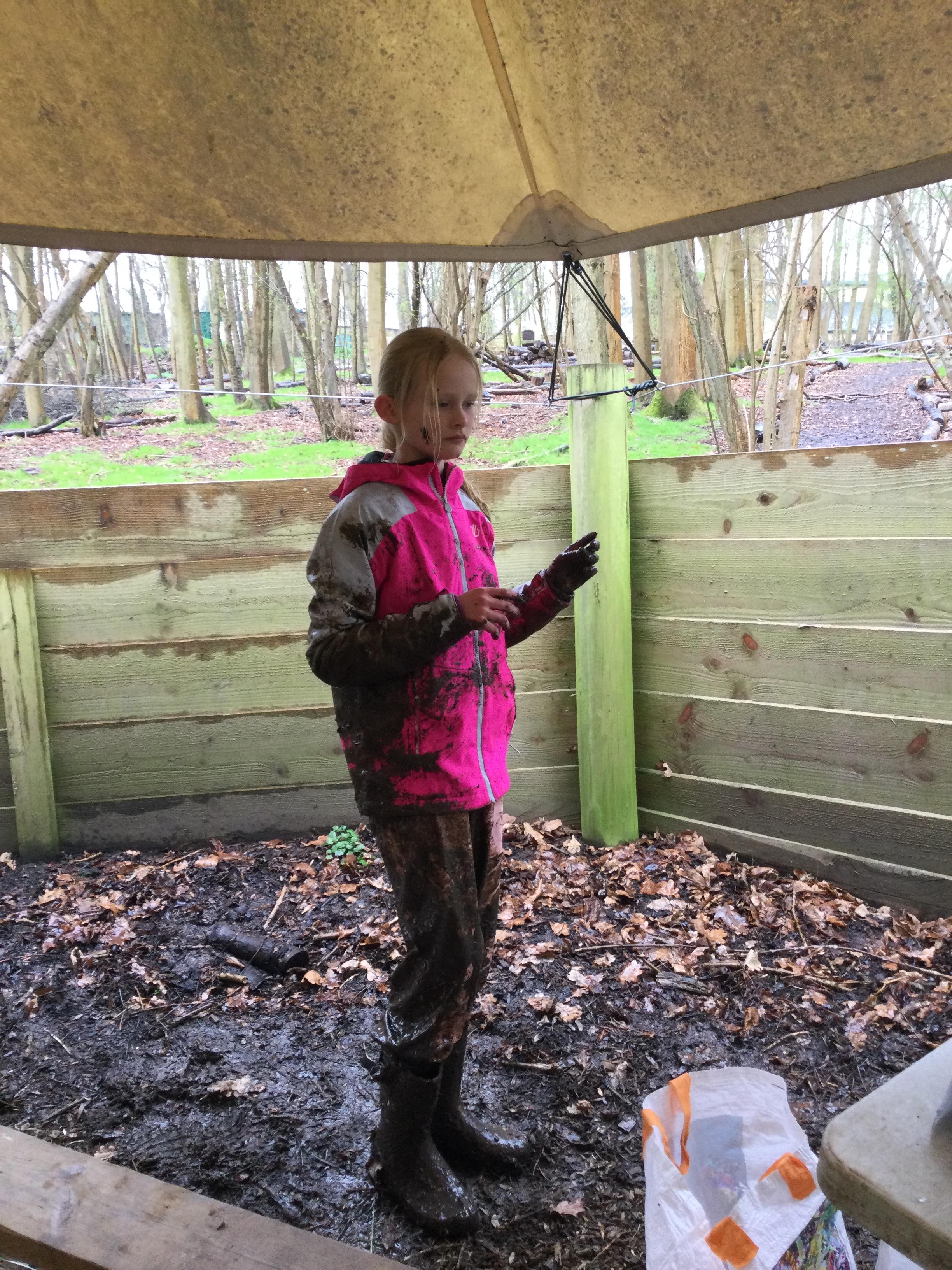 During day 2, it rained a lot, but the children didn't mind. They were still excited to go back to the muddy forest. They couldn't wait to get back next to the stream and explore. Some children dipped their nets in the water, but they didn't find many creatures. Maybe the big boots scared them away!