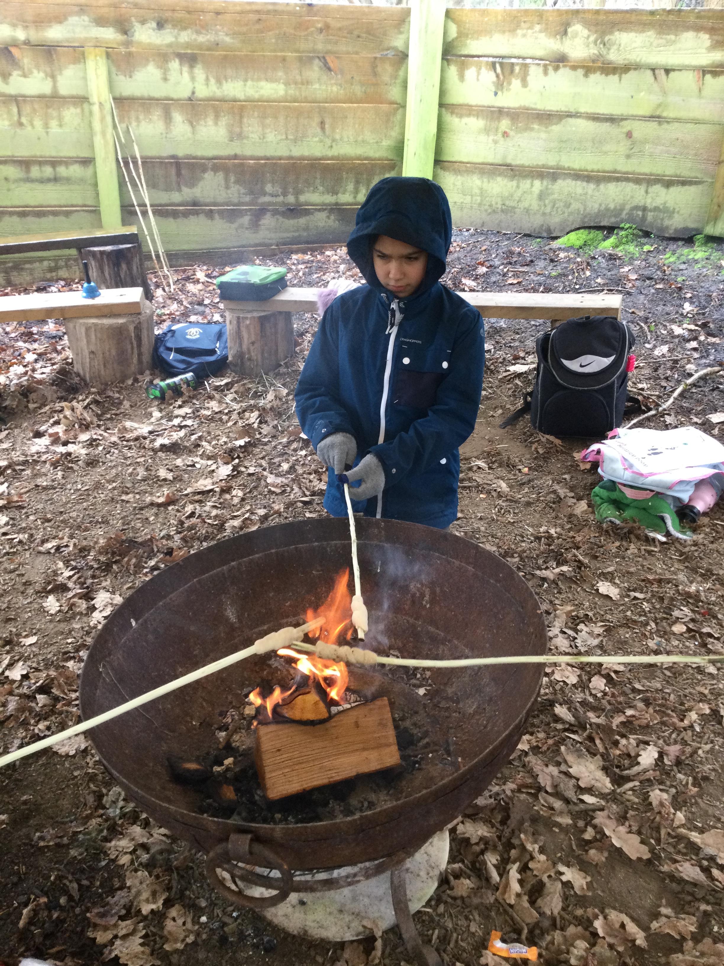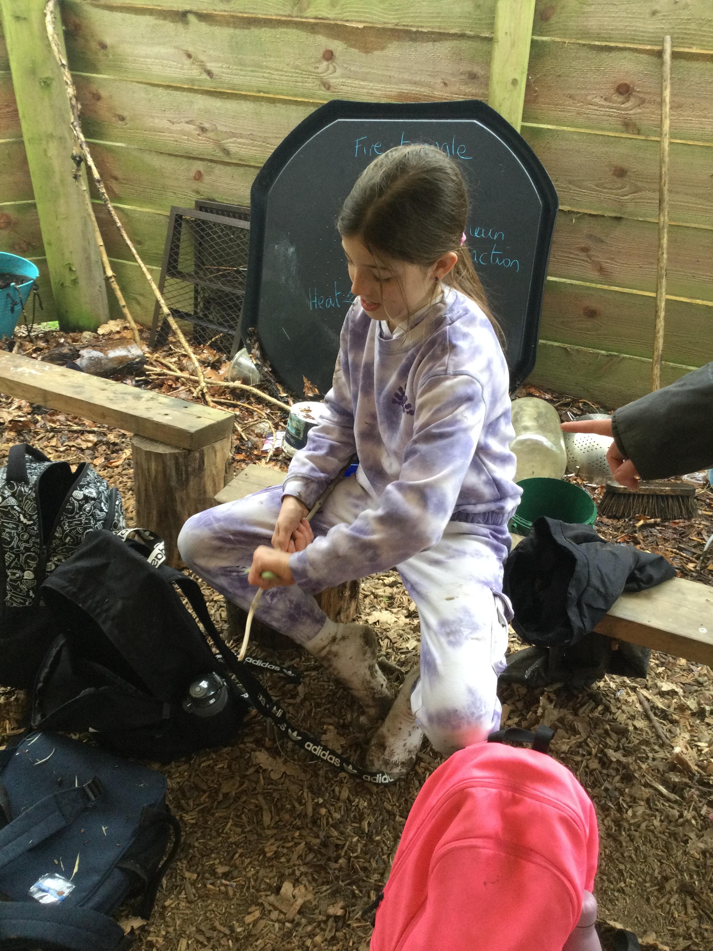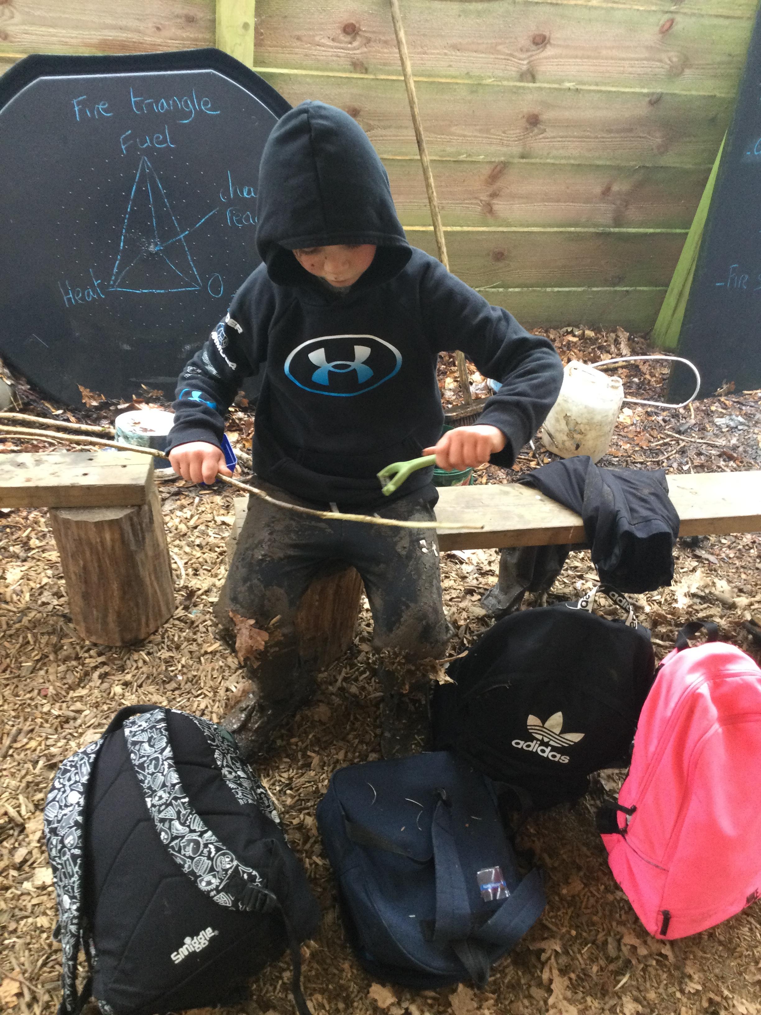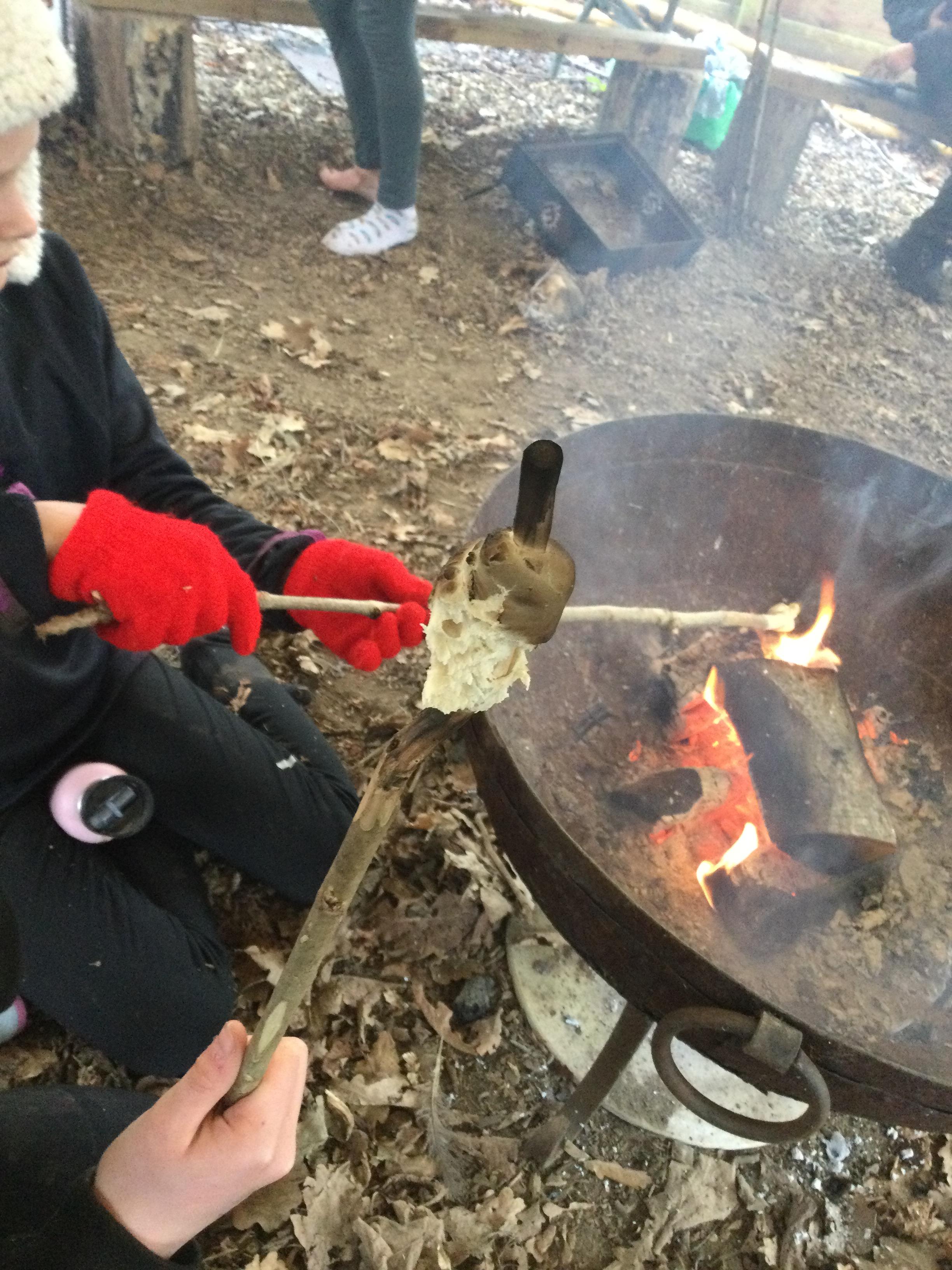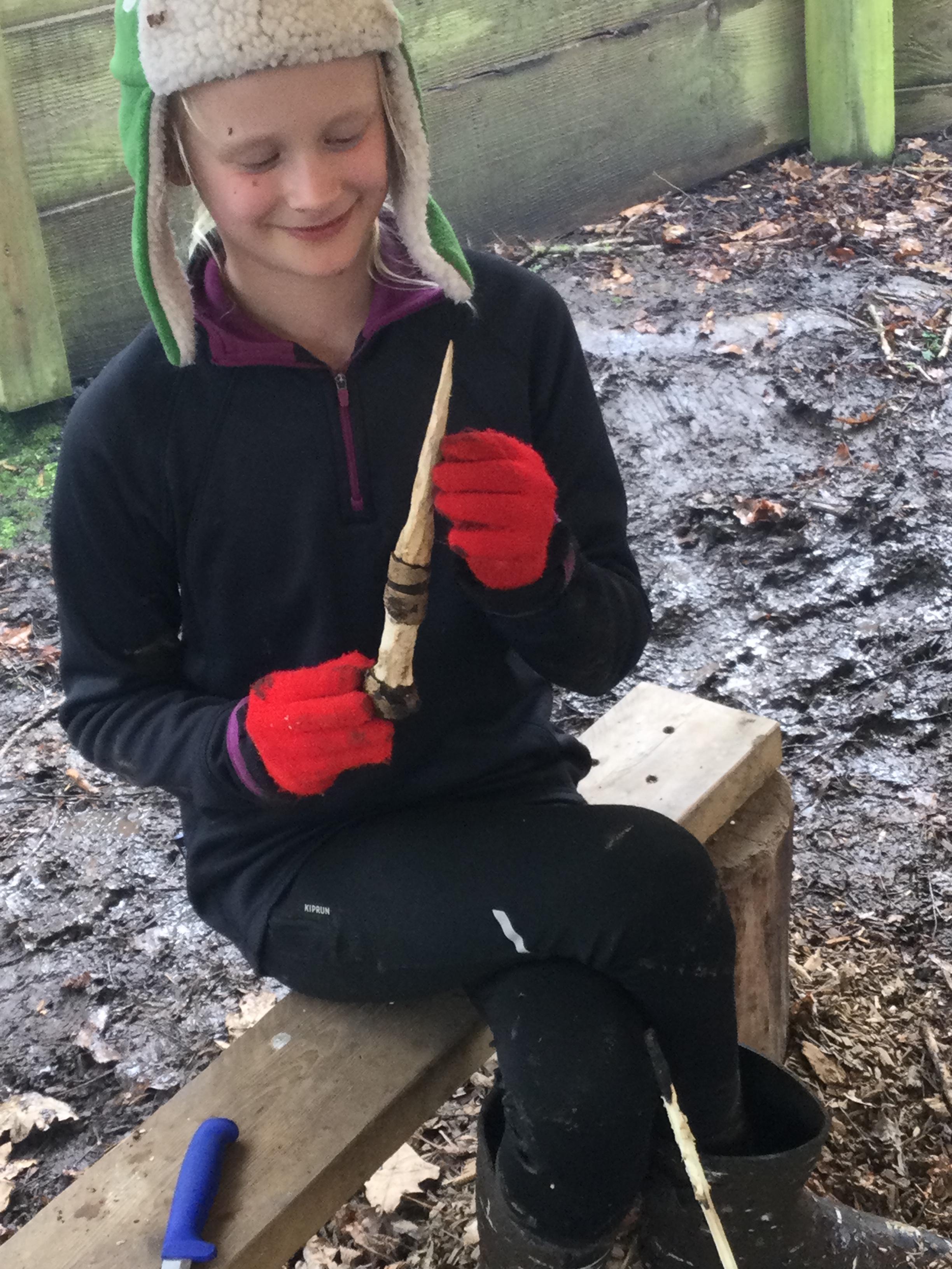 They warmed up by the fire and baked ash bread on sticks, which was delicious! They made their cooking sticks with potato peelers. Some children even made magic wands and tools using knives safely, which required a lot of focus.