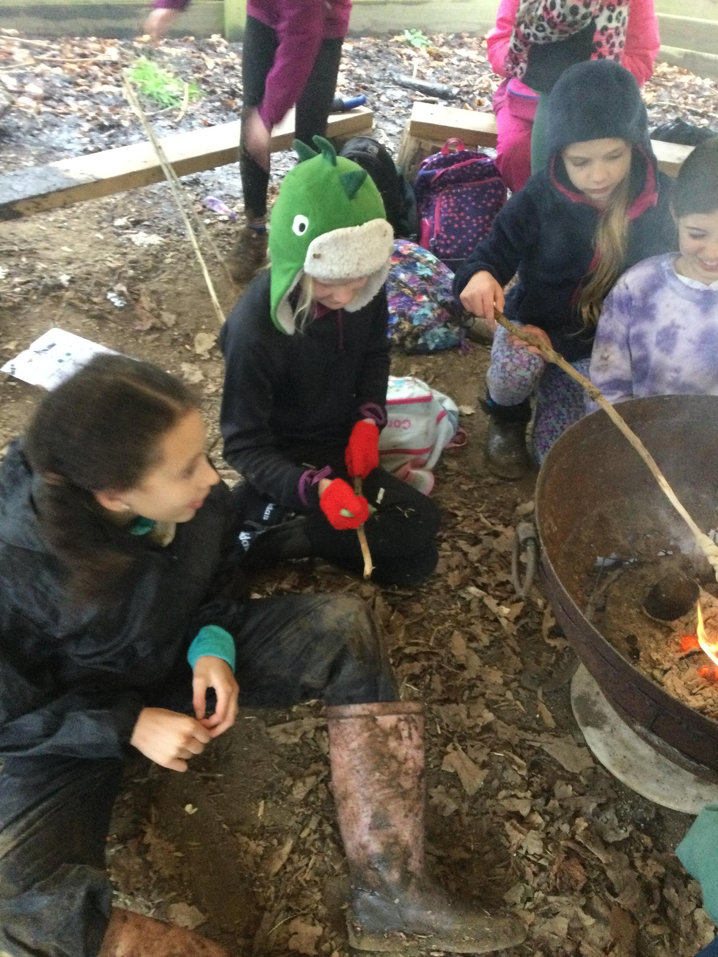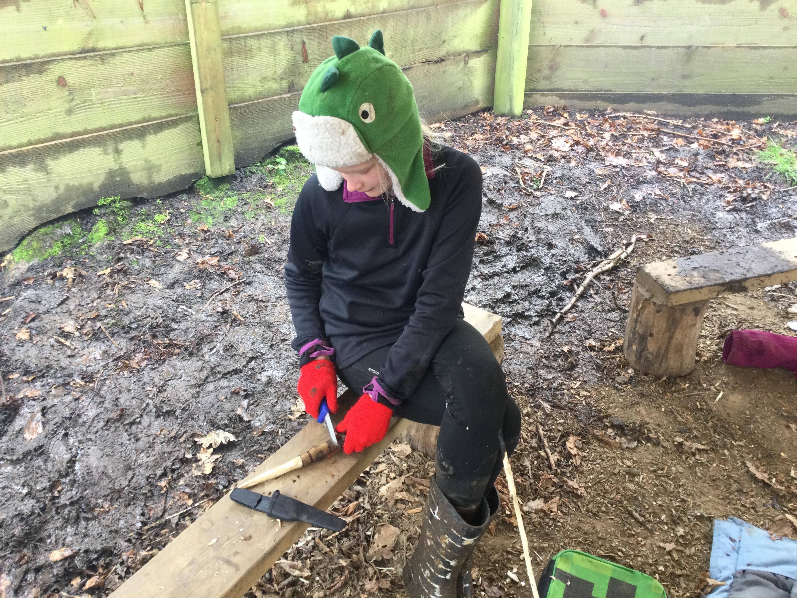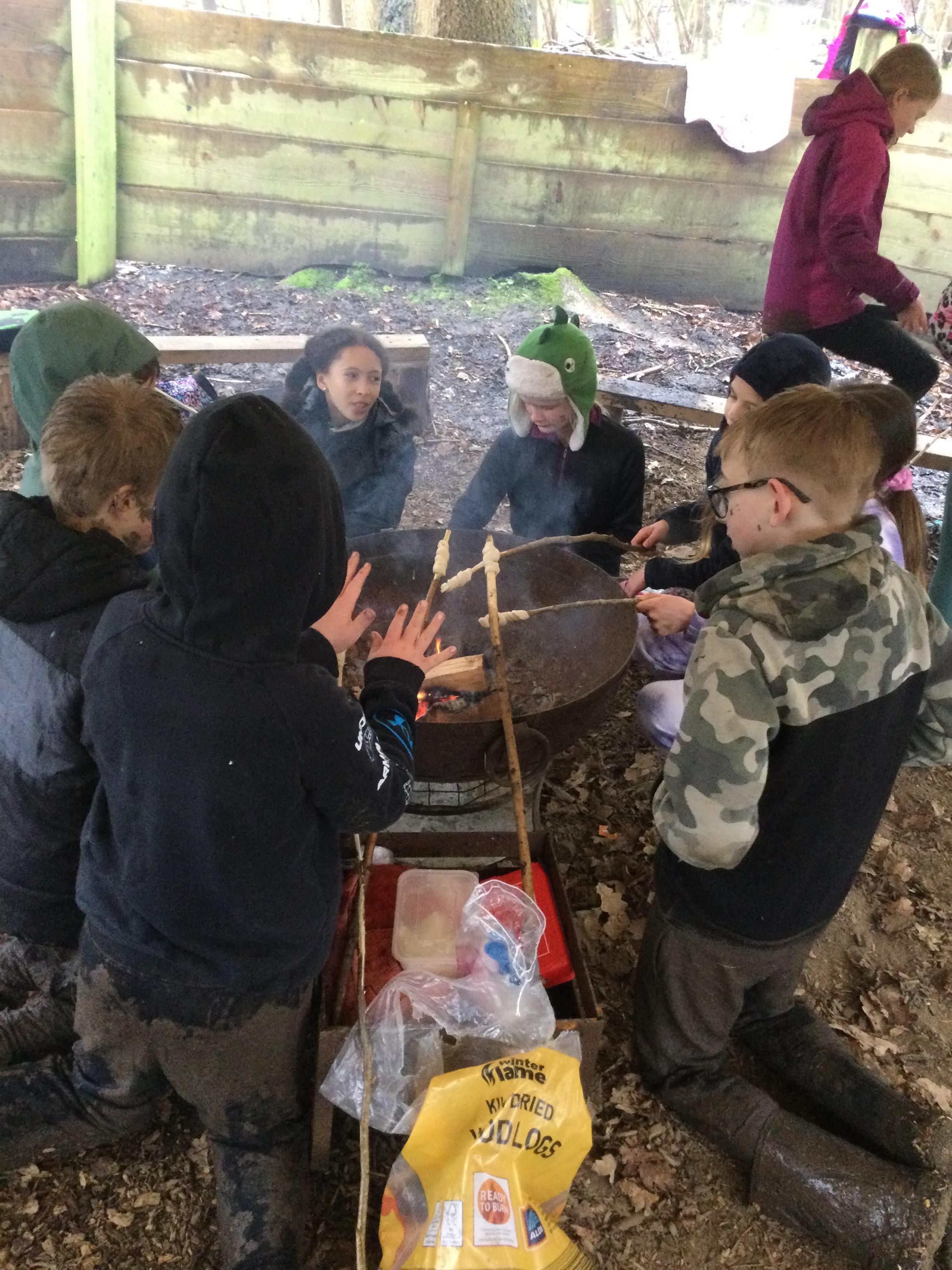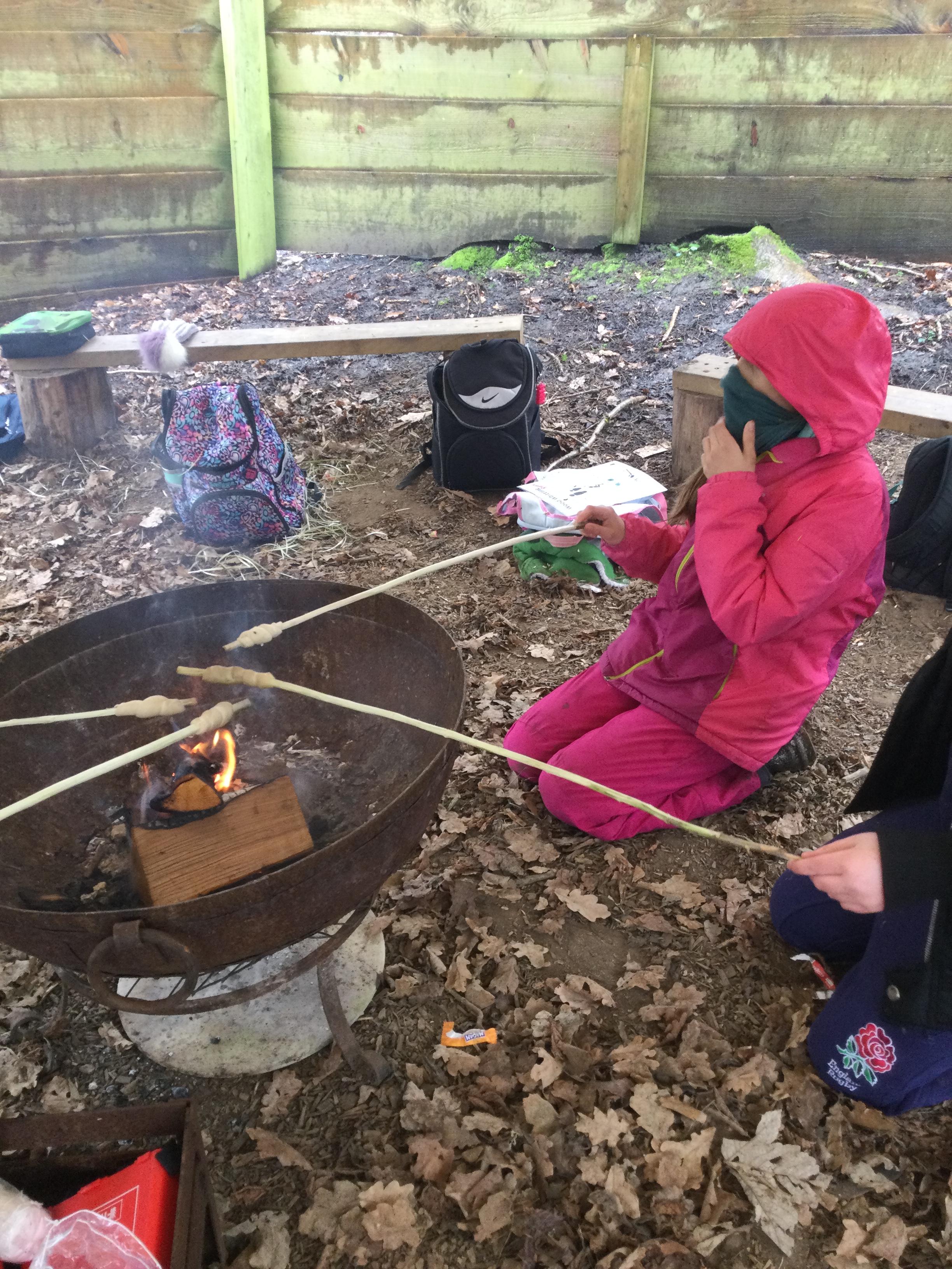 They warmed up by the fire and baked ash bread on sticks, which was delicious! They made their cooking sticks with potato peelers. Some children even made magic wands and tools using knives safely, which required a lot of focus.