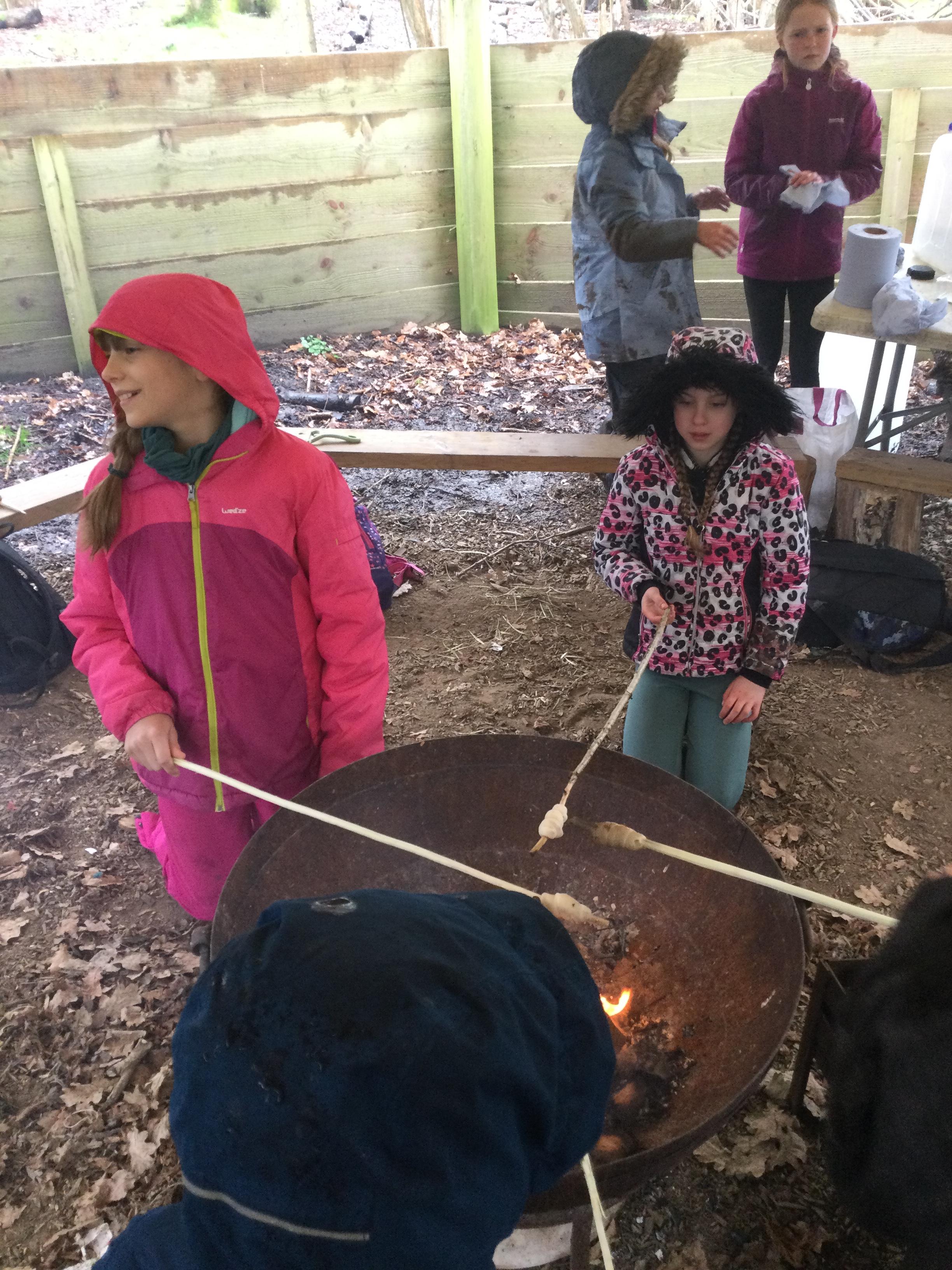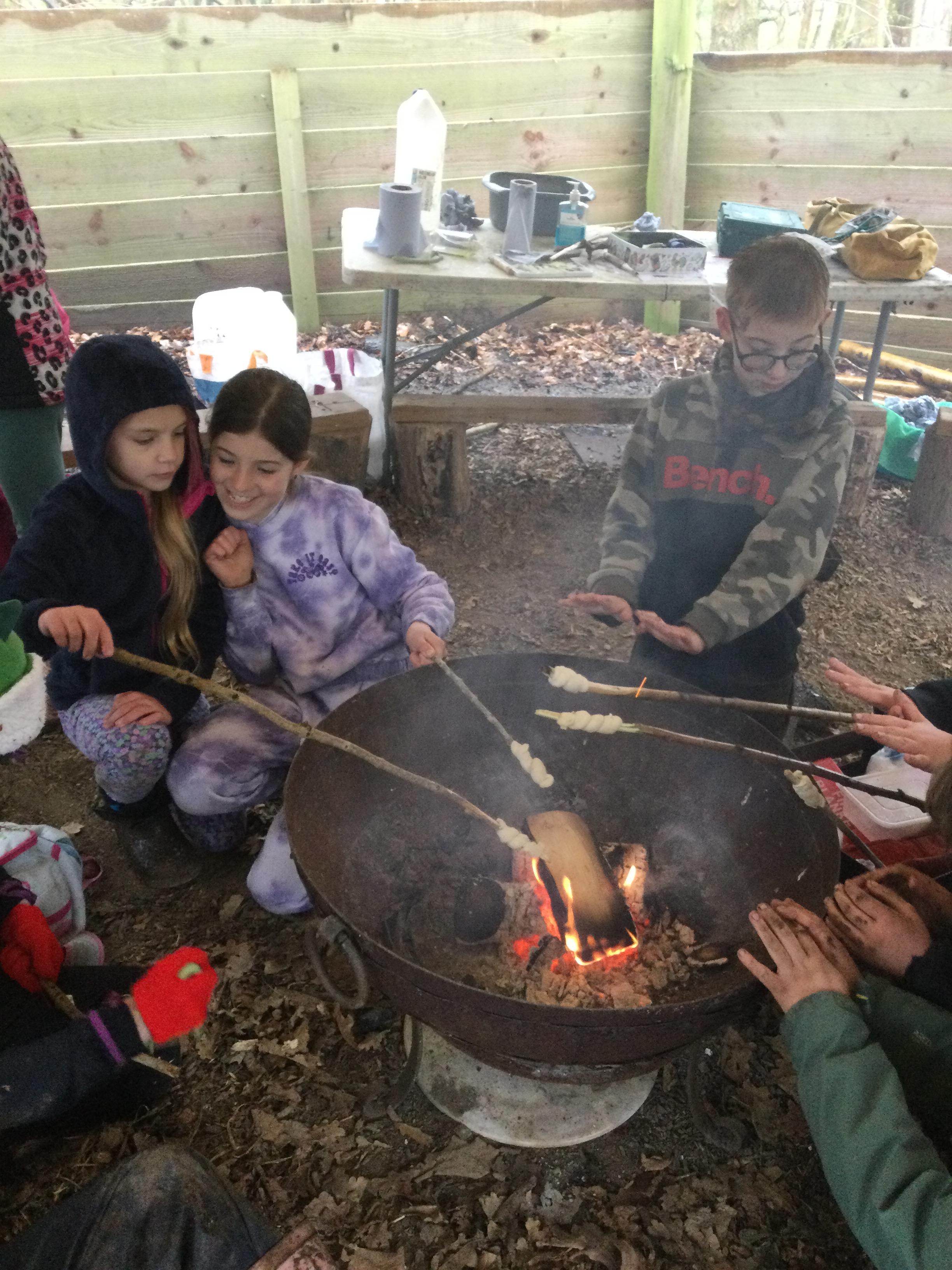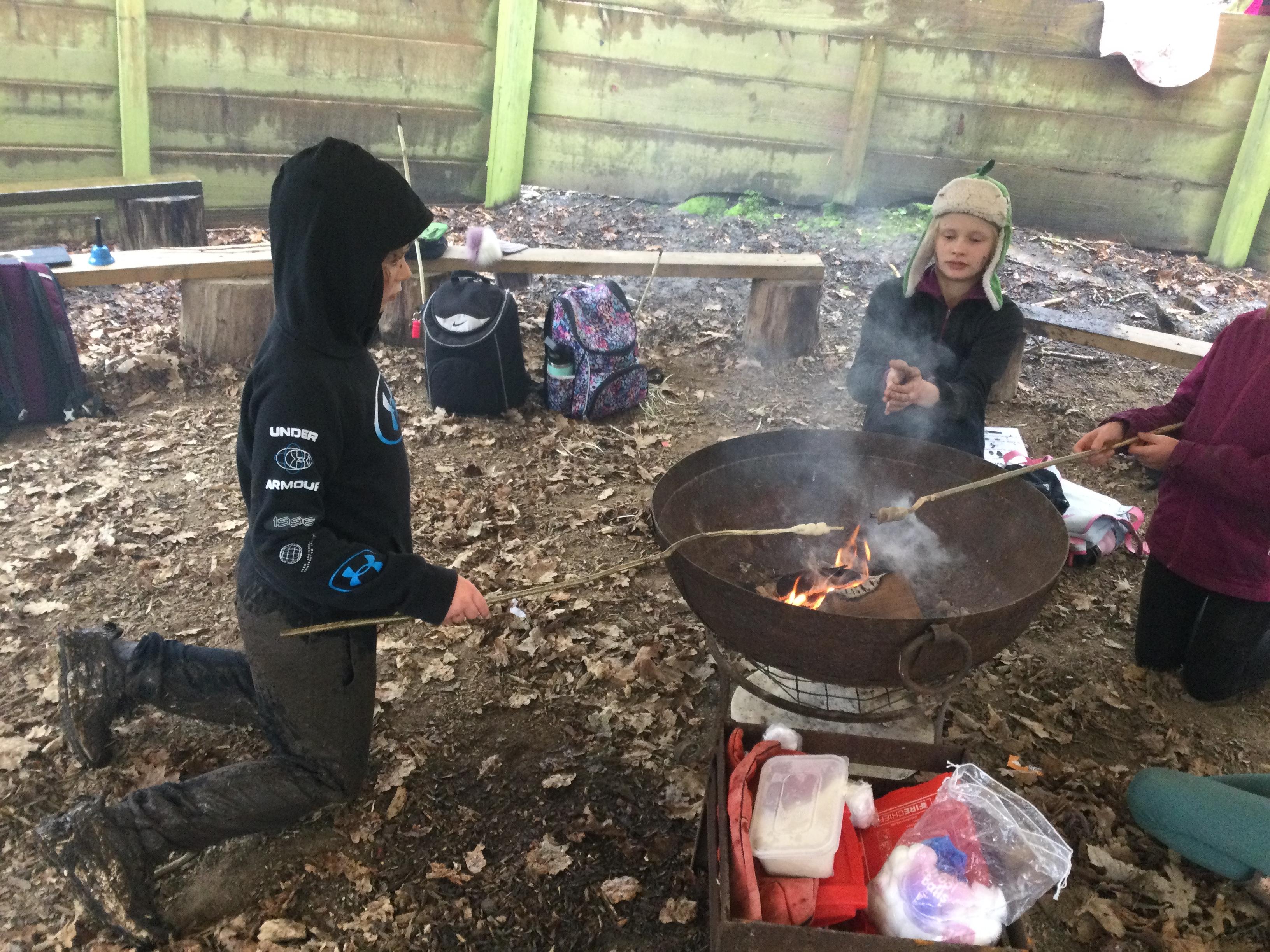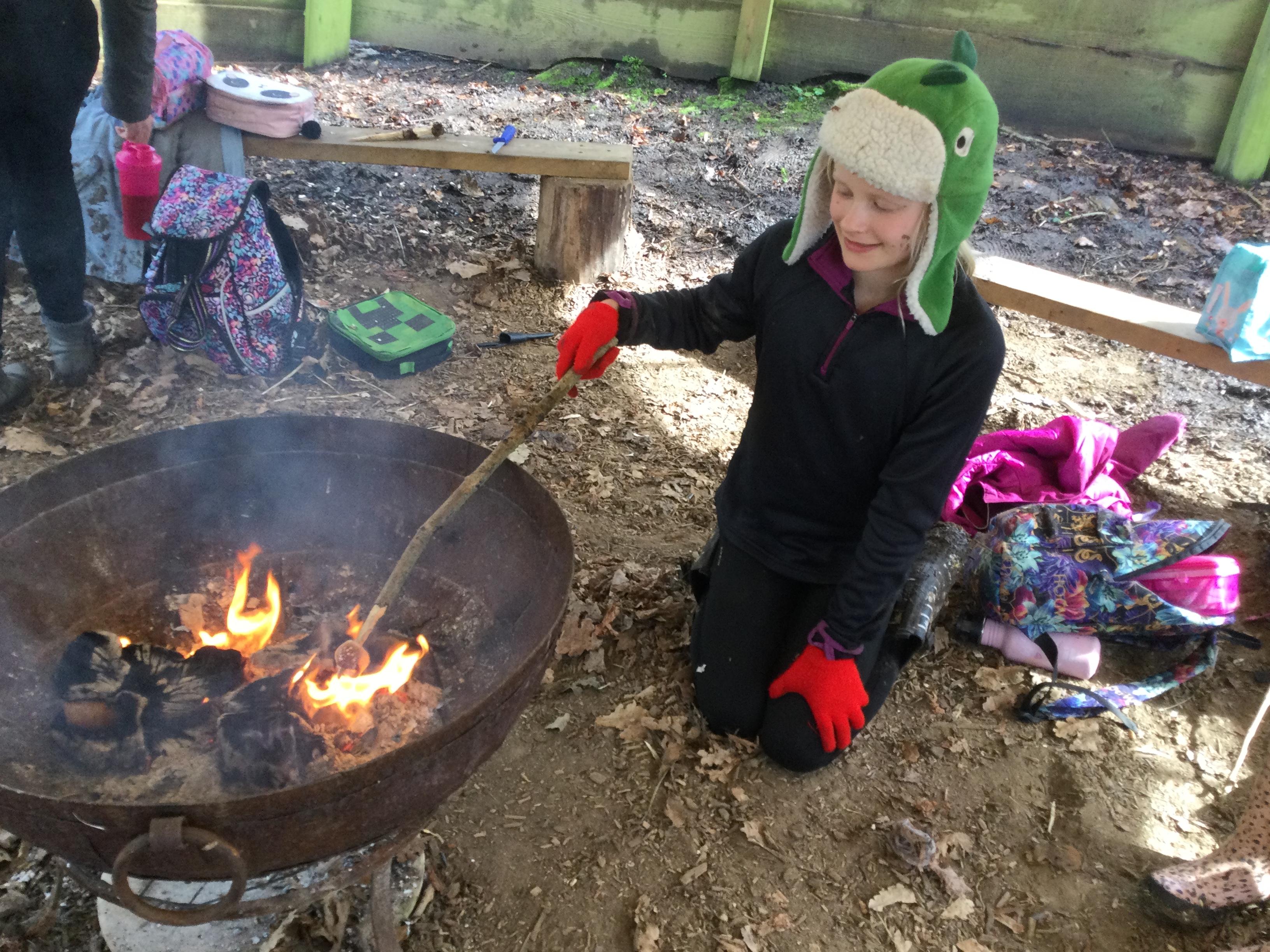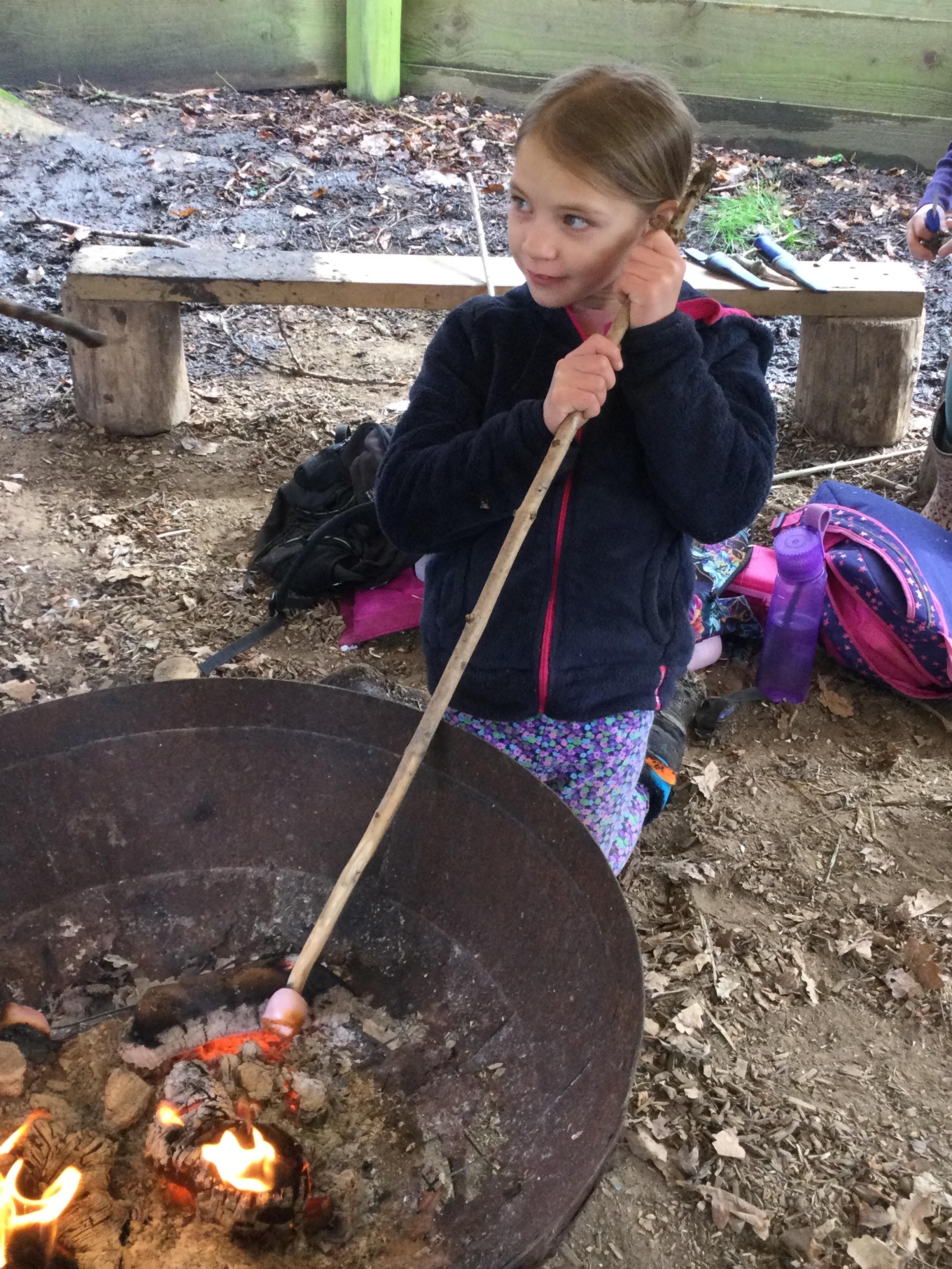 They warmed up by the fire and baked ash bread on sticks, which was delicious! They made their cooking sticks with potato peelers. Some children even made magic wands and tools using knives safely, which required a lot of focus.