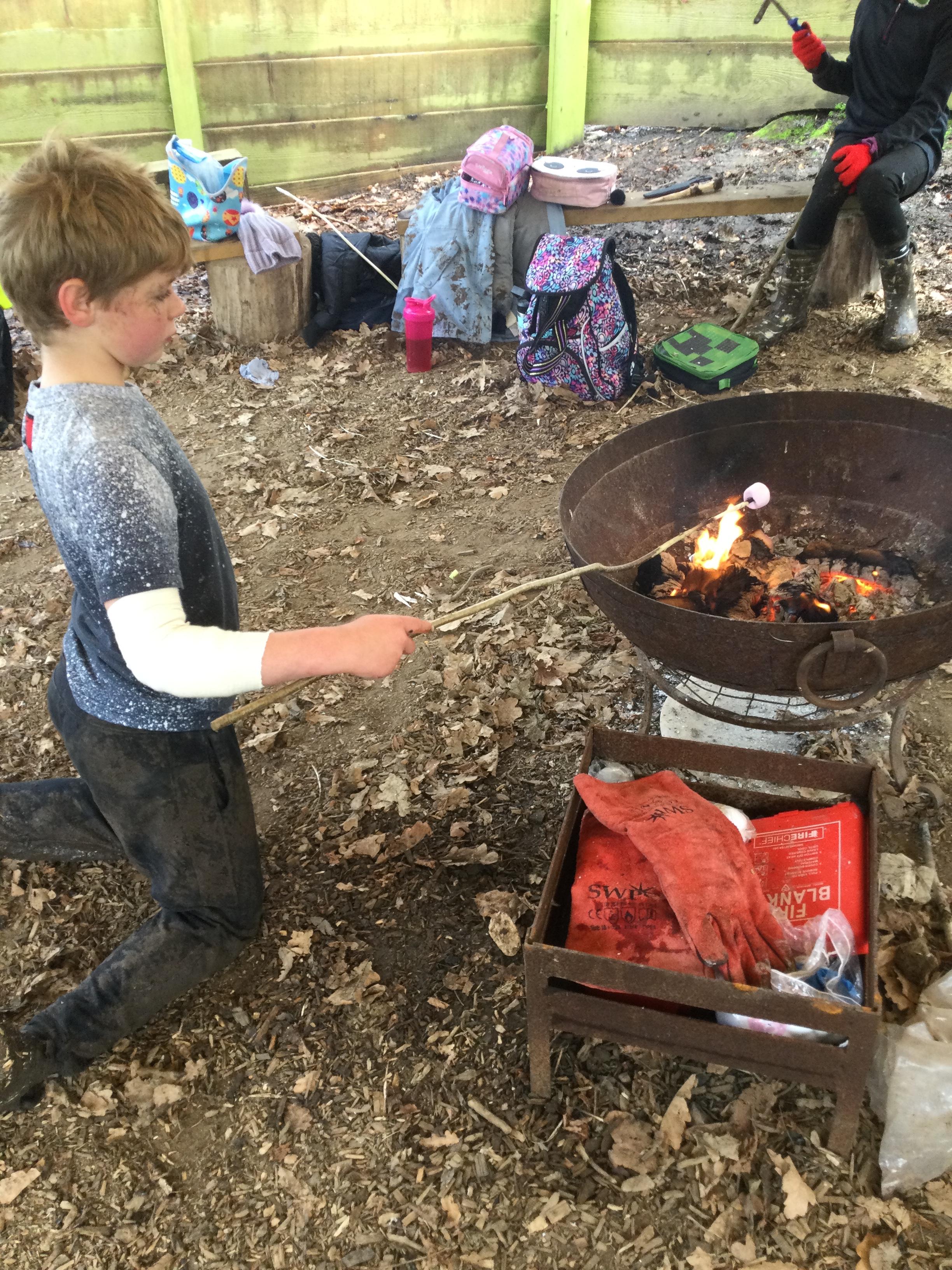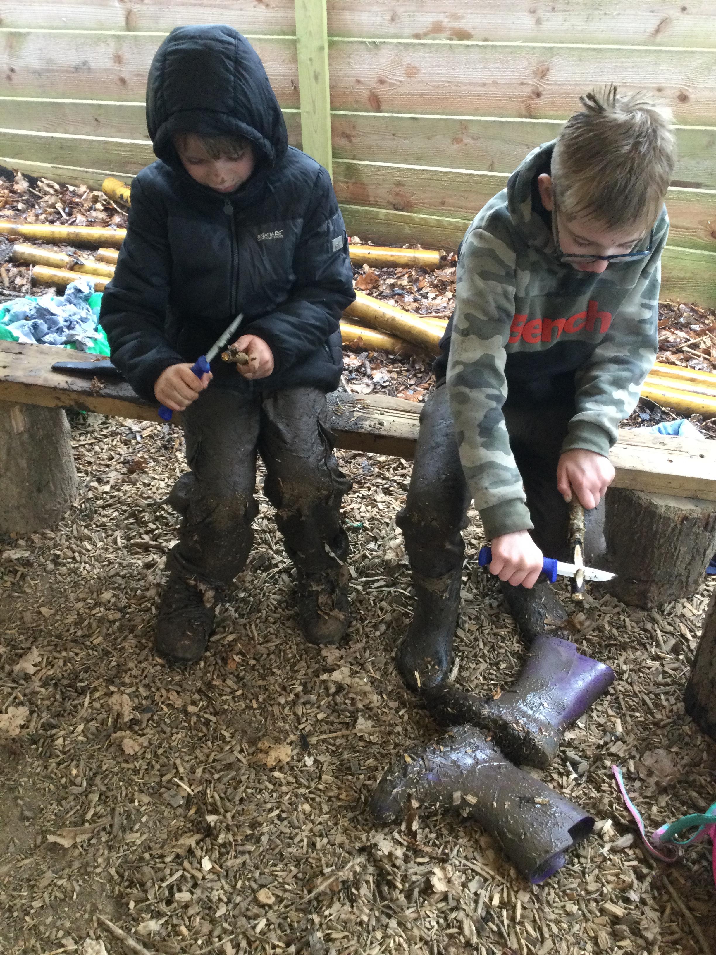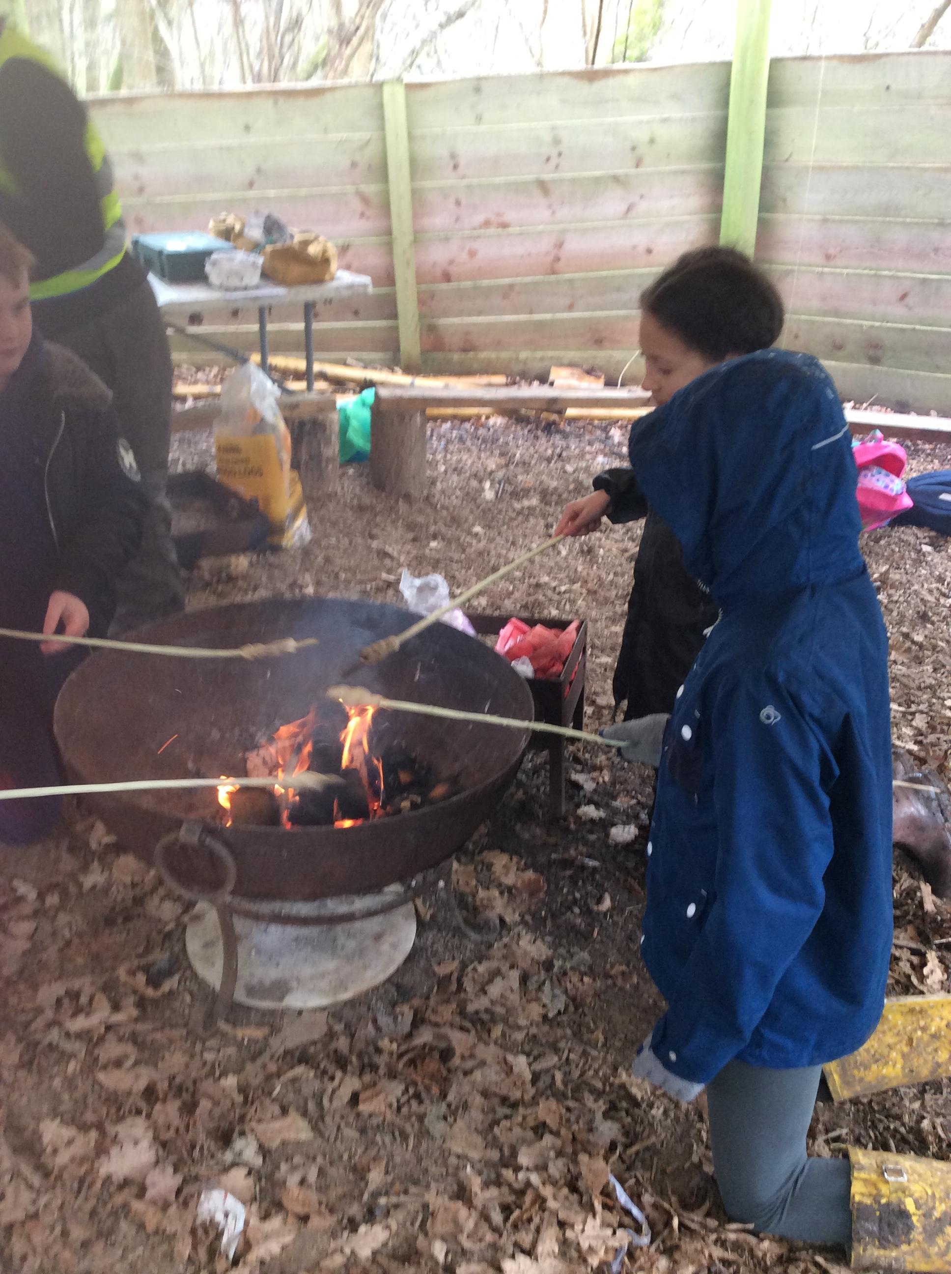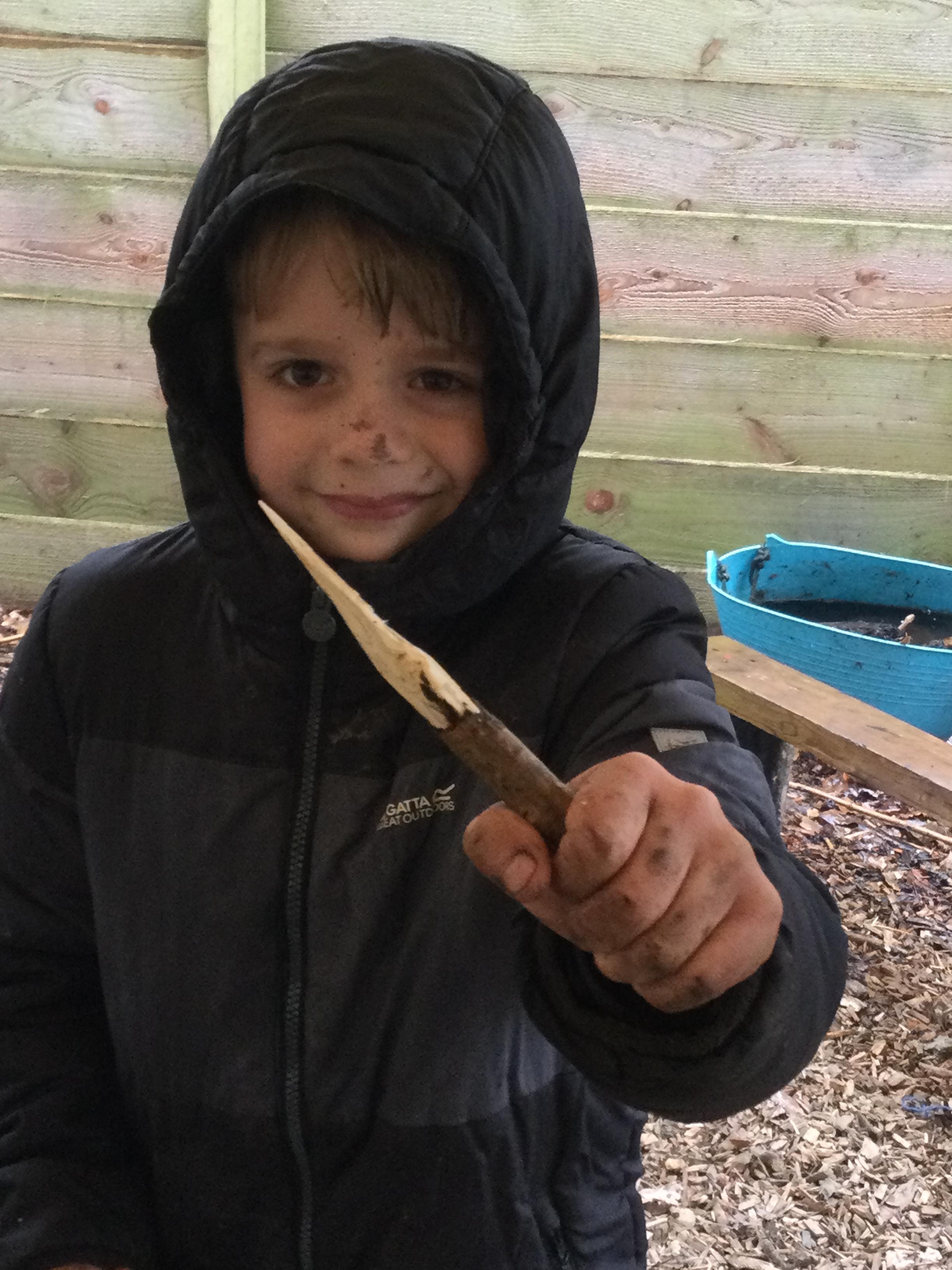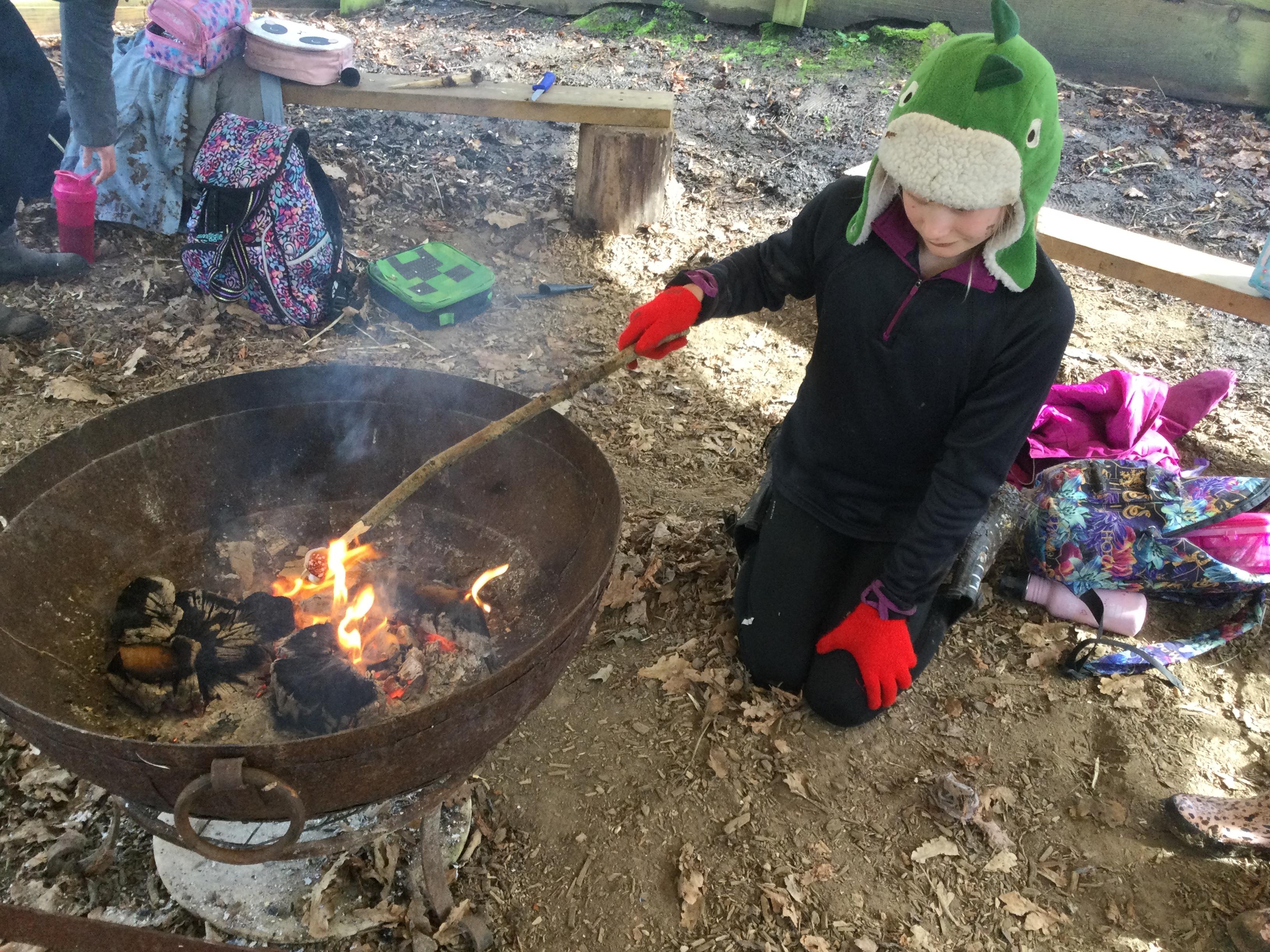 They warmed up by the fire and baked ash bread on sticks, which was delicious! They made their cooking sticks with potato peelers. Some children even made magic wands and tools using knives safely, which required a lot of focus.