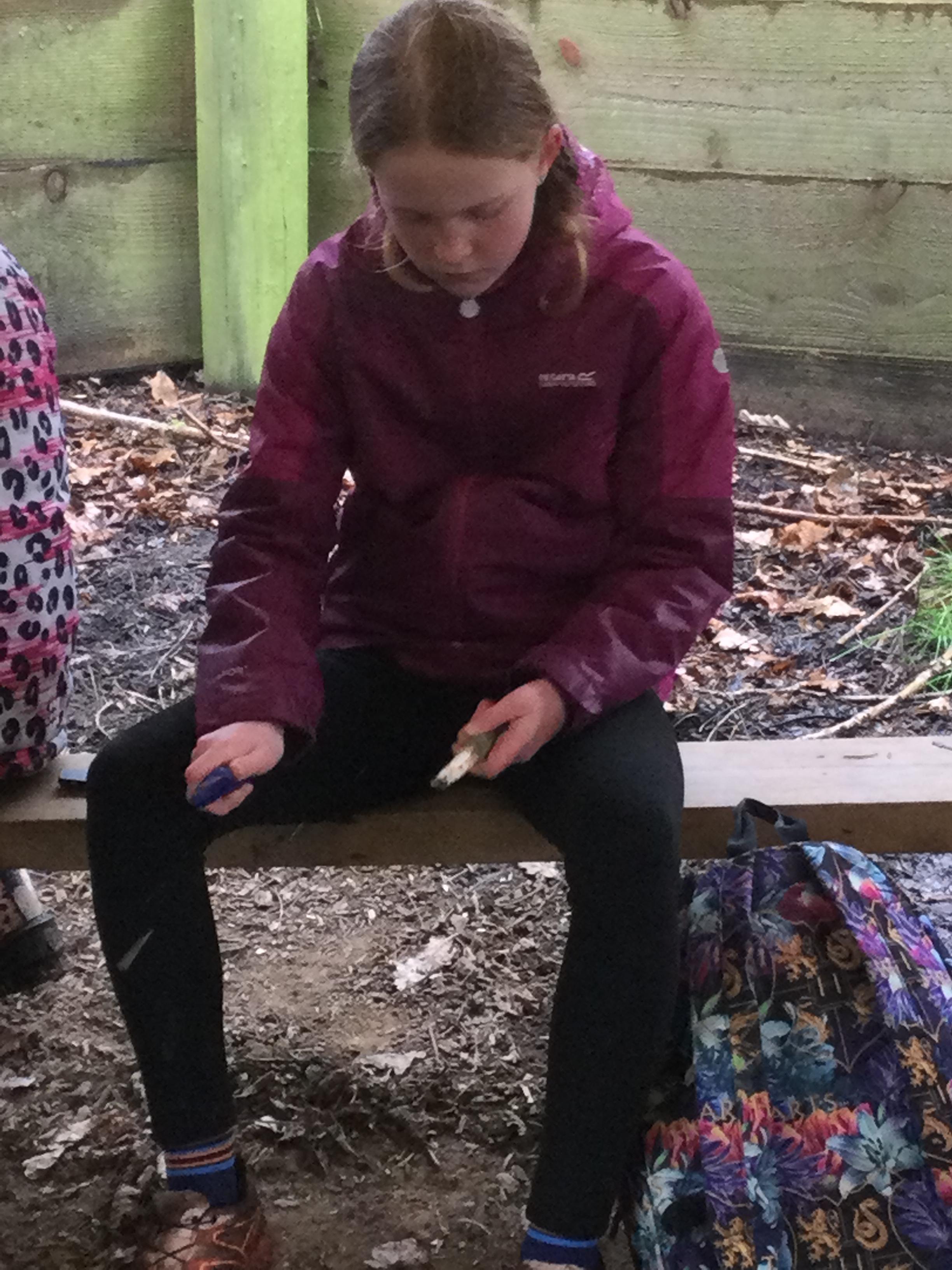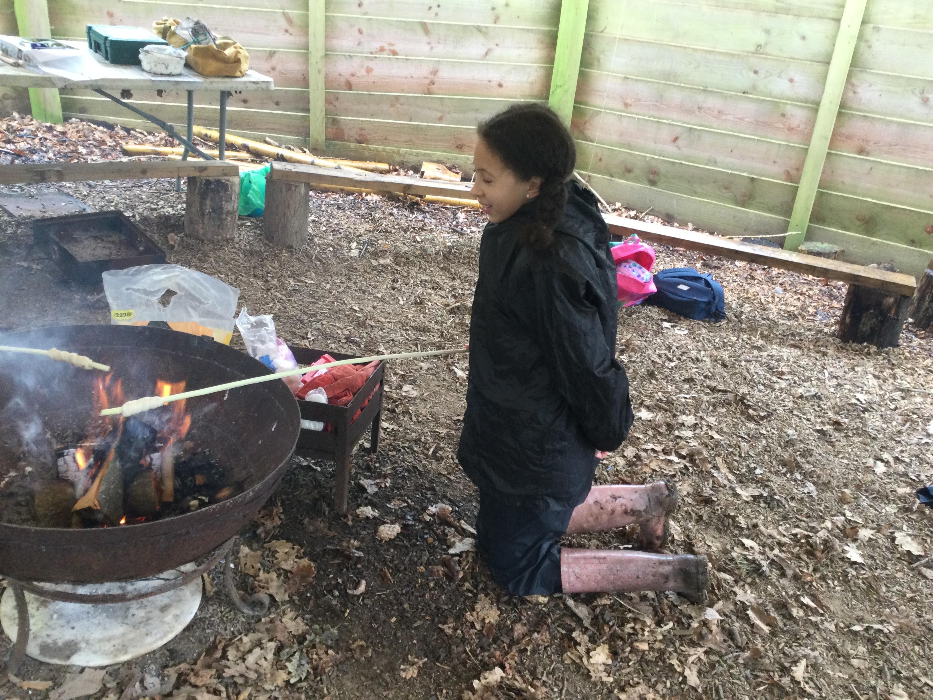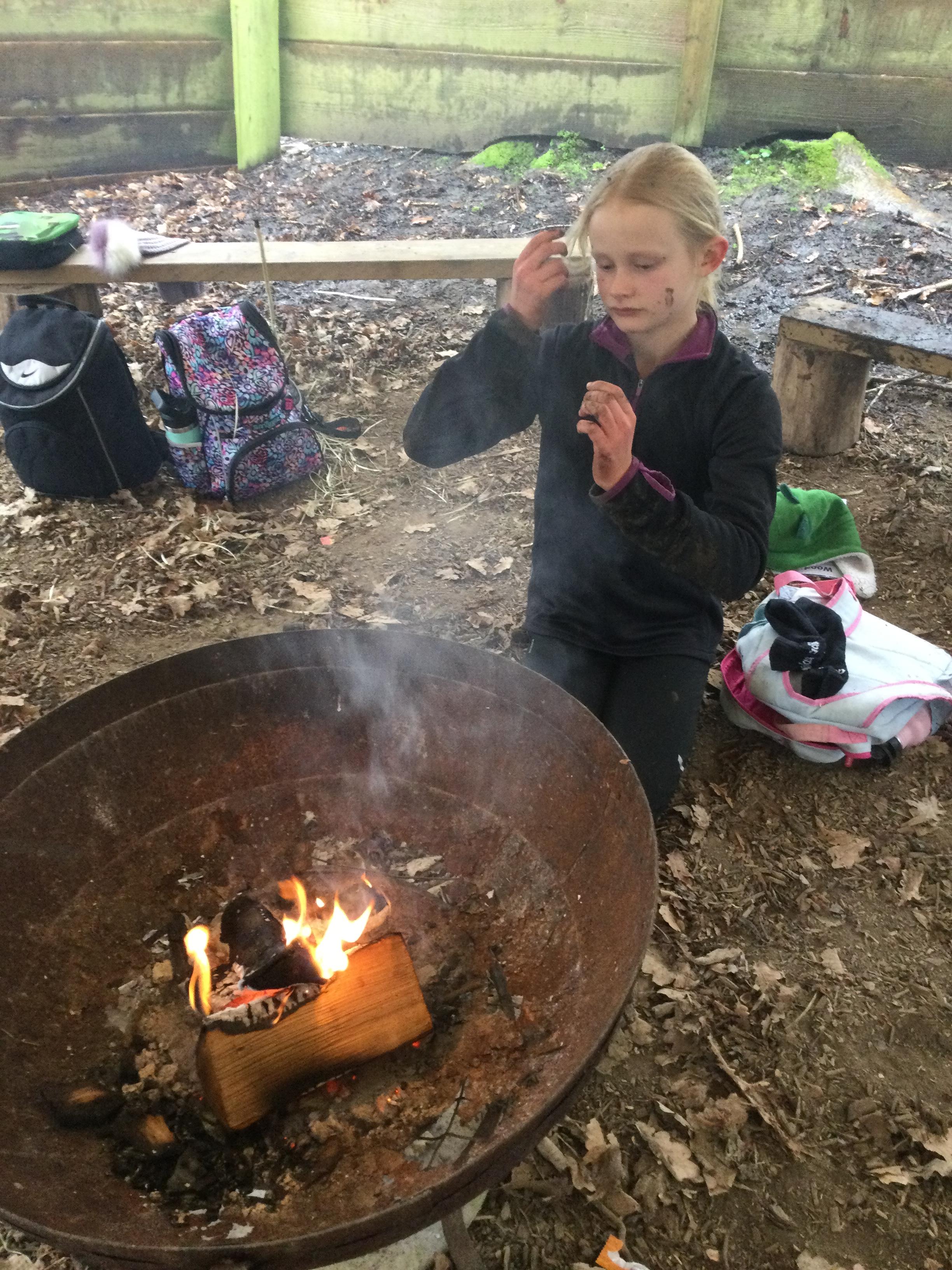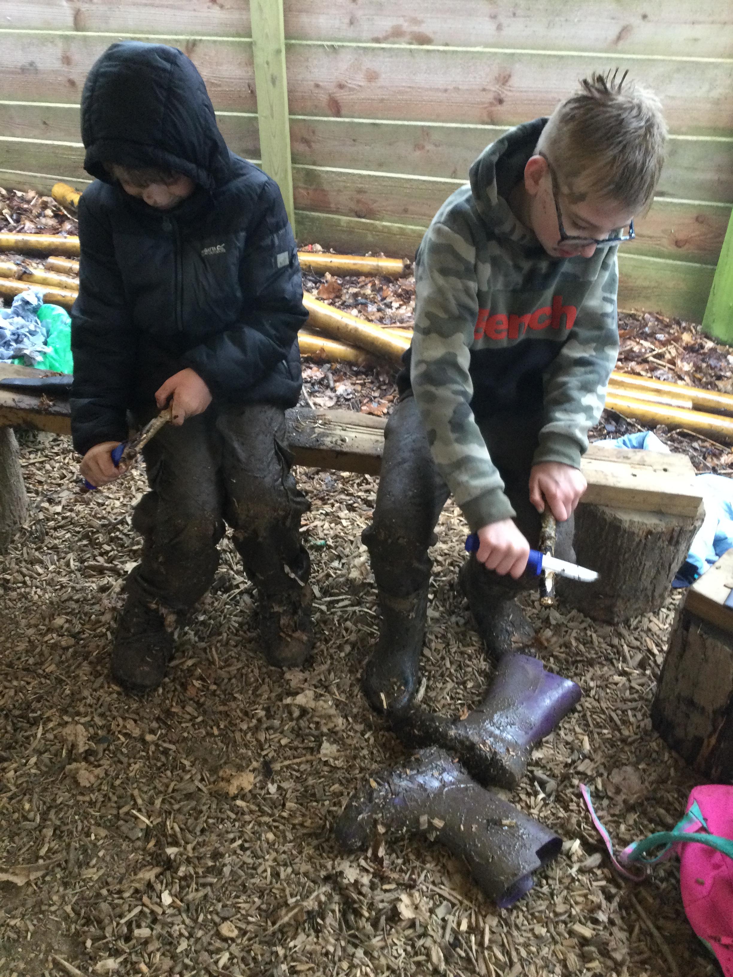 They warmed up by the fire and baked ash bread on sticks, which was delicious! They made their cooking sticks with potato peelers. Some children even made magic wands and tools using knives safely, which required a lot of focus.