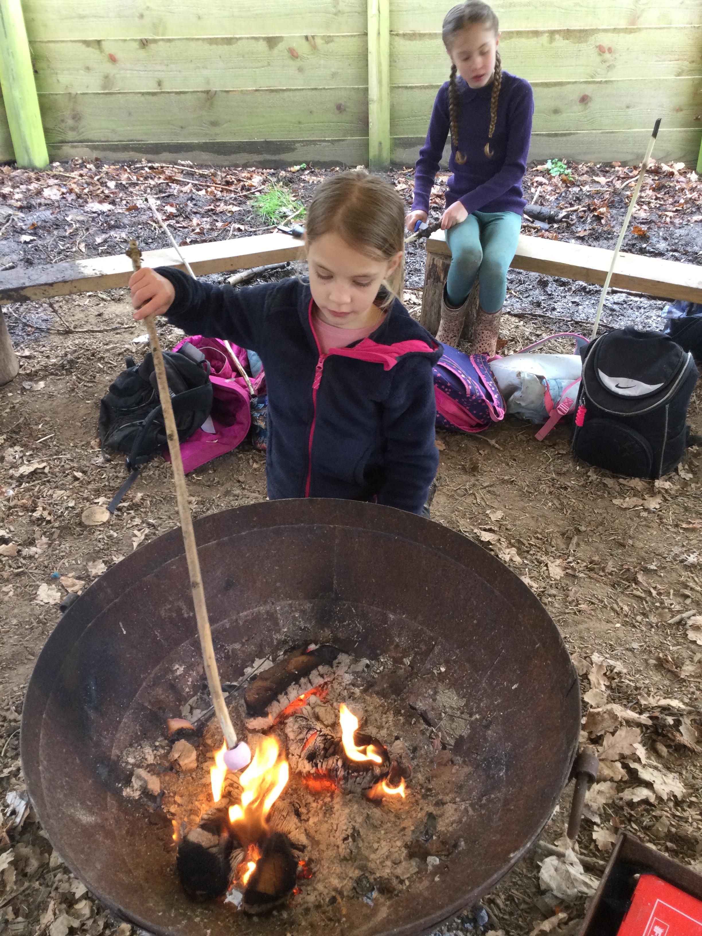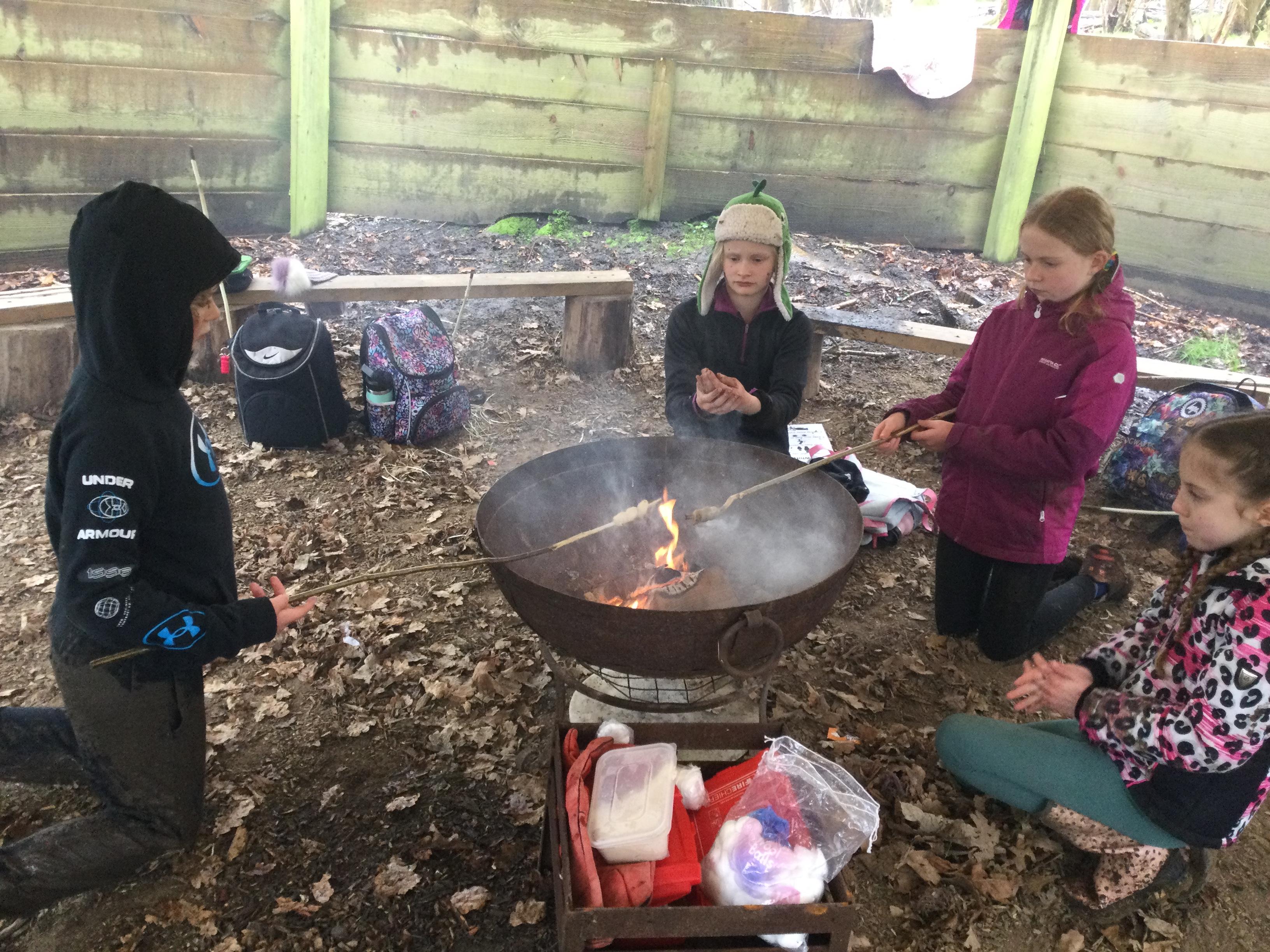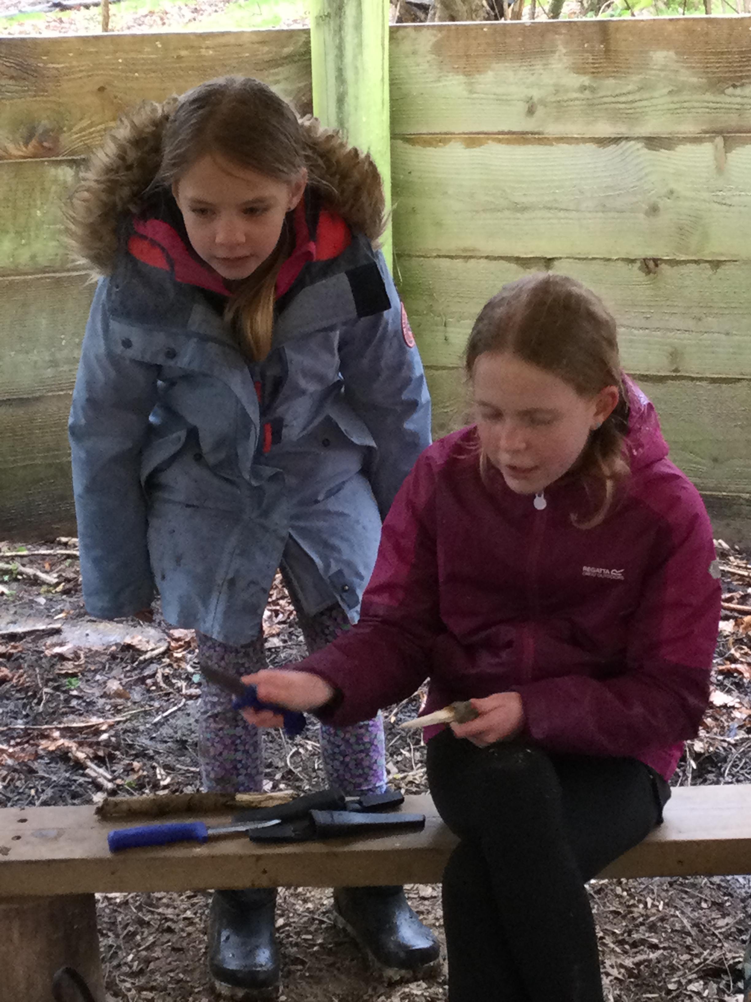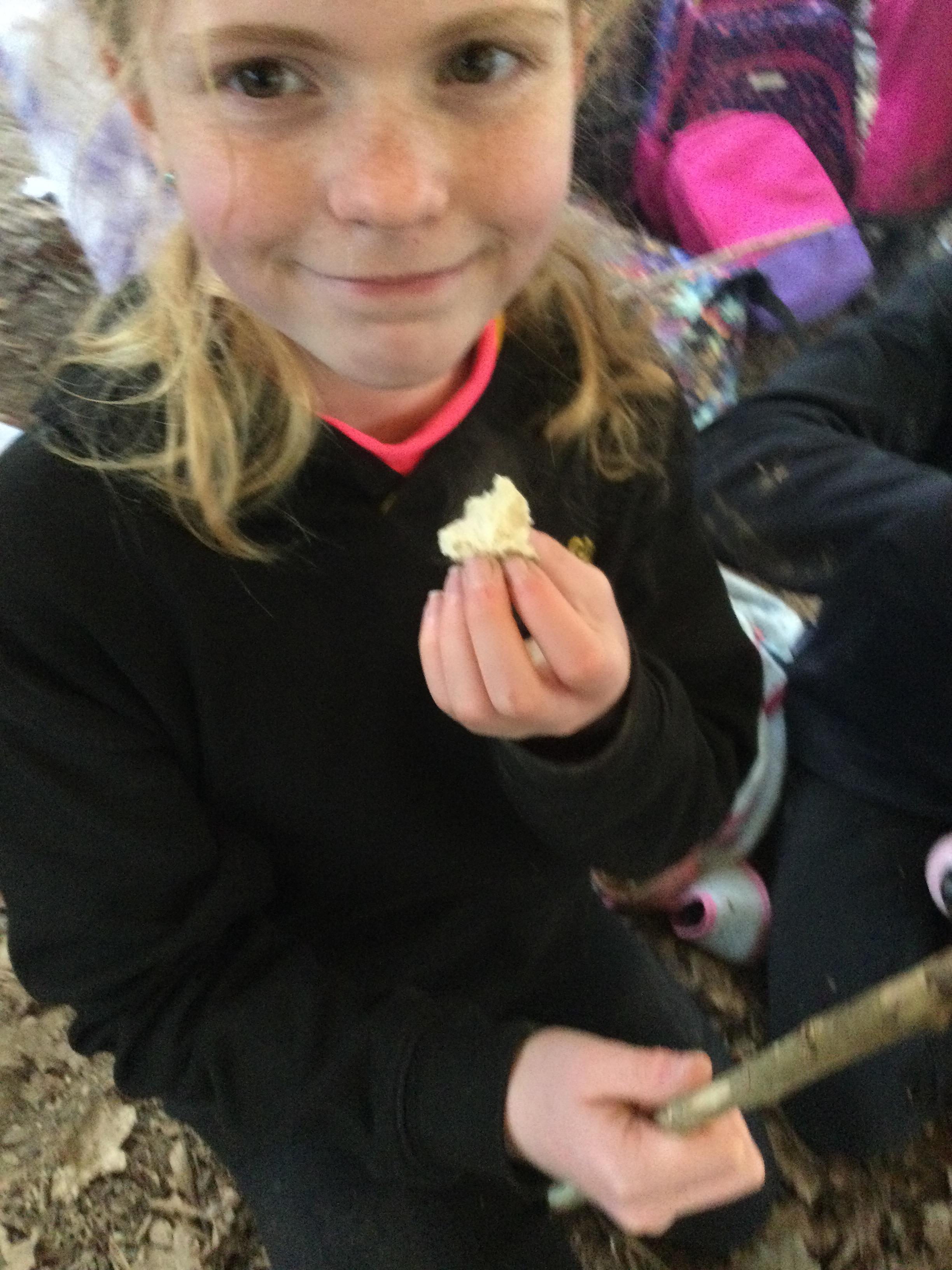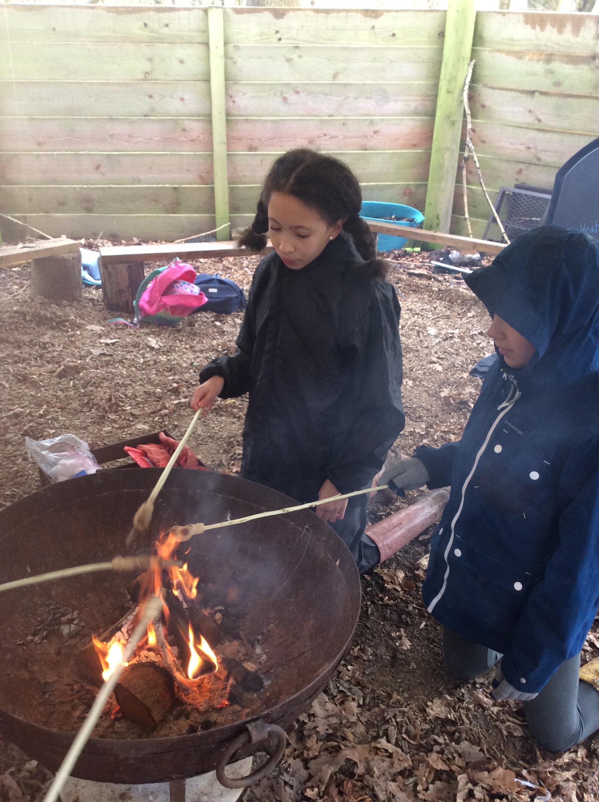 They warmed up by the fire and baked ash bread on sticks, which was delicious! They made their cooking sticks with potato peelers. Some children even made magic wands and tools using knives safely, which required a lot of focus.