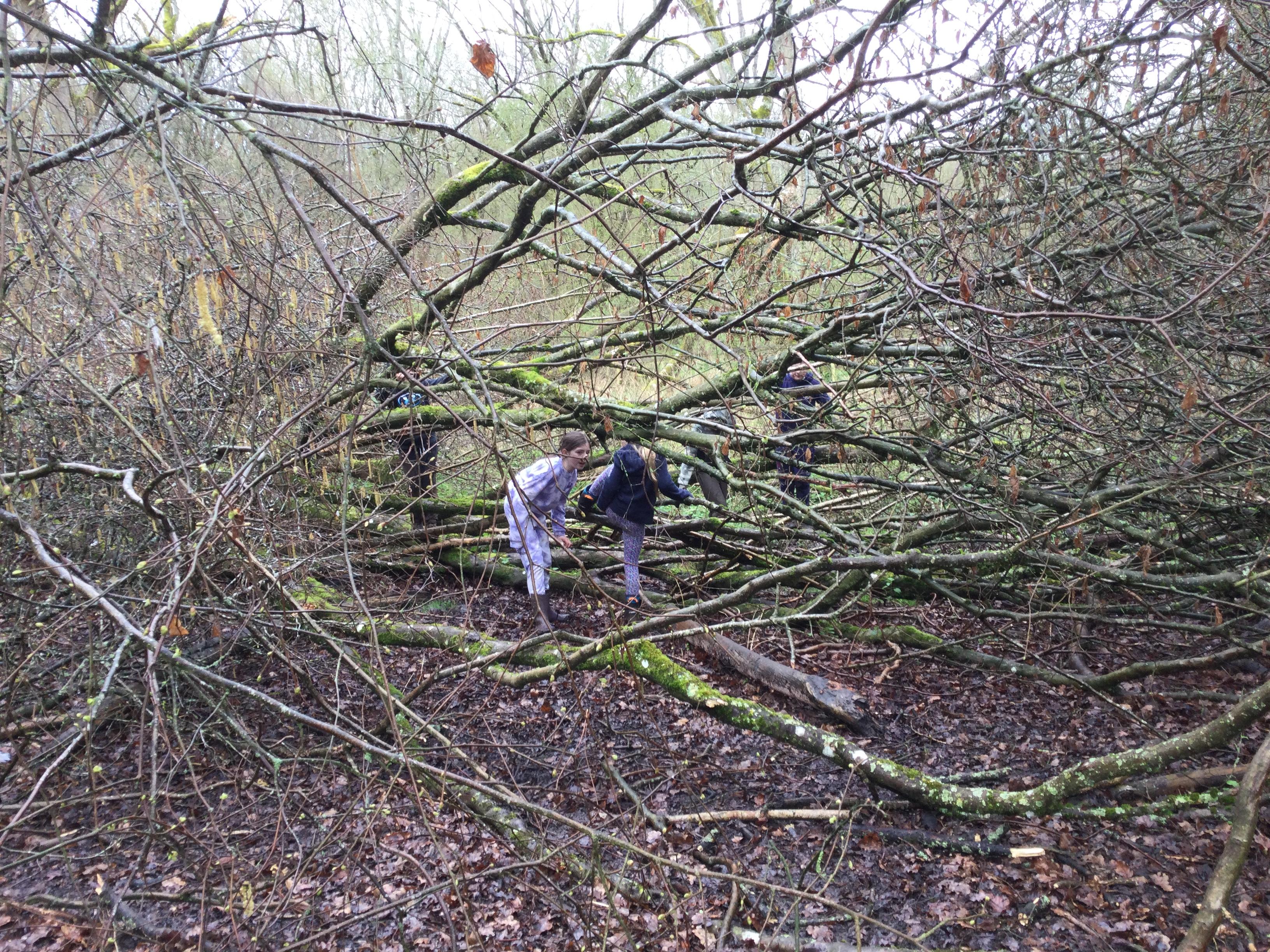 During lunch, the children organized a game of Chinese whispers all by themselves. It was so nice to see everyone naturally included. After lunch, they roasted marshmallows on the fire. Luckily, the rain stopped, so they could climb trees and play games like cops and robbers.