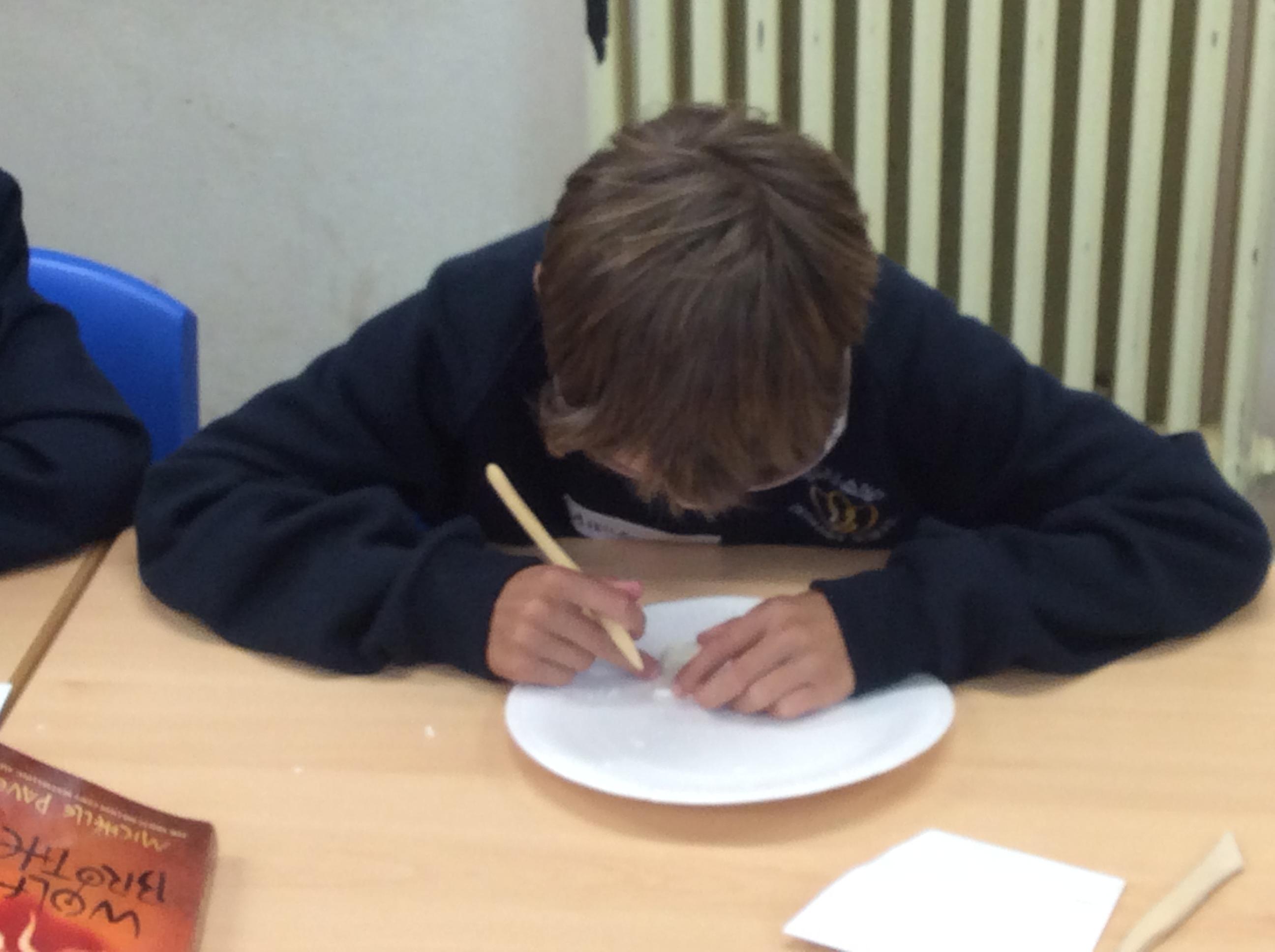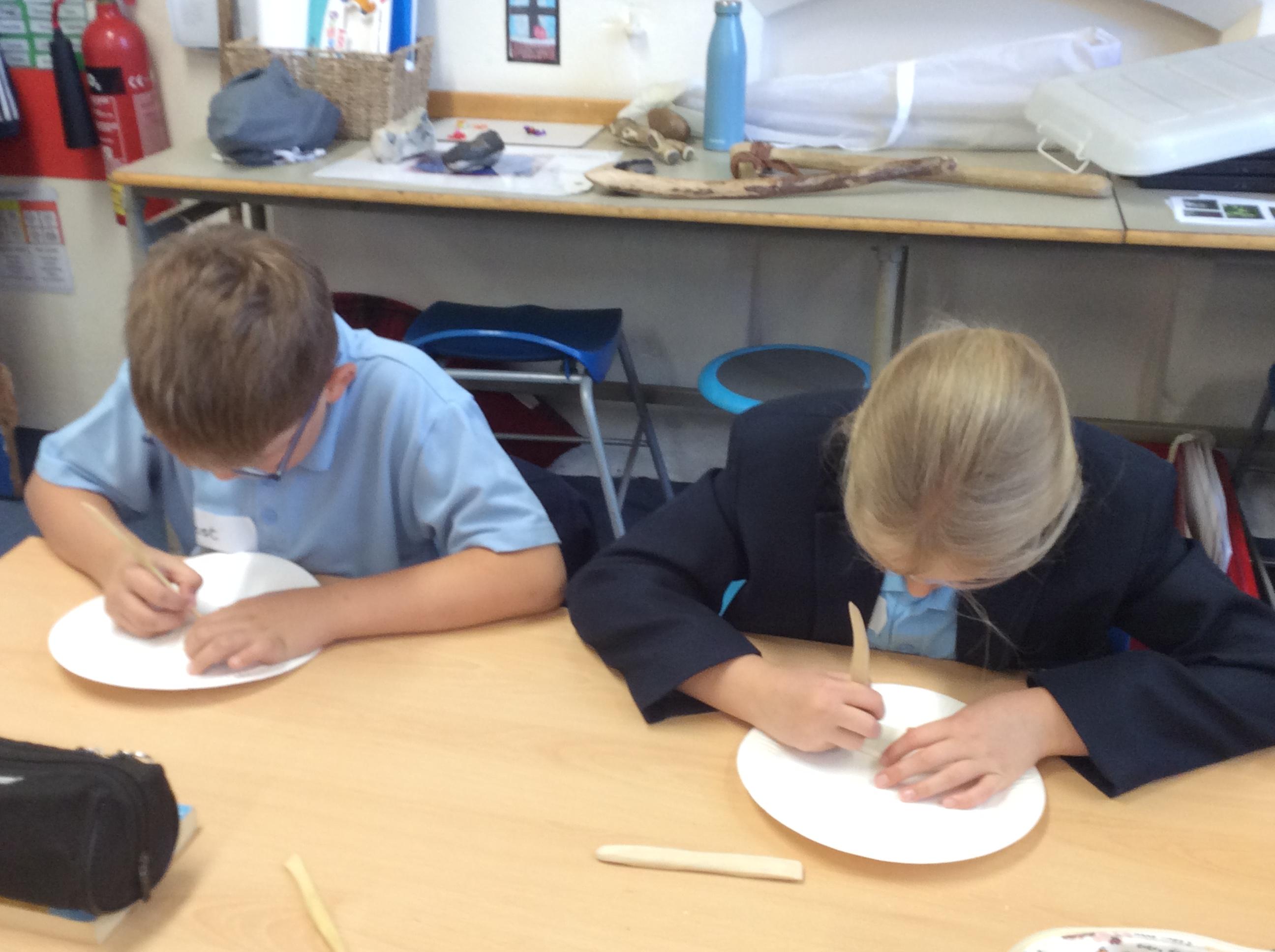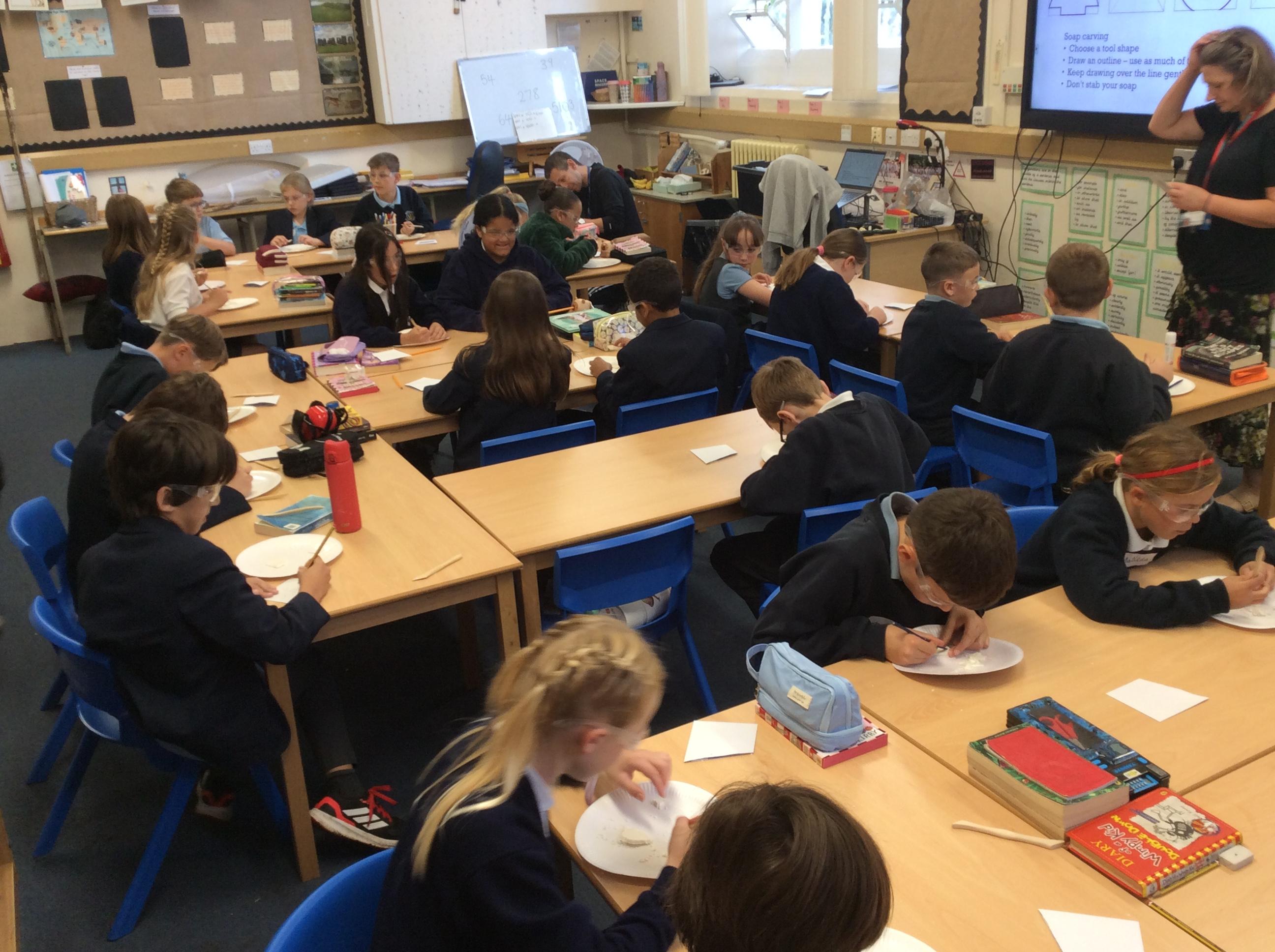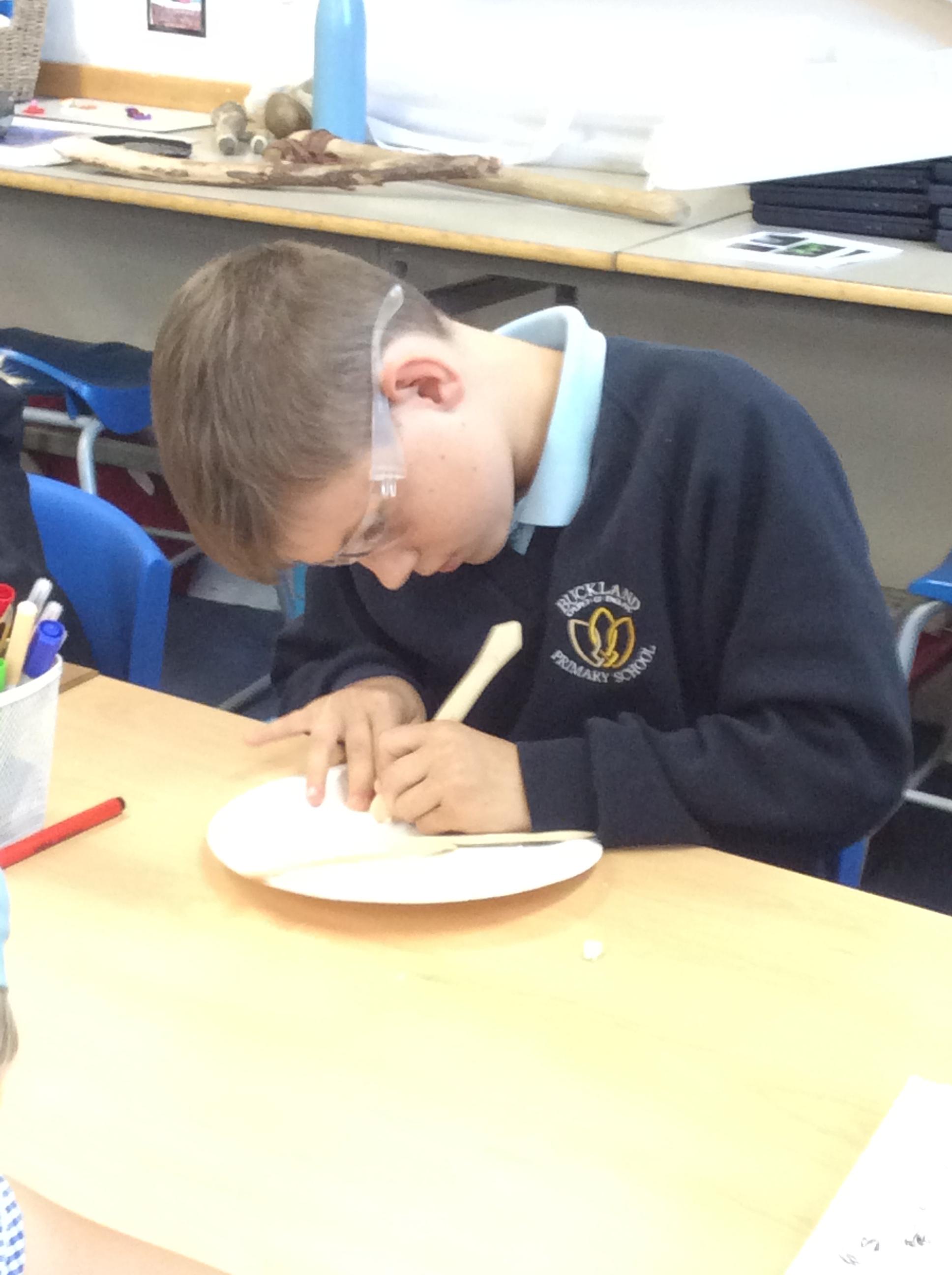 Back in class, Oak found out about the importance of flint knapping during this time and learnt what tools they would use to do it. The children were then given a piece of hard soap to have a go at knapping into a worked flint sharp…e.g. arrow head/scrapper.